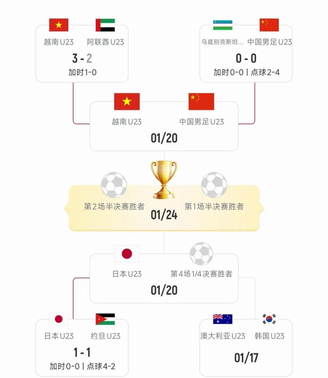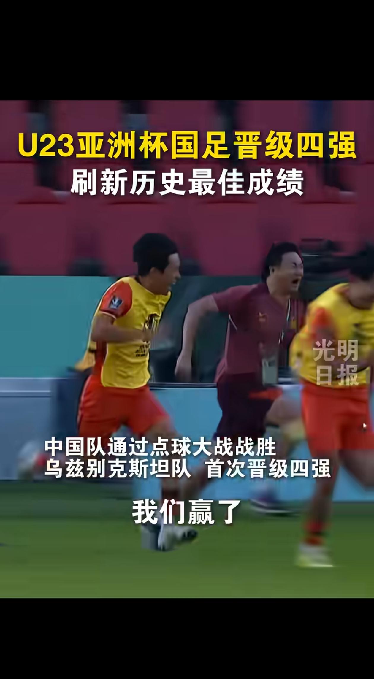 中国足球U23赢了!闯进亚洲杯半决赛,创造了历史(之前的最好纪录是闯进八强)。小伙子们走出国门在沙特比赛,在点球大战中以4:2战胜对手乌兹别克斯坦,晋级四强,不免惊险刺激。下一场对战全胜战绩的越南队,希望你们越战越勇,继续创造奇迹。