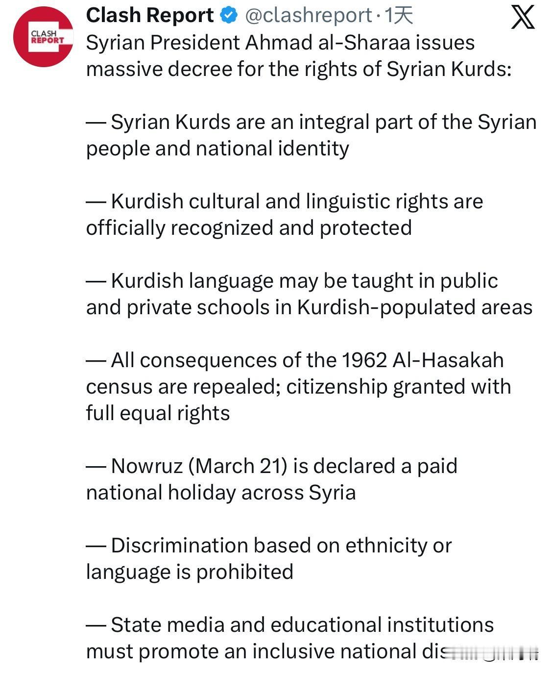 2026年1月16日,叙利亚过渡政府总统艾哈迈德·沙拉(Ahmed al-Sharaa)签署了第13号总统令。这是一项具有历史意义的法令,旨在通过法律形式保障叙利亚库尔德人的各项权利,被视为叙利亚内战后实现民族和解的关键一步。 该法令的核心内容包括: 官方语言地位:正式将库尔德语列为叙利亚的国家语言之一(与阿拉伯语并列),并允许在库尔德人聚居区的公立学校进行教学。 恢复公民身份:废除了1962年哈塞克省人口普查遗留的不公正措施,决定为所有曾被剥夺国籍的库尔德人恢复叙利亚公民身份,解决长期存在的无国籍问题。 民族认同承认:明确叙利亚库尔德公民是“叙利亚人民不可分割的组成部分”,其文化和语言认同是叙利亚多元民族认同的重要组成部分。 法定假日:将库尔德传统新年诺鲁孜节(Nowruz)定为国家法定带薪节假日。 禁止歧视:严禁任何基于种族或语言的歧视行为,并对煽动民族仇恨的行为规定了惩罚措施。 背景: 该法令是在叙利亚政府军与库尔德武装在阿勒颇等地发生激烈冲突后发布的,旨在缓和紧张局势并争取库尔德群体的支持。尽管法令在文化和公民权方面做出了重大让步,但目前尚未涉及库尔德人要求的“政治自治”或权力分享等核心政治诉求。