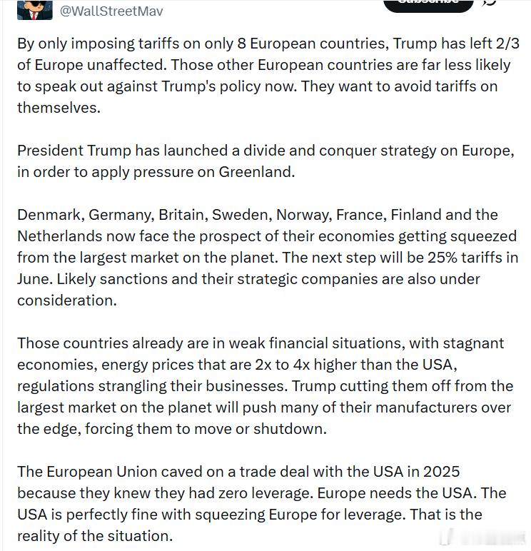 通过只对8个欧洲国家征收关税,特朗普实际上让三分之二的欧洲国家不受影响。而那些其他欧洲国家,现在更不可能公开反对特朗普的政策——因为它们不想让自己也受到关税影响。特朗普总统对欧洲启动了一项分而治之的策略,目的是向格陵兰施加压力。丹麦、德国、英国、瑞典、挪威、法国、芬兰和荷兰如今面临来自全球最大市场的经济挤压。下一步将在6月实施25%的关税。同时,也有可能会对它们采取制裁,其战略性企业也在考虑范围内。这些国家本身经济状况已经很脆弱,经济停滞不前,能源价格比美国高出2到4倍,繁琐的法规扼制着企业发展。特朗普将它们与全球最大市场切断联系,将迫使许多制造商面临倒闭或搬迁的境地。欧盟在2025年向美国的贸易协议中让步,因为他们明白自己没有任何谈判筹码。欧洲需要美国,而美国完全可以通过施压欧洲来获取筹码——这就是现实情况。