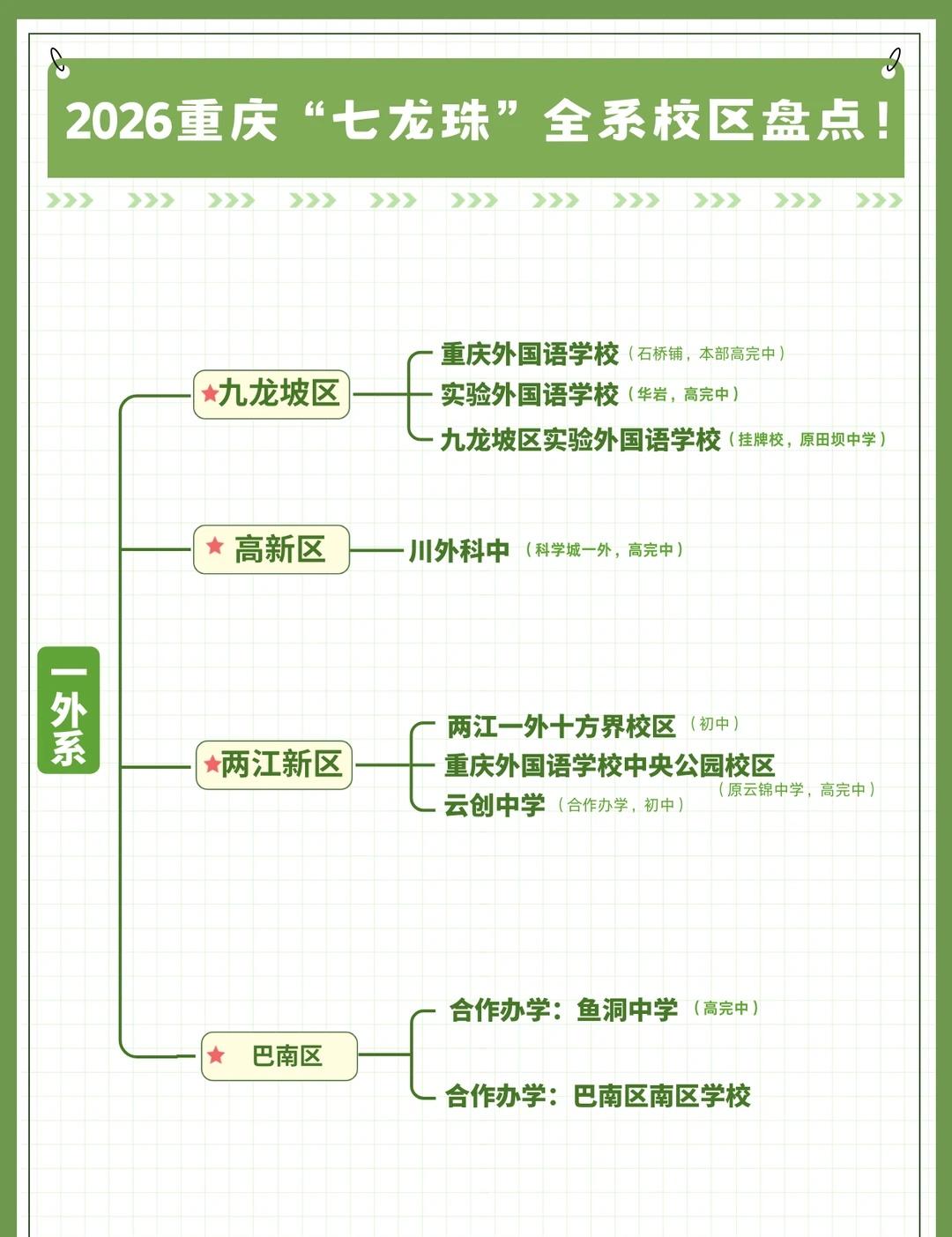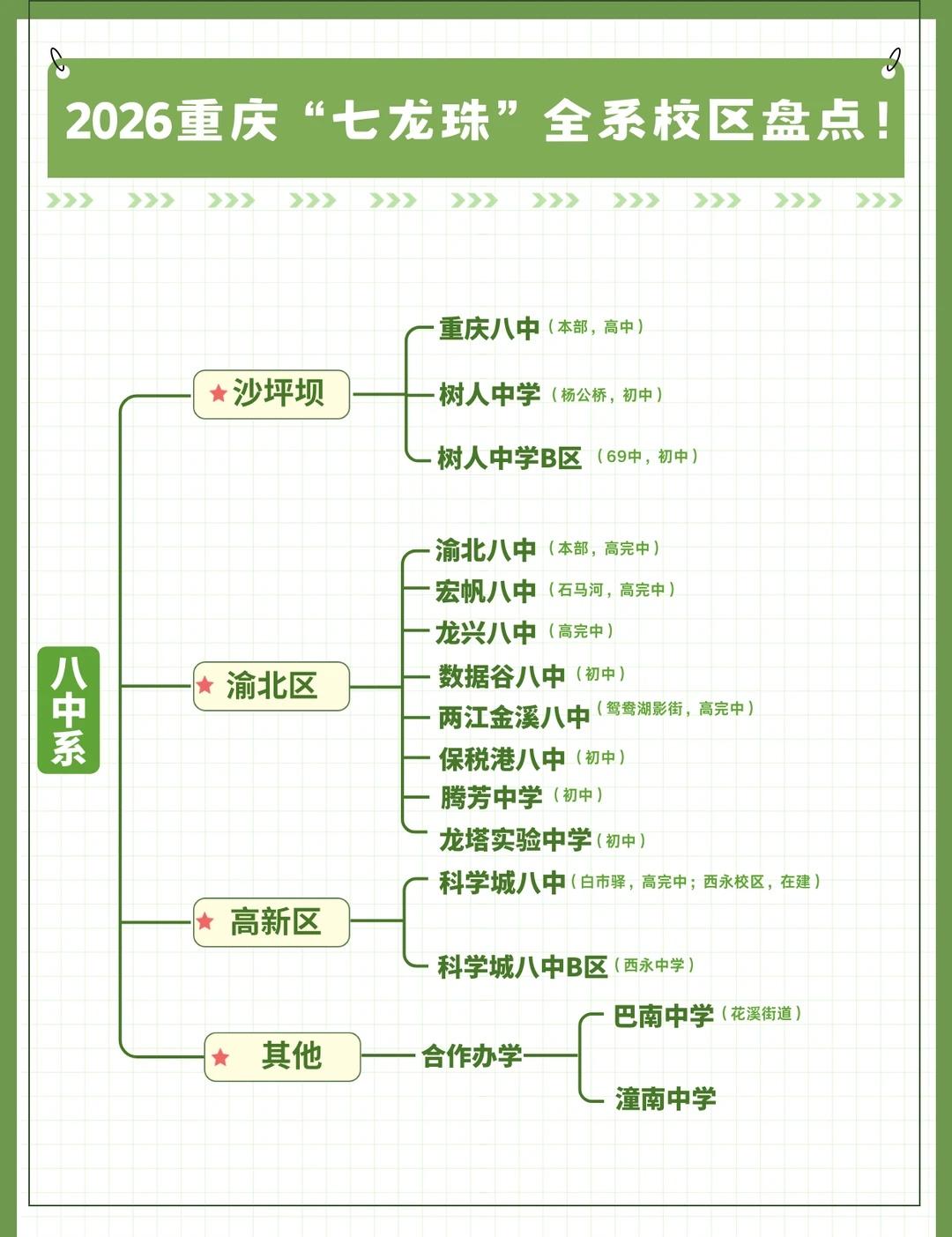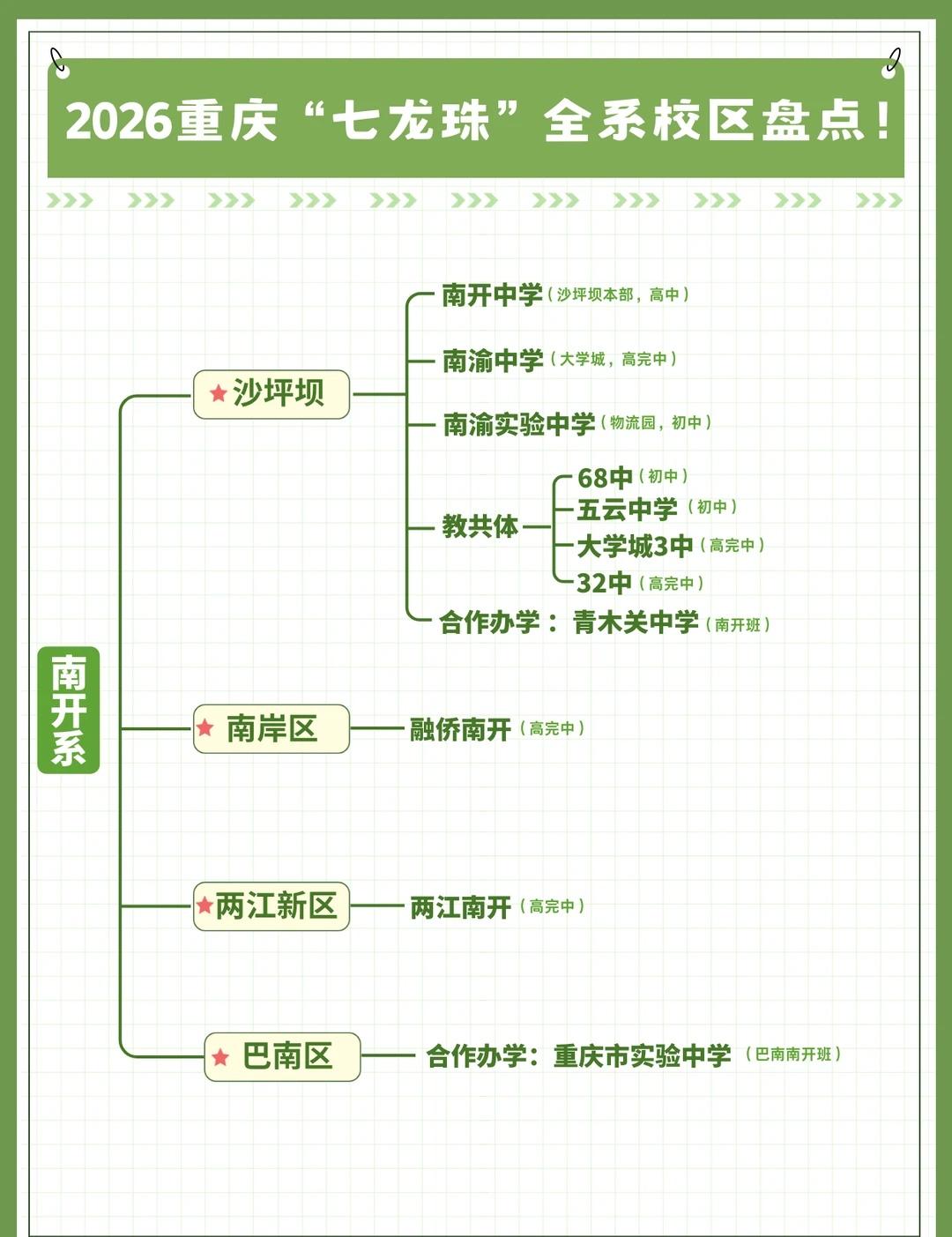 重庆“七龙珠”校区全梳理💎收藏备用 2026重庆“七龙珠”中学集团最新盘点来啦!✅ . 一中、南开、八中、巴蜀、西附、育才、一外——七大教育集团覆盖全城,新校区持续扩张中! . 📍 一中系:沙坪坝本部+两江、高新区多校区 📍 南开系:沙南岸、两江、巴南均有布局 📍 八中系:渝北成为主力,科学城校区在建 📍 巴蜀系:两江新区猛扩,星湖中学2026开学 📍 西附系:北碚+两江+大渡口,跨区联动 📍 育才系:九龙坡为核心,集团化办学明显 📍 一外系:九龙坡、两江、高新区均有落地 . 不少新校区2026-2027年陆续启用,家长朋友们可以提前关注啦!👀 重庆七龙珠 重庆中学 教育规划 2026入学