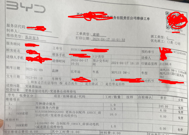 宋plusdmi110变速箱漏油维修后续 更换了前驱动电机+变速器总成。多亏保养时候发现了,底部的护板和隔音棉上全是油,拆下护板后变速箱下面正在滴油,大家觉得这有安全隐患吗?将来换车还会考虑比亚迪吗?