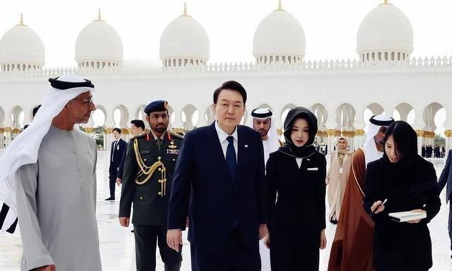 当年阿联酋总统访韩,金建希黑巾包头,皮肤白皙的她好可爱。