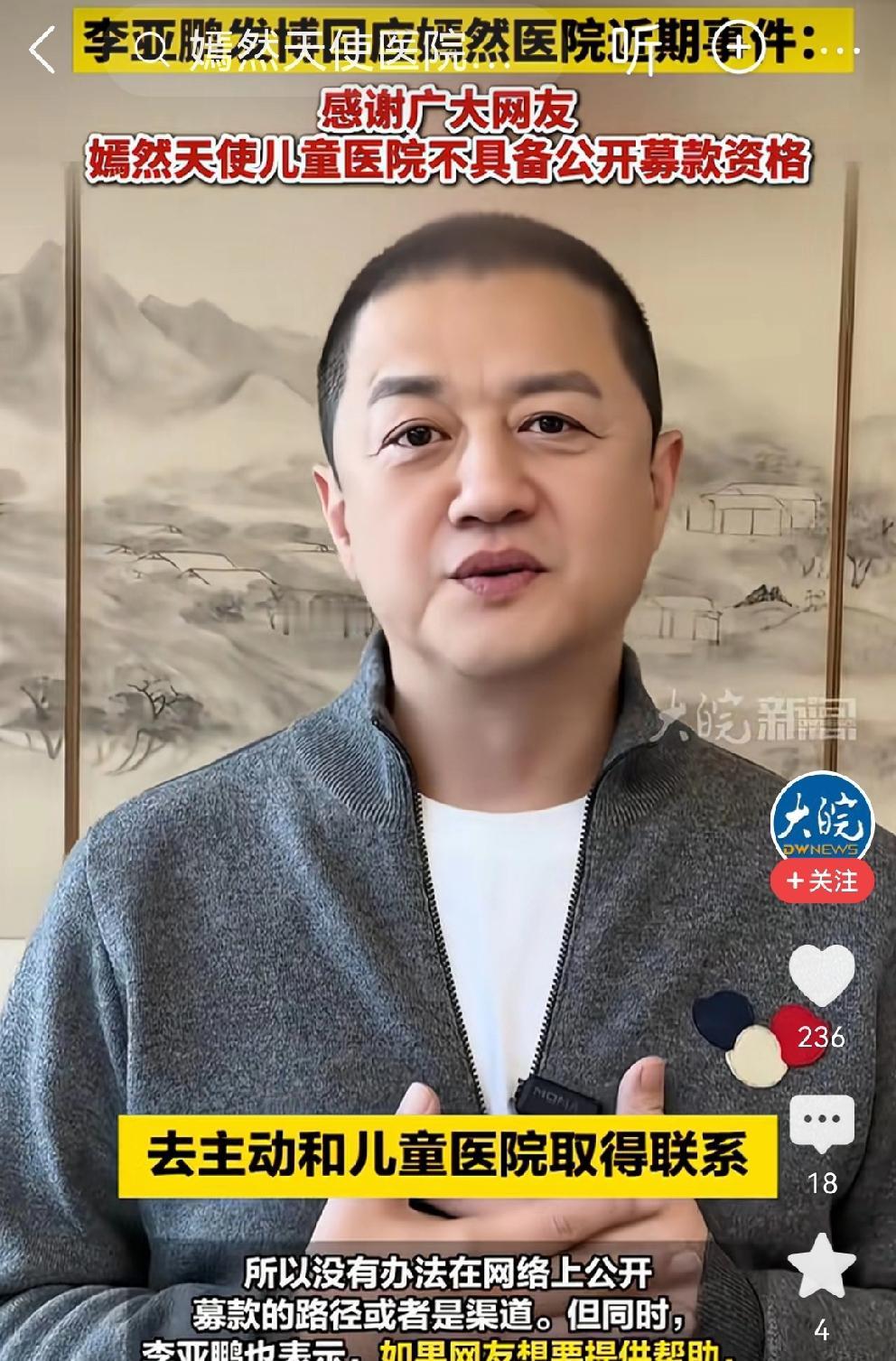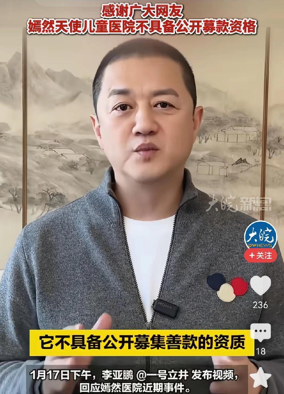 网友捐款1400万元,李亚鹏致谢 看到李亚鹏致谢的视频,李亚鹏字字句句都是真诚与真情! 嫣然天使儿童医院,成立14年,一直在造福家庭困难的唇腭裂患儿!11000台唇腭裂手术,7000台一分钱没收。 很多人不喜欢李亚鹏,做生意屡败屡战。在商场上摸爬滚打,不够“精明”。 但是,李亚鹏无论是做公益,还是做直播,都是“纯粹”的。 网友们纷纷捐款,为了爱,也是冲着李亚鹏做公益的初心纯粹而去的。 一个人做点好事并不难,难的是十几年如一日的做好事! 为李亚鹏点赞👍希望嫣然天使儿童医院能够度过难关。[祈祷]