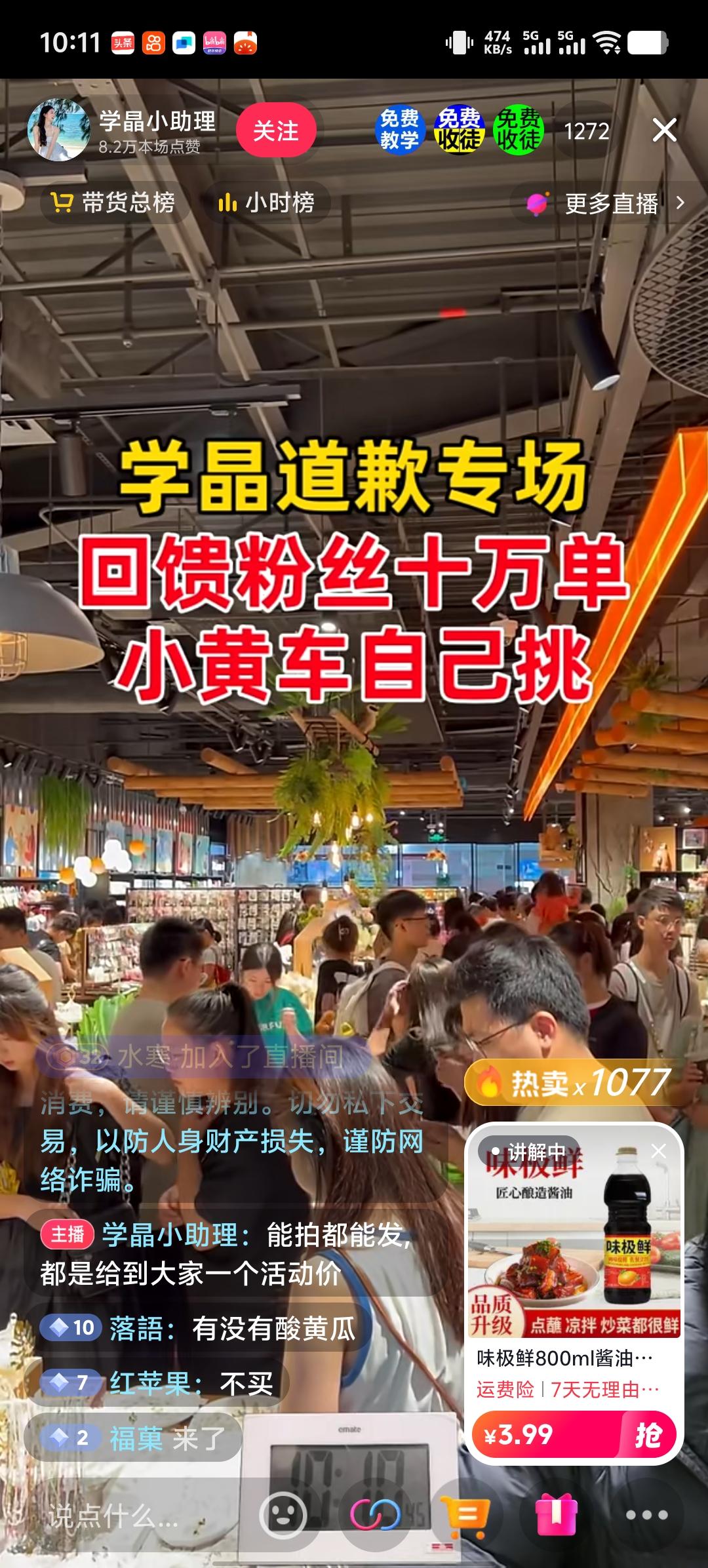 闫学晶真的是挣钱有方啊! 一个闫学晶小助理的账号开直播了, 上面写着学晶道歉专场,回馈粉丝十万单,小黄车自己挑。 我点进去看售卖的都是几块钱的东西, 但销量竟达到了几千, 看来还是有人会买闫学晶的东西, 闫学晶再怎么落魄也是会比普通人过的好。
