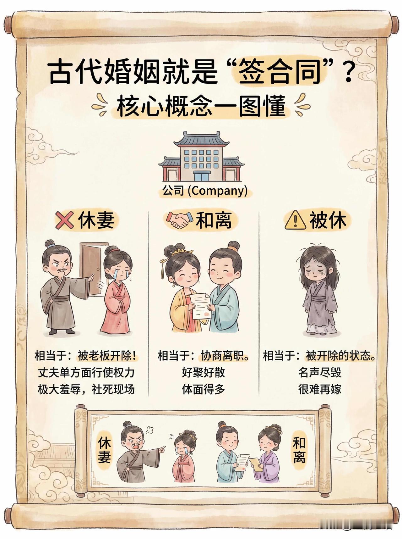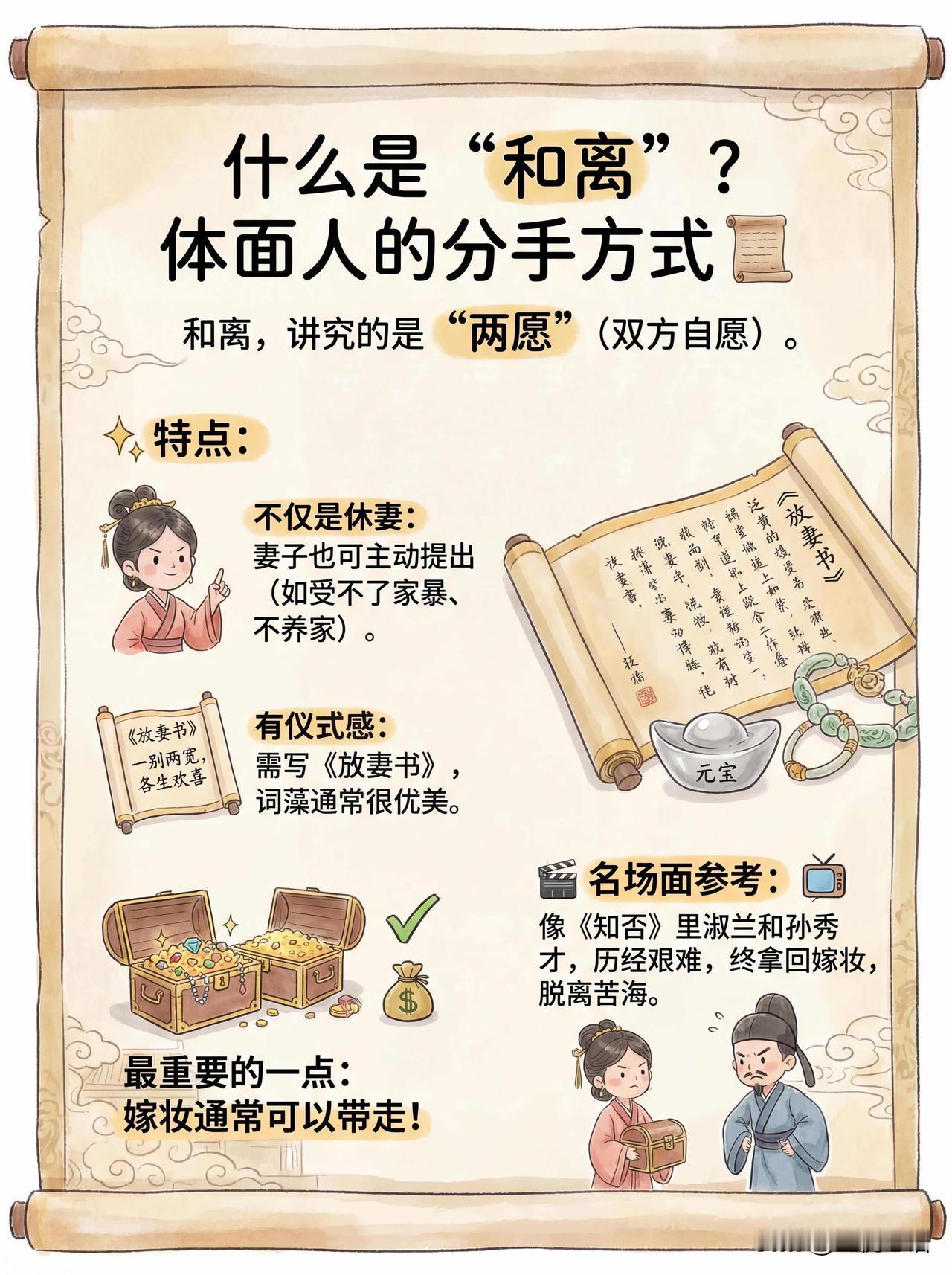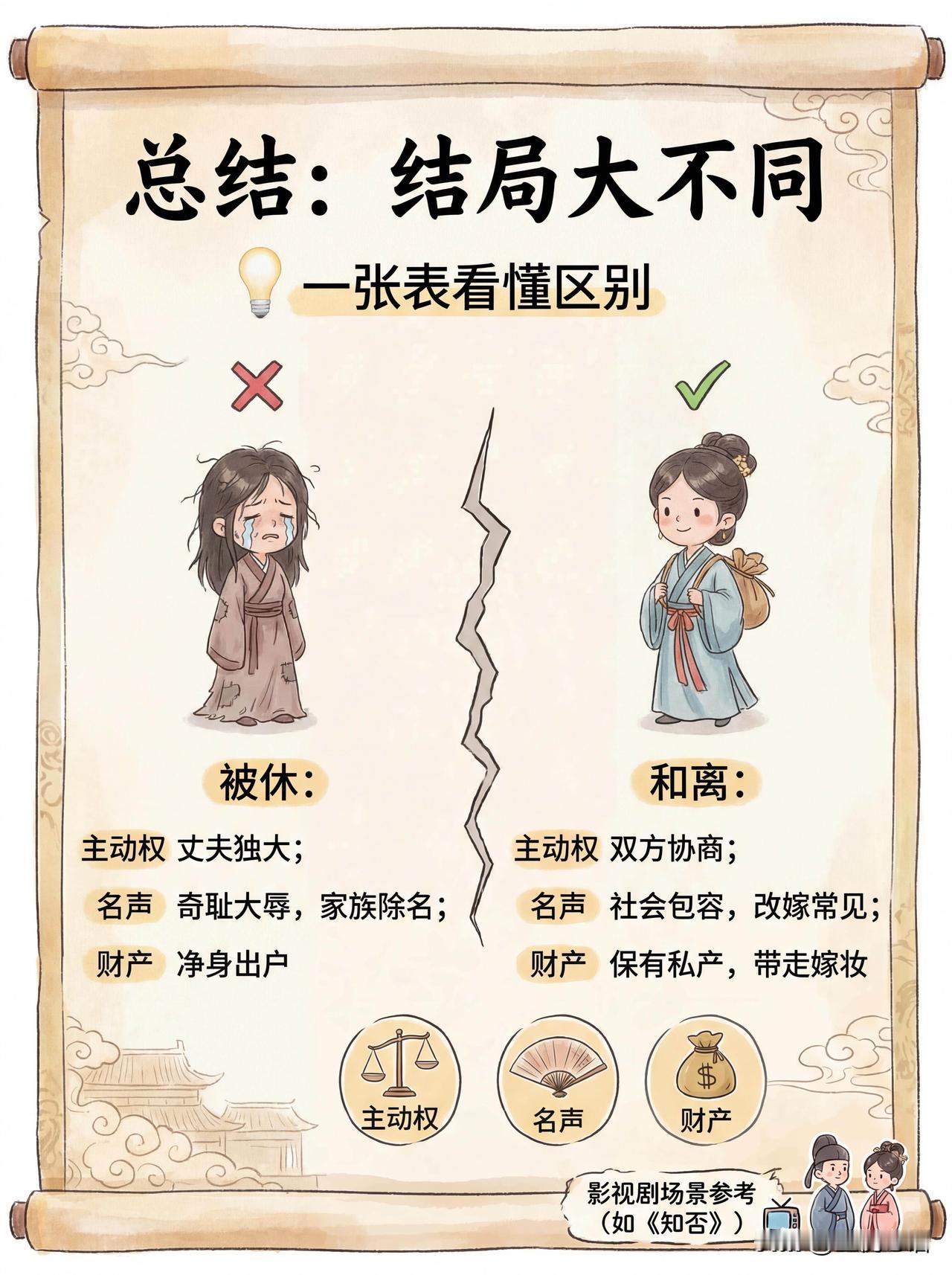 追剧冷知识! 古代和离与休妻差别太大了 看古装剧终于搞懂了! 古代和离、休妻完全不是一回事。 看过《知否》的应该有所体会吧。 休妻是丈夫单方面开除, 要符合“七出”,还没收嫁妆,简直社死。 和离好比是协商离职, 双方自愿,嫁妆能带走,体面的多。 还有“三不去”保护妇女, 娘家没人、守过三年孝等情况不能休。 原来古代婚姻也有“规则”, 这冷知识太实用,追剧再也不迷糊!