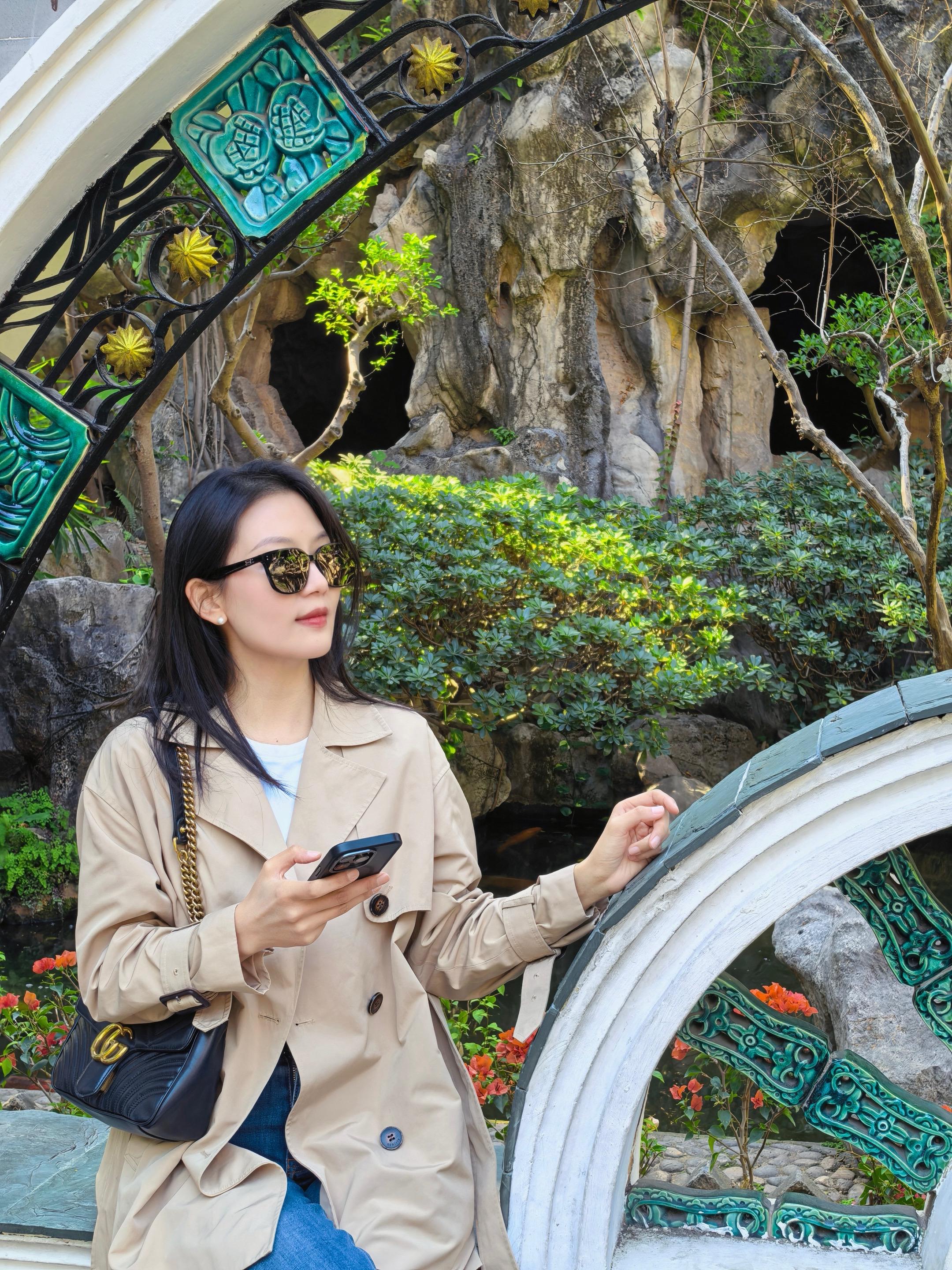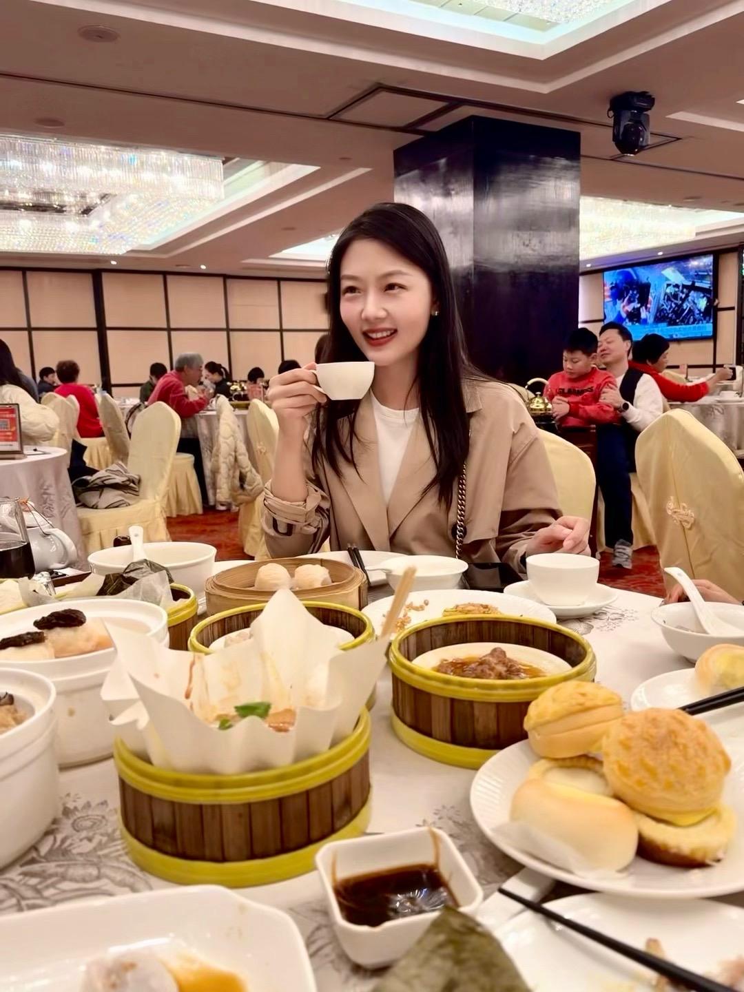 优雅餐厅里,她轻抚眼镜,静享美食时光。