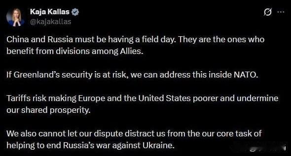卡拉斯称,中俄肯定乐坏了,北约内部可以解决格陵兰岛问题。 关税将使欧美变得更穷,不能分散结束俄乌战争这一核心任务的注意力 来源:kajakallas