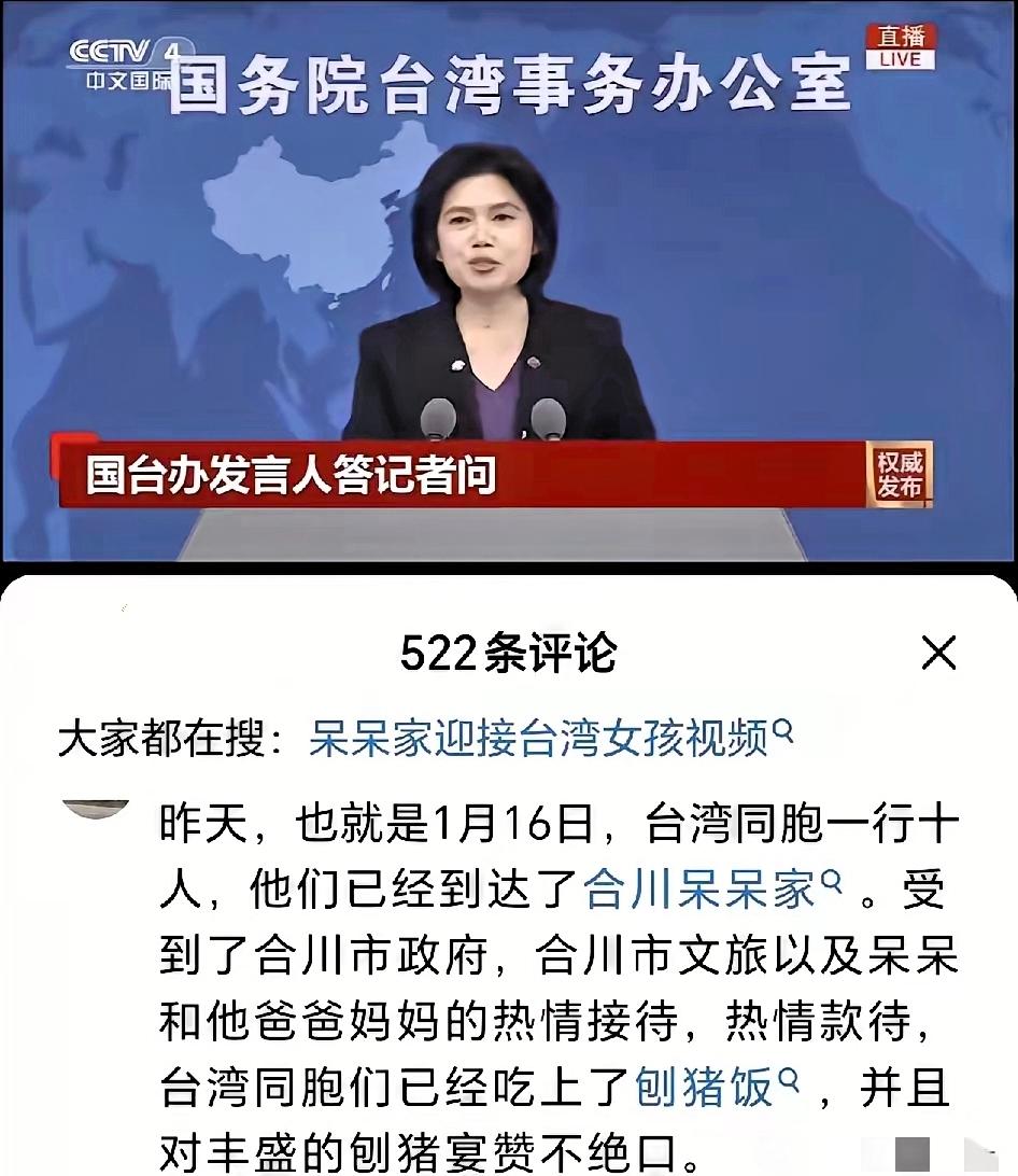 网友太有才了,说合川刨猪汤这件事寓意吉祥,就是统一台湾,国台办都提到呆呆了,称赞她功不可没。 网友的解读真的绝了,“台”去隔阂是同心,“合”聚乡情是团圆,“湾”过弯路归川渝,这哪是巧合,分明是刻在血脉里的必然! 国台办都为网友“呆呆”的无心邀约点赞,说这是两岸同胞最本真的双向奔赴。49年从重庆到台湾的牵挂,如今化作从台湾回重庆的奔赴,十多位台胞围坐院坝,喝着同款热汤,说着相似的乡愁,连炸酥肉的香气都和记忆里一模一样。