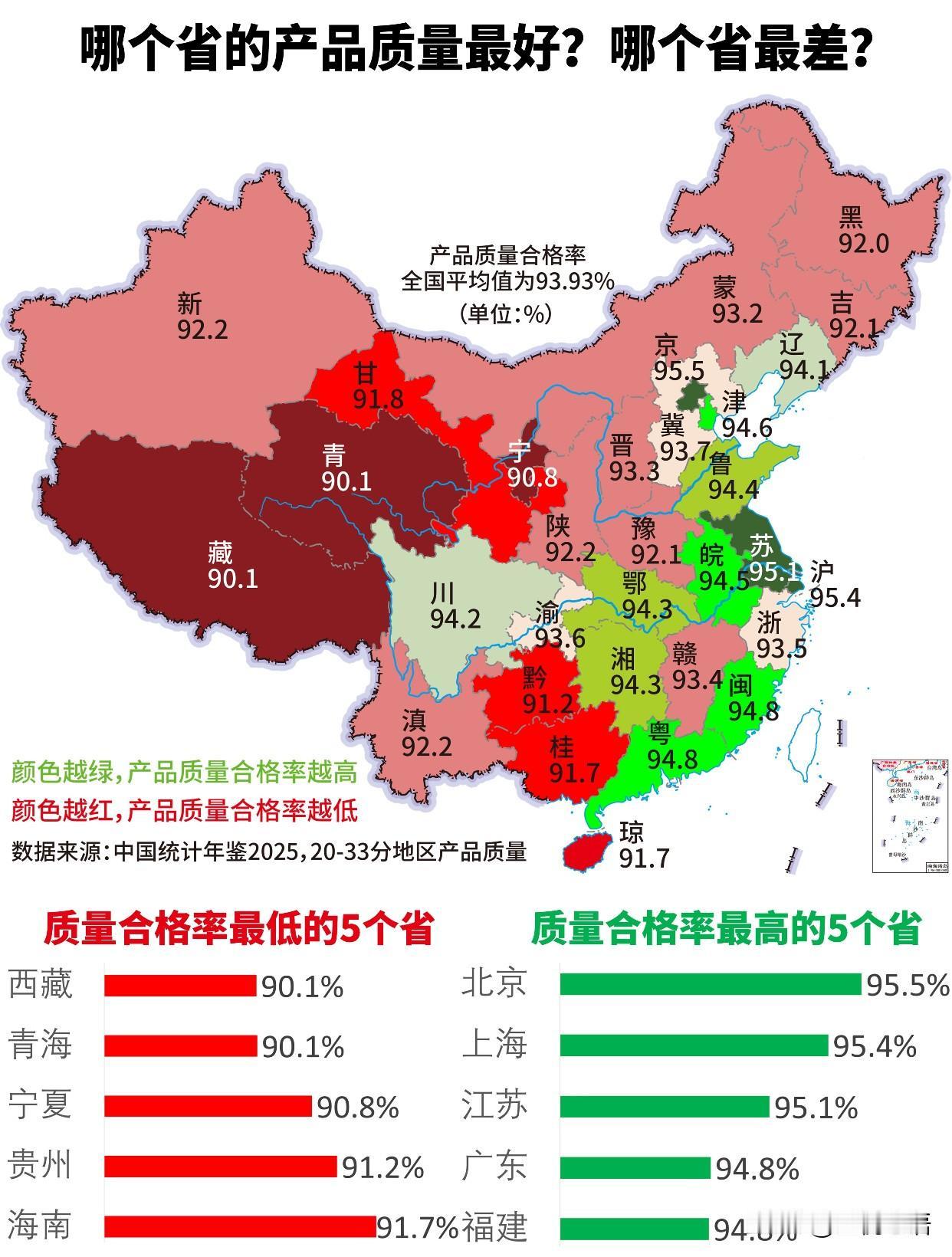 产品质量省份排名大反转! 看了产品质量合格率数据,直接颠覆认知! 全国均值93.93%,东部省份整体最能打。 北京、上海稳居前列,江苏95.1%一枝独秀, 广东94.77%也超给力,不愧是制造业大省。 (数据来源:中国统计年鉴2025) 最意外的是福建! 94.76%排第五,彻底打破对莆田系的刻板印象。 而浙江居然低于全国均值,只有93.5%, 作为发达省份,这结果真让人没想到。 西部四川94.2%一枝独秀, 青海、西藏90.1%垫底。 东北辽宁还行,黑吉两省得加把劲。 原来买东西不能凭固有印象, 数据才不会骗人。 希望各地都能跟上节奏, 让我们买得更放心!