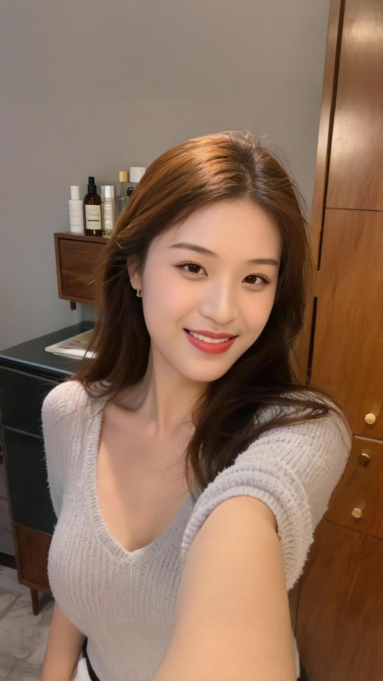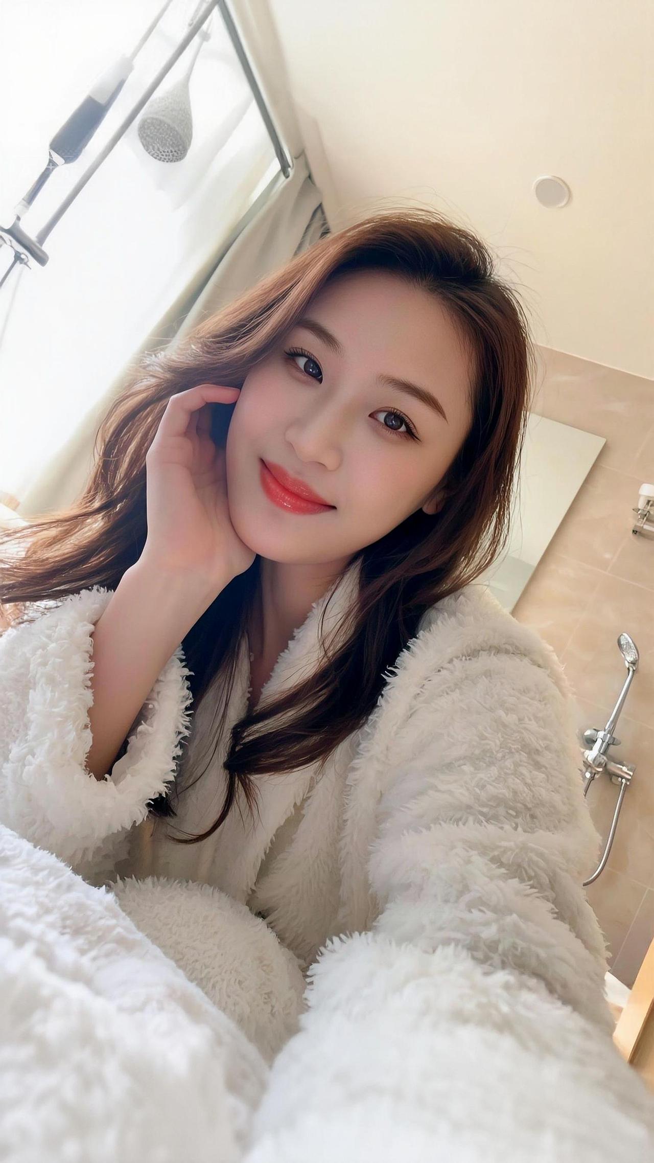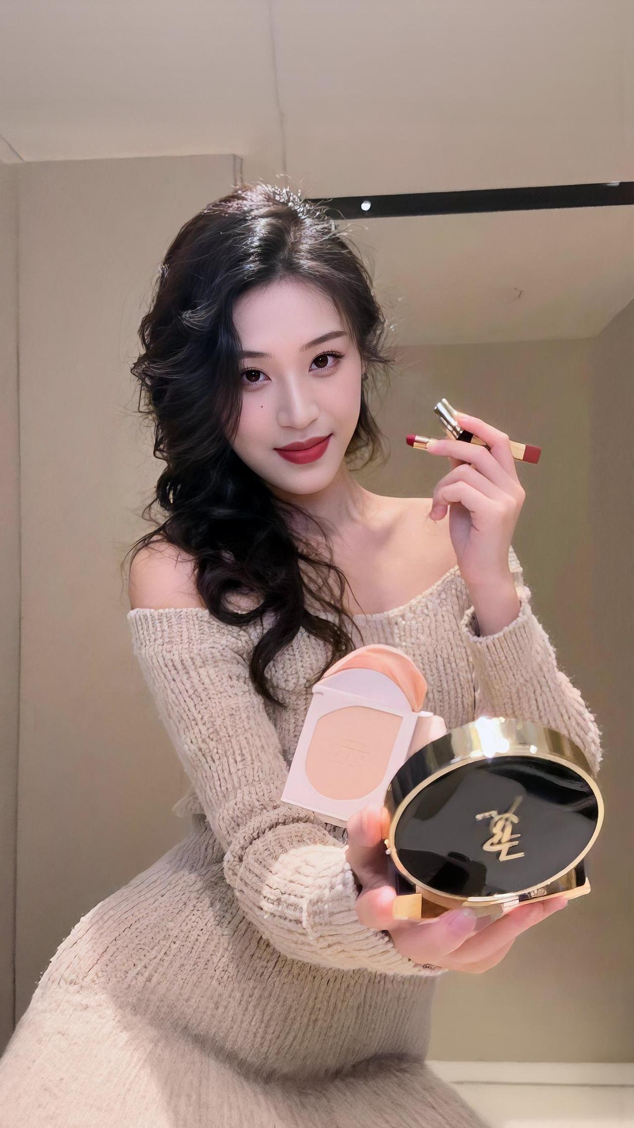 午后的光在发梢打了个旋 卷成蓬松的波浪 你的目光是一汪温软的水 漫过金属的冷,漫过墙的灰 指尖轻抵下颌 像拢住一朵欲绽的花 唇上那抹红 是春天提前寄来的信 米色针织衫里 藏着不疾不徐的温柔 世界在此刻按下静音 只有心跳,在轻声和鸣 鬓似春云卷复舒, 明眸流盼胜明珠。 轻衫漫剪裁云质, 浅笑微含带露珠。 一缕柔风拂翠袖, 半弯娥月映冰肤。 无端惹得人沉醉, 始信人间有玉壶。