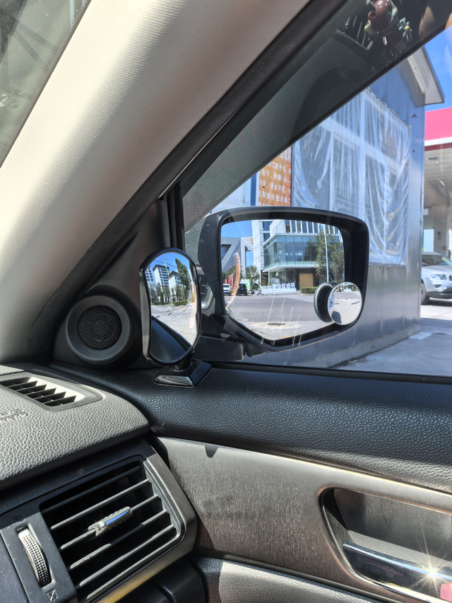 这个副驾A柱的小镜子 是从第一辆车一直跟到现在,简直不要太香,这个小镜子可以看到停车时B柱的盲区,而且拐弯的时候也能看到旁边自行车道和后车的情况,当你习惯这个小镜子后,你会觉得它是真的有用
