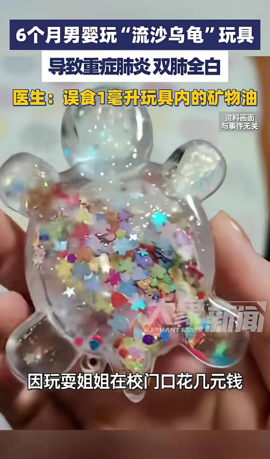 6个月男婴玩“流沙乌龟”玩具导致重症肺炎,双肺变白。 郑州这事件太吓人了!一个6个月大男婴进了ICU,双肺像刷了白漆,原因竟是玩“流沙乌龟”。 这玩具看着解压,实则暗藏杀机。孩子误吸不到1毫升矿物油,就引发重症肺炎。1毫升还没一滴眼药水多,可进了肺就成大麻烦,像强力胶黏在肺泡,咳不出也吸不进。 三岁以下孩子逮啥啃啥,这些花花绿绿的流沙玩具对他们就是“生化武器”。 6个月的儿童就不要接触任何化学玩具,正是口欲期,看见什么都想咬,家长要特别小心。 家长也别侥幸觉得看紧就行,往往几秒疏忽就可能酿成悲剧。得有“如履薄冰”的敬畏心,清除孩子身边的“暗礁”。 去年夜光小乌龟,流沙小乌龟,特别盛行,很多孩子都喜欢买来玩。看着安全的小乌龟也会出事故。 家长们给小孩子选择玩具时,也要谨慎,有些玩具看着没什么,其实有一定的危险性。