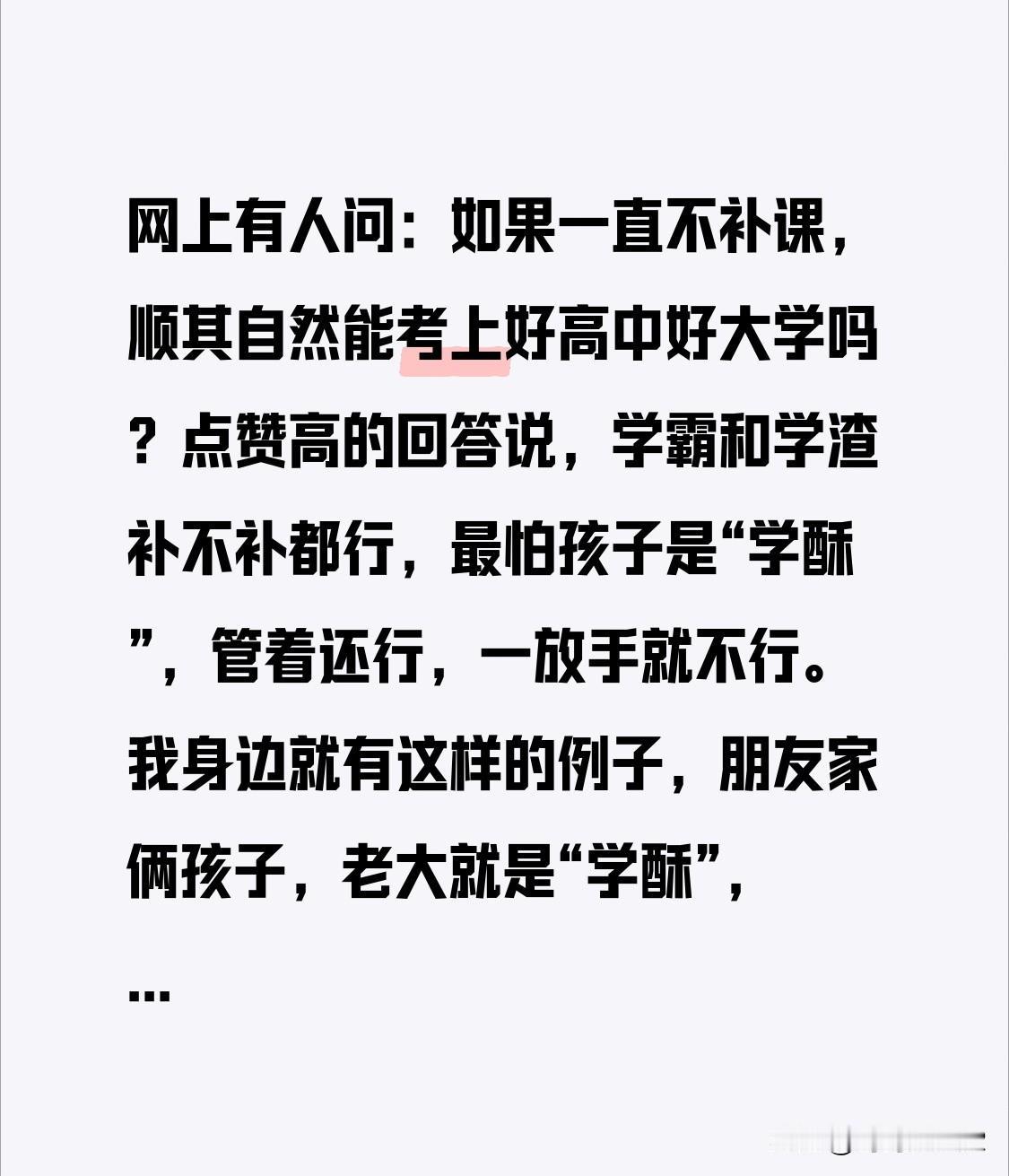 网上有人问:如果一直不补课,顺其自然能考上好高中好大学吗?点赞高的回答说,学霸和学渣补不补都行,最怕孩子是“学酥”,管着还行,一放手就不行。我身边就有这样的例子,朋友家俩孩子,老大就是“学酥”,管着成绩还凑合,不管就一塌糊涂;老二自觉性强,偶尔提醒就好。其实,很多不热衷补课的家长挺理性,他们知道教育比拼的是家庭氛围和孩子的学习驱动力。如果孩子靠补课才能上高中,进入高强度赛道却没匹配的能力,意义也不大。让花成花,让草成草,或许才是最好的教育。