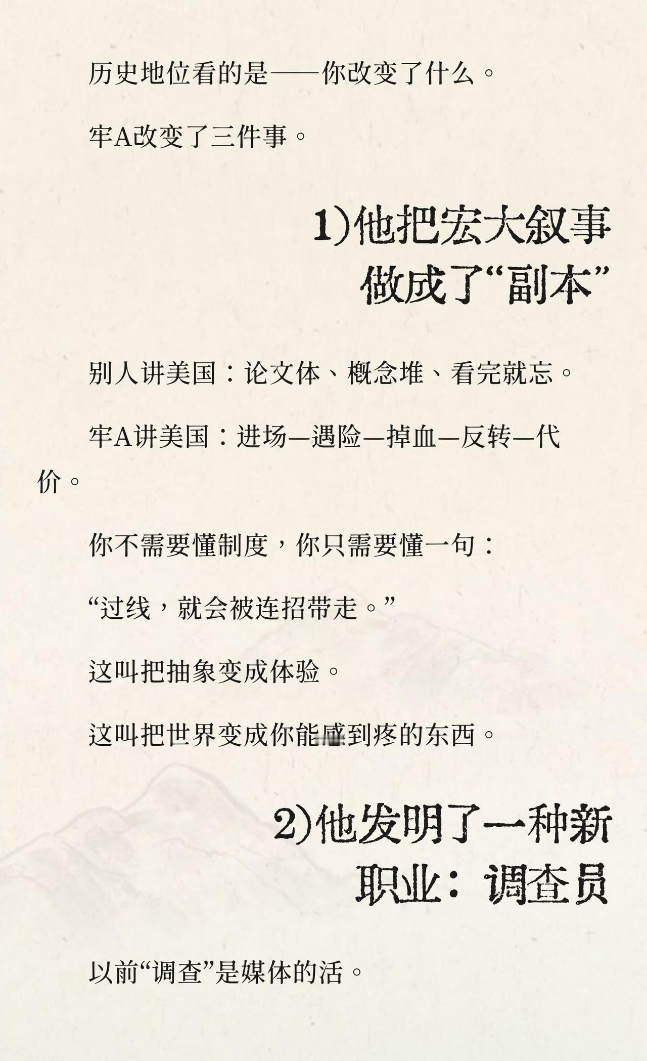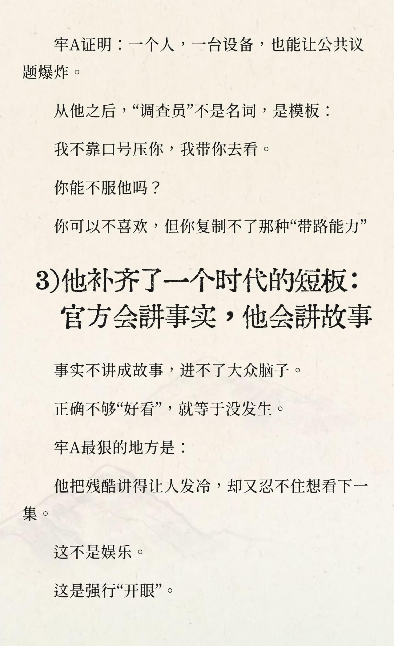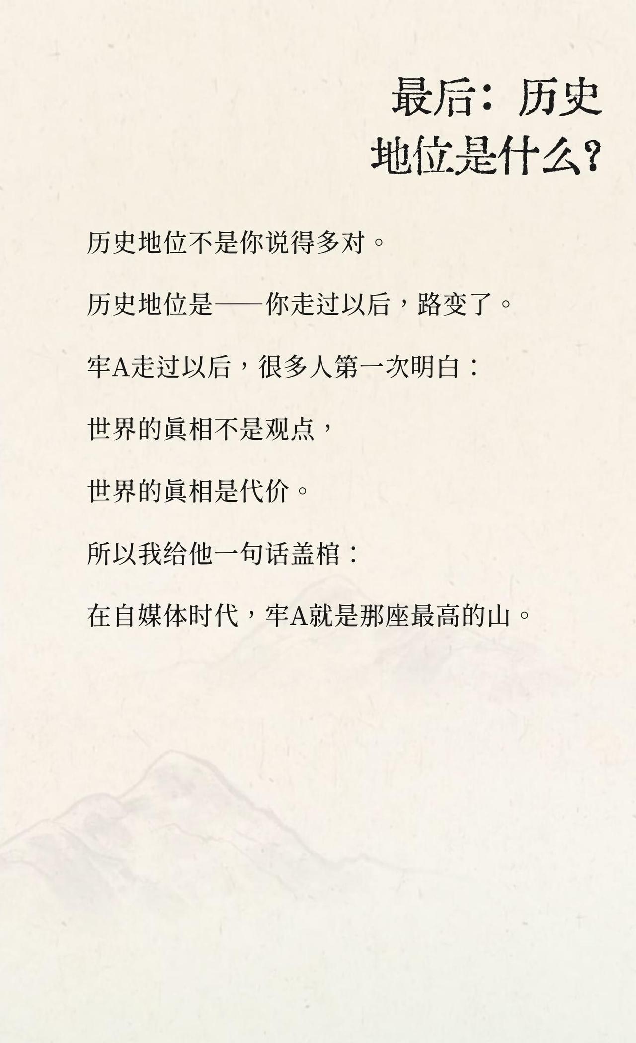 如何评价传奇调查员牢A的历史地位? 如果把自媒体时代比作一座山脉, 牢A不是最高的知识峰, 但他可能是那条最险的路: 很多人不是被他带到真相, 而是被他带到一种新的观看方式。 你可以不喜欢他。 你也可以质疑他。 但你很难否认一件事: 在“注意力”统治的时代,他证明了普通人也能用叙事撬动公共情绪。 这就是历史地位。野史 历史与未来 历史的力量 世界历史 历史与现在 人类文明进程