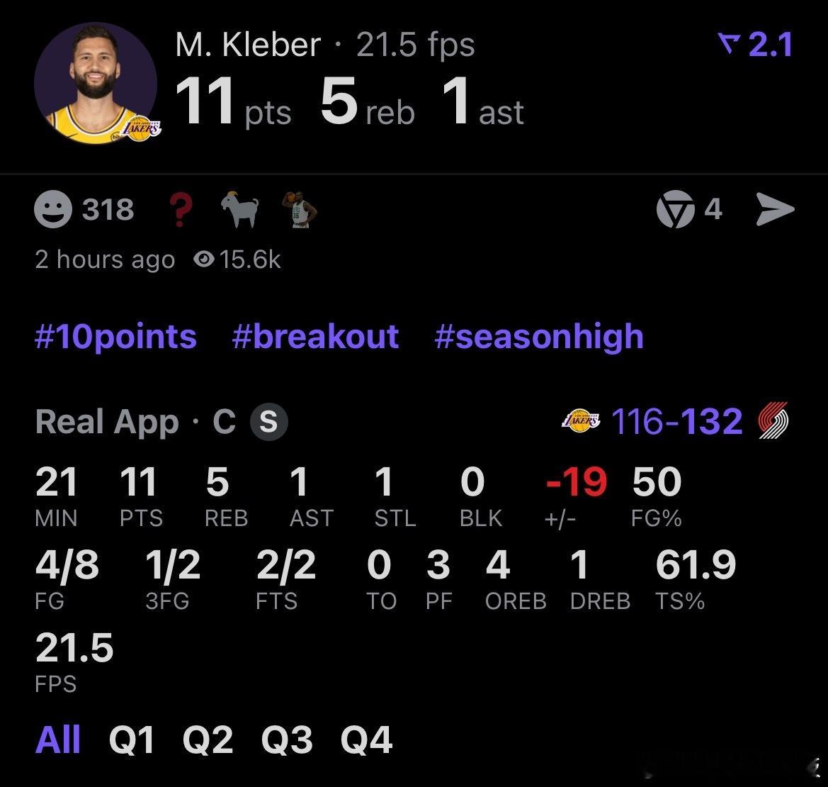 足够尽力!克勒贝尔全场8中4,得到11分5板1助1断,包括4个前场板。11分不仅刷新可乐杯湖人生涯单场得分记录,也是自2024年12月28日以来,他个人的得分新高湖人vs开拓者