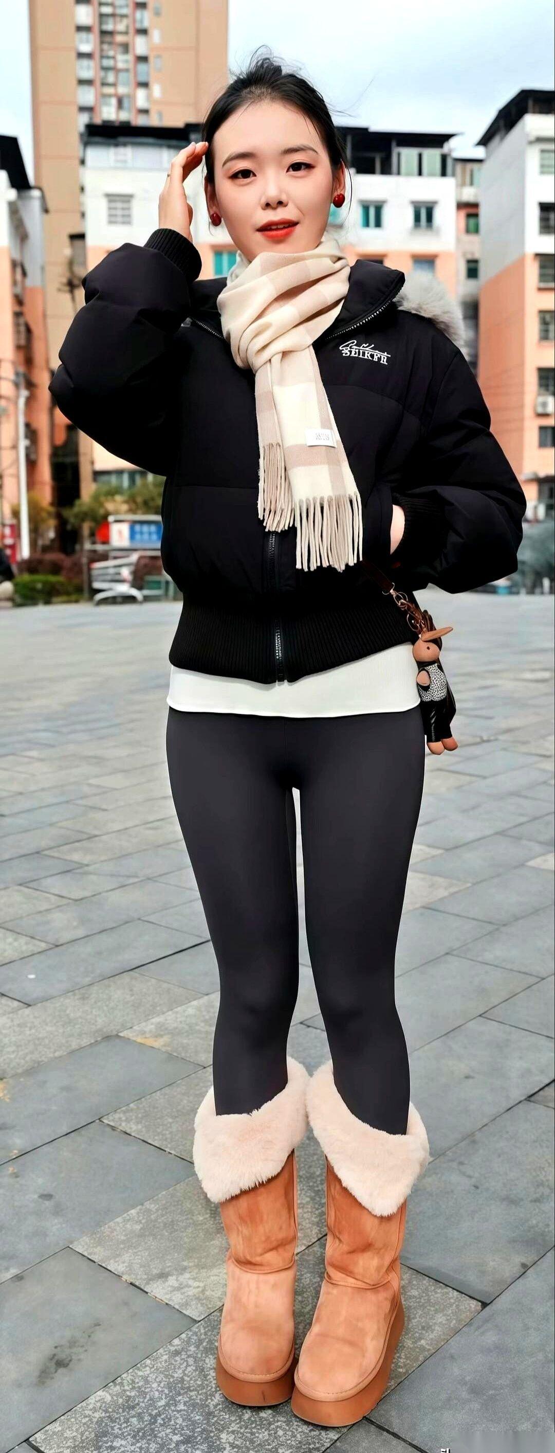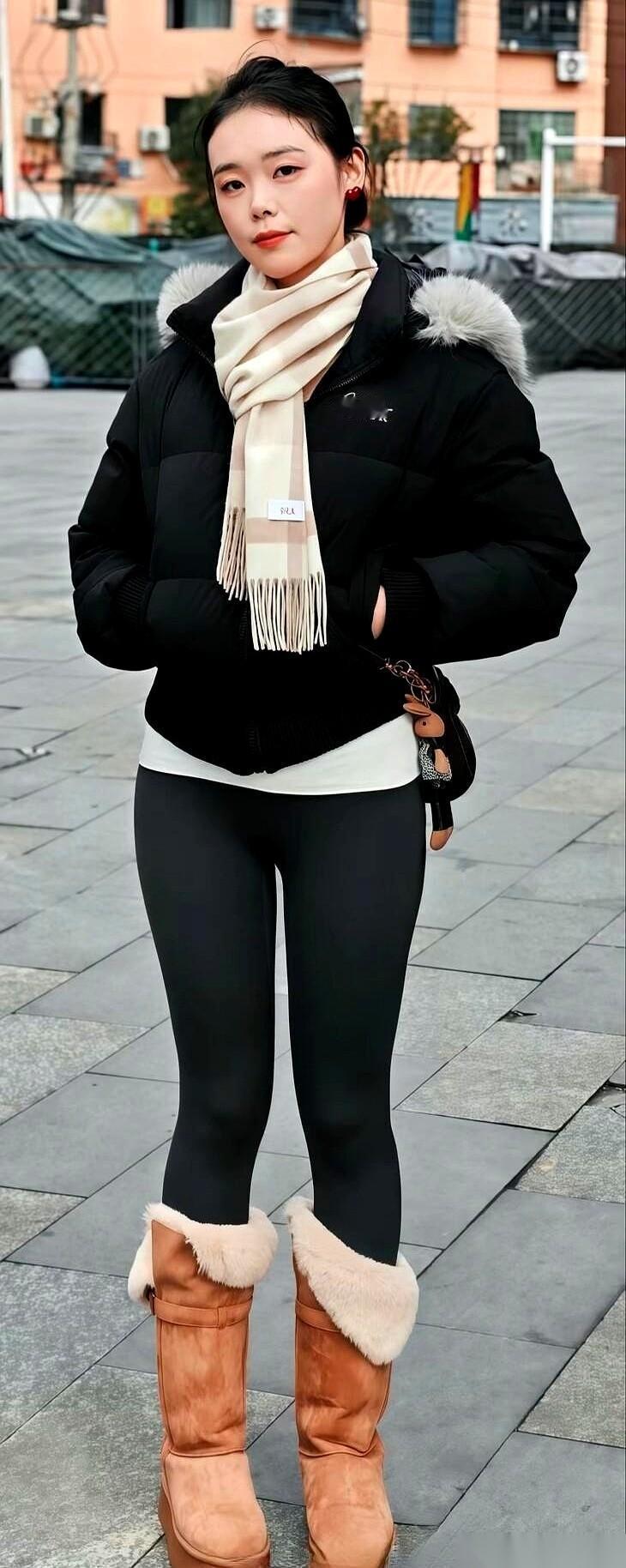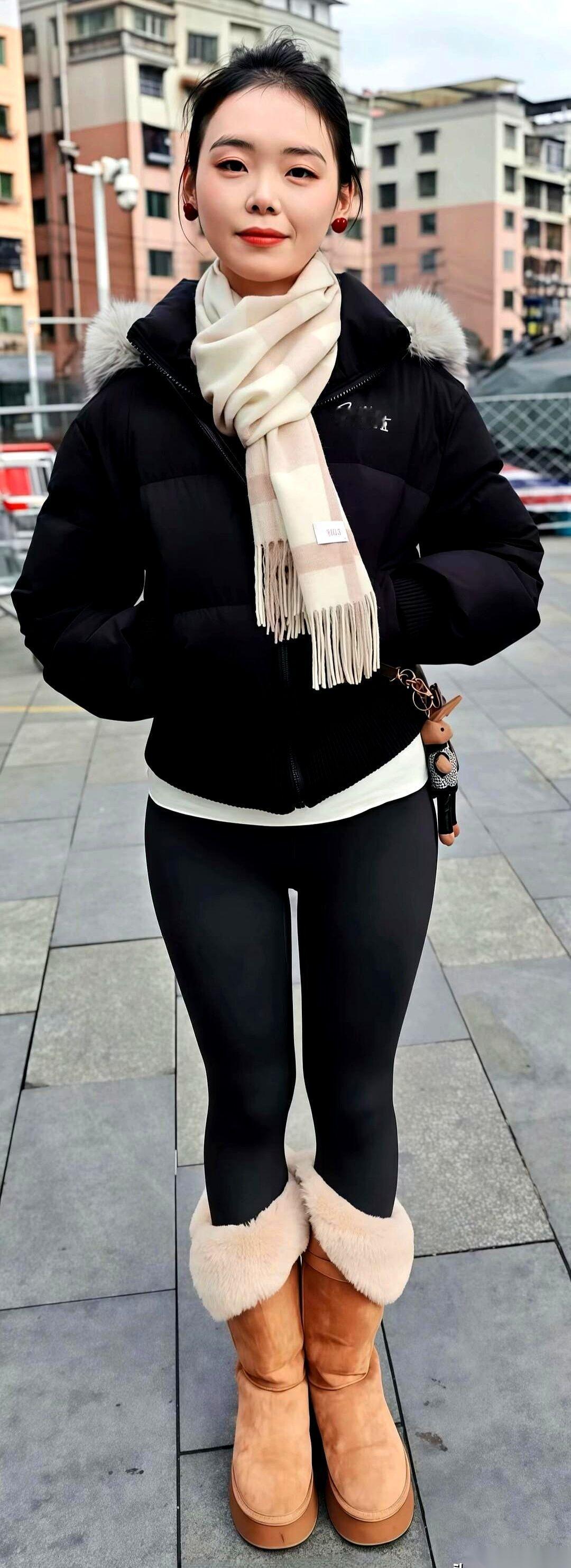 冬天的大街上,最怕穿成一个移动的黑色垃圾袋。 羽绒服一裹,紧身裤一套,完事。保暖是保暖了,但镜子里的自己,活像个被绳子拦腰捆住的轮胎。 但总有那么一个人,几乎一模一样的配置,却穿出了完全不同的感觉。 镜头拉近。你看她。一件黑色的短款棉衣,拉链利落地拉到顶,下摆干净地停在腰线以上。就这一下,把整个人的重心往上提了一大截。 下半身,是那条每个女孩都有的黑色加绒鲨鱼裤,紧紧贴着腿。上半身的蓬松感,和下半身的利落线条,一撞。人,瞬间就被拉长了,也变窄了。 到这里,还只是基础操作。真正让整个画面活过来的,是脚上那一下。就在一片纯黑的尽头,一双棕色的长筒雪地靴稳稳踩在地上,毛茸茸的边缘,像给整个冷酷的色调加了一层温暖的滤镜。 就是这点棕色,让一身黑不再沉闷。 她把一条纯羊毛的围巾松松地绕了一圈,没系死,两端就那么垂下来。围巾的颜色不是黑色,而是呼应靴子的浅驼色。风一吹,围巾的软,和棉衣的光滑面料,轻轻碰了一下。 所有的细节,都在这了。 这套穿搭的底层逻辑,其实就一句话:用一个“亮点”打破全身的“安全色”。这个亮点可以是脚下的靴子,可以是脖子上的围巾,甚至可以是一个不同颜色的包。 说到底,穿衣服不是堆砌单品,而是制造一个视觉焦点。你觉得,如果把靴子换成白色,这身还有那味儿吗?