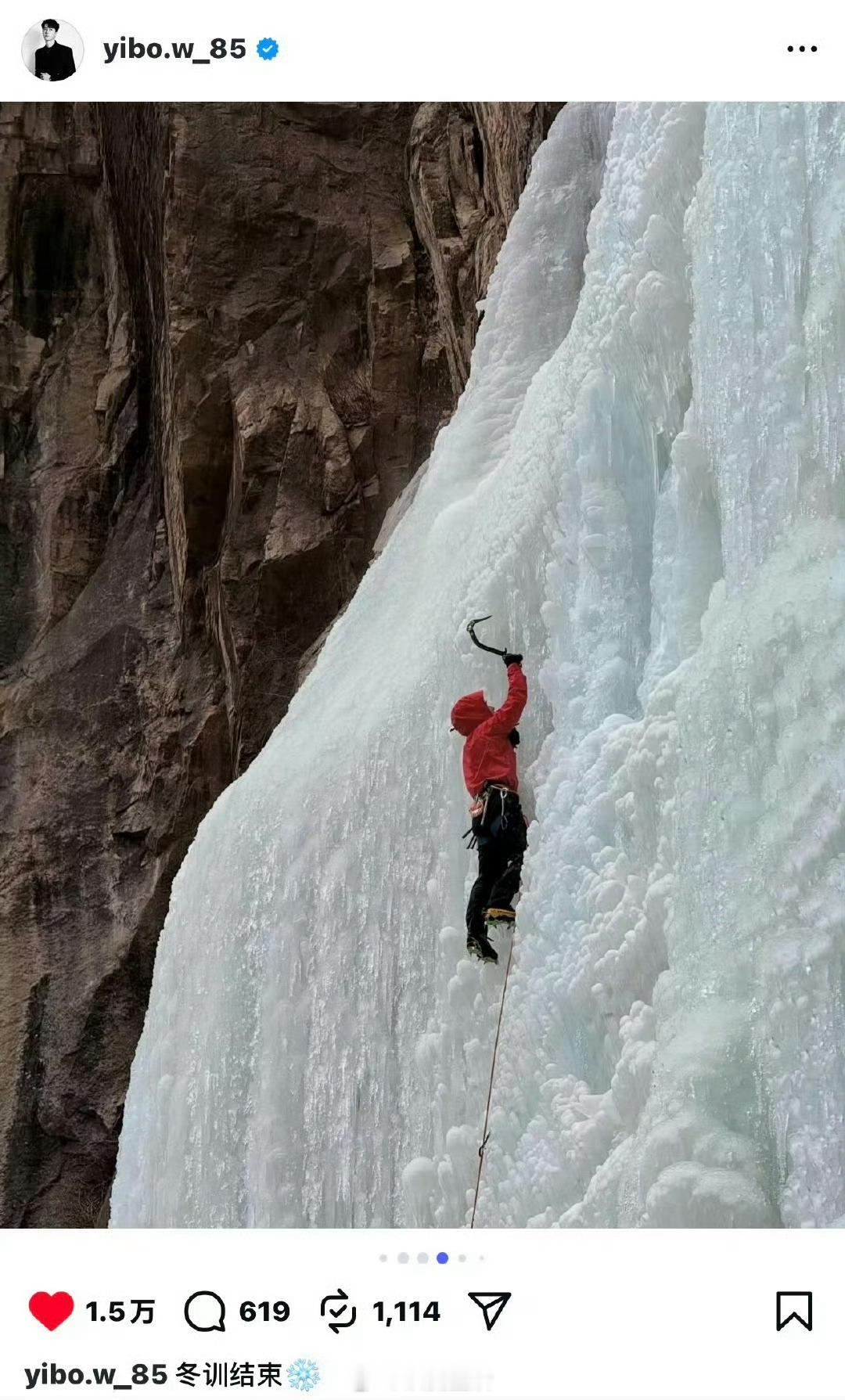 王一博晒攀冰照不愧是内娱最有种的男人。这高度这坡度看着都害怕。