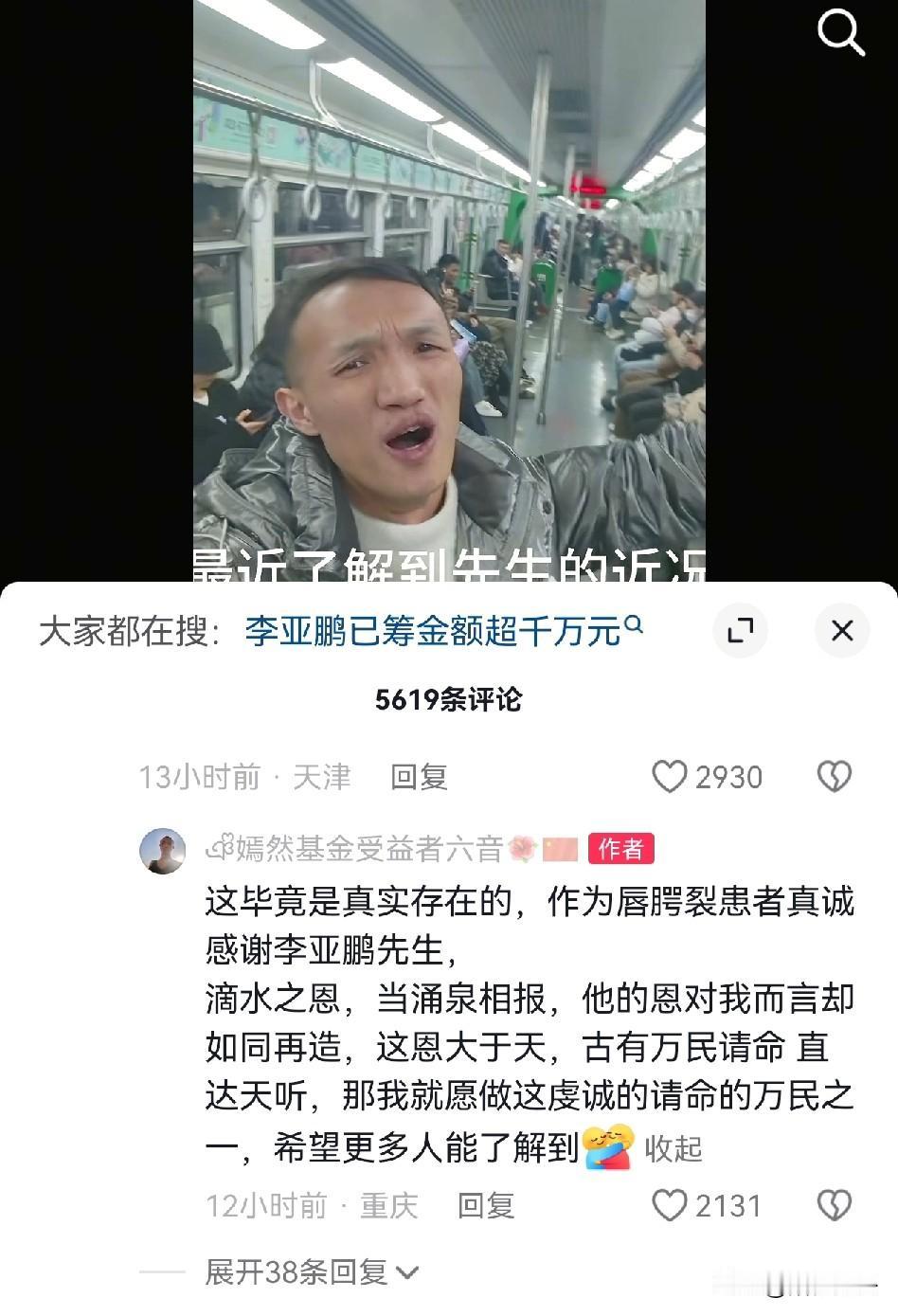 嫣然天使儿童医院,受益者地铁发声! 嫣然天使基金受益男子,在地铁录视频感谢李亚鹏。勇气可嘉,莫名落泪,虽然现场的人很冷漠,没有一点掌声,但是他还是做了! 1月17日,一名网友在地铁上录视频感谢“嫣然天使儿童医院”,看的出来他还是鼓足了勇气的,在拍摄前酝酿了很久才敢开口![鼓掌] 男子声称自己也是位受益者,感谢李亚鹏先生的帮助,最近得知嫣然天使儿童医院遇到了麻烦,心里很难过,滴水之恩当涌泉相报,自己会力所能及,也希望大家能伸出援助之手,帮嫣然天使儿童医院渡过难过。 他的话虽然没有华丽的语言,却字字直击网友的心灵,在这样公共的场合说出来是要很大的勇气的,而这份勇气是李亚鹏的善举给予的。 现在李亚鹏遇到了太大的难处了,希望能有更多的之前受助的人能够突破自己站出来发声! 人在做天在看,相信好人会有好报,李亚鹏加油![赞]嫣然天使公益 为受伤孩子发声 公益嫣然基金