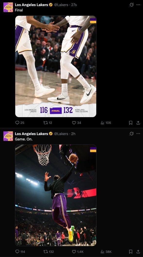 湖人官推今天一共发了两条:-比赛开始-比赛结束湖人