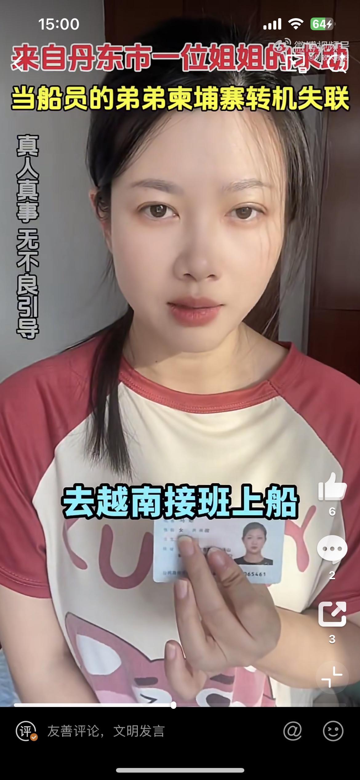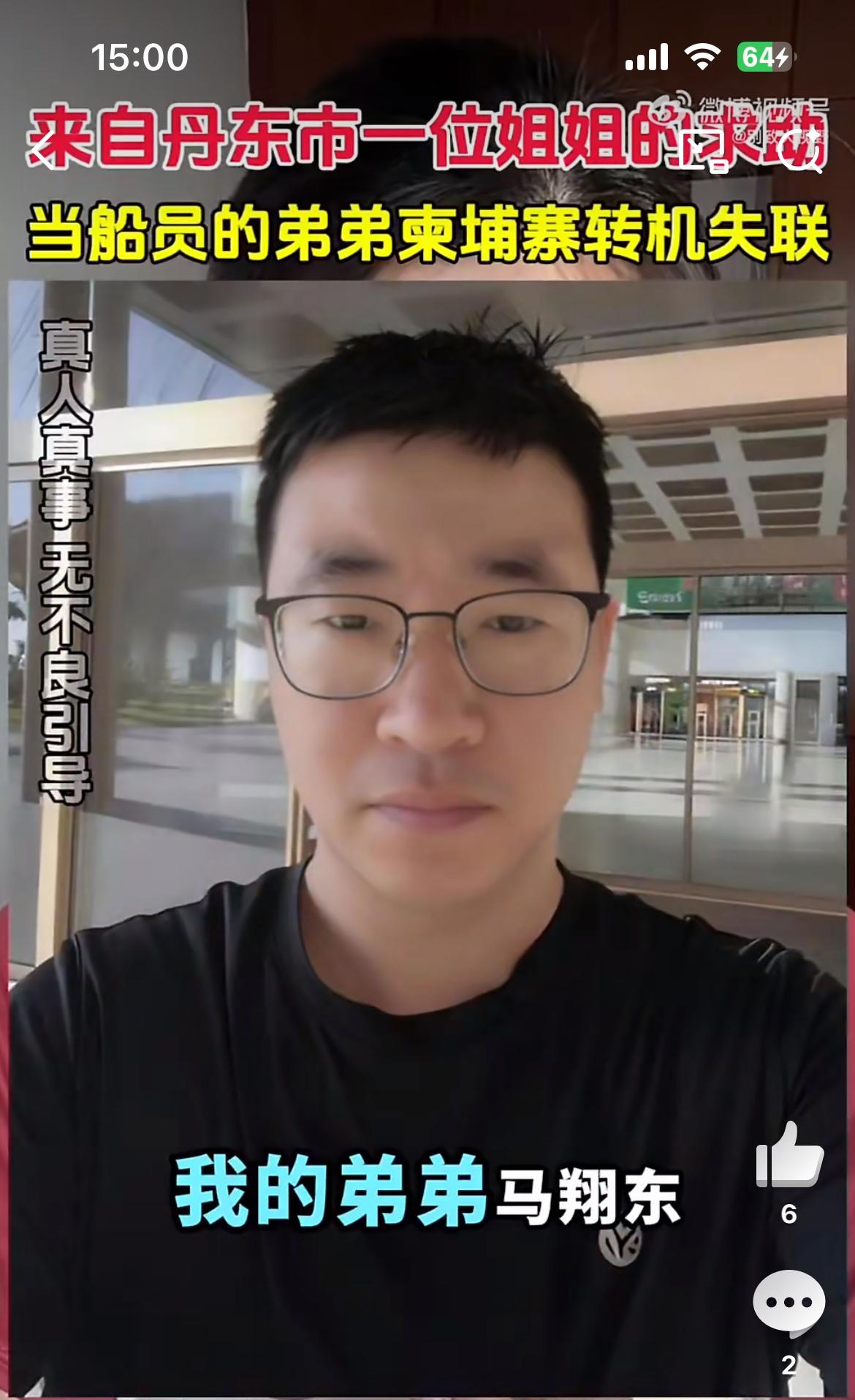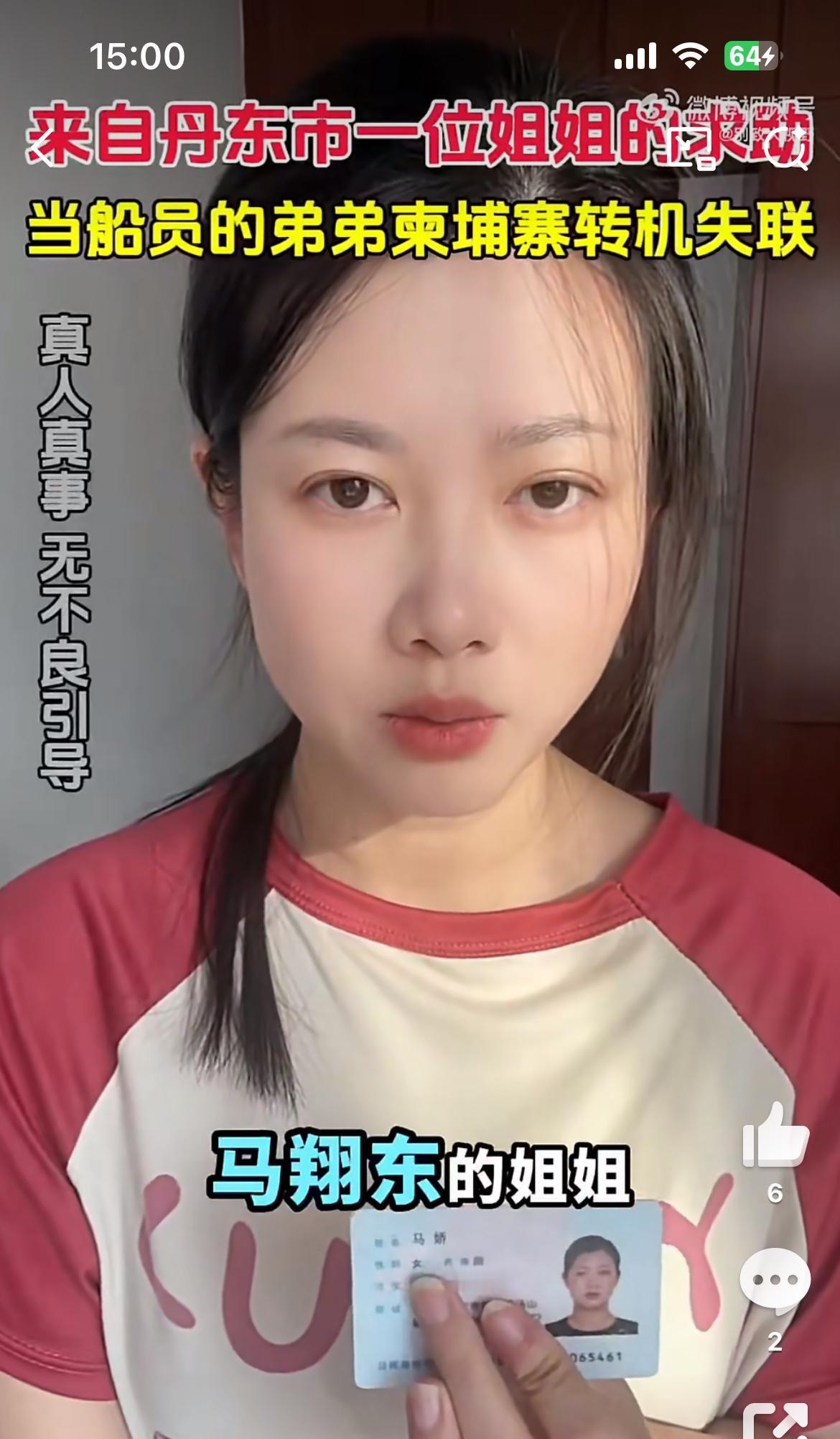 这个美女的弟弟在柬埔寨转机失踪了,也是一个船员,和前几天一个老婆找老公的类似。他的弟弟叫马翔东,12月16日在柬埔寨转机,说是接到船务派遣公司的命令,去越南登船出海,18日人到柬埔寨不见了,距今已经一个月过去了,依然音讯全无。这样视频找人,基本是大海捞针,没啥用处。柬埔寨失踪案 柬埔寨男孩失踪 马翔宇
