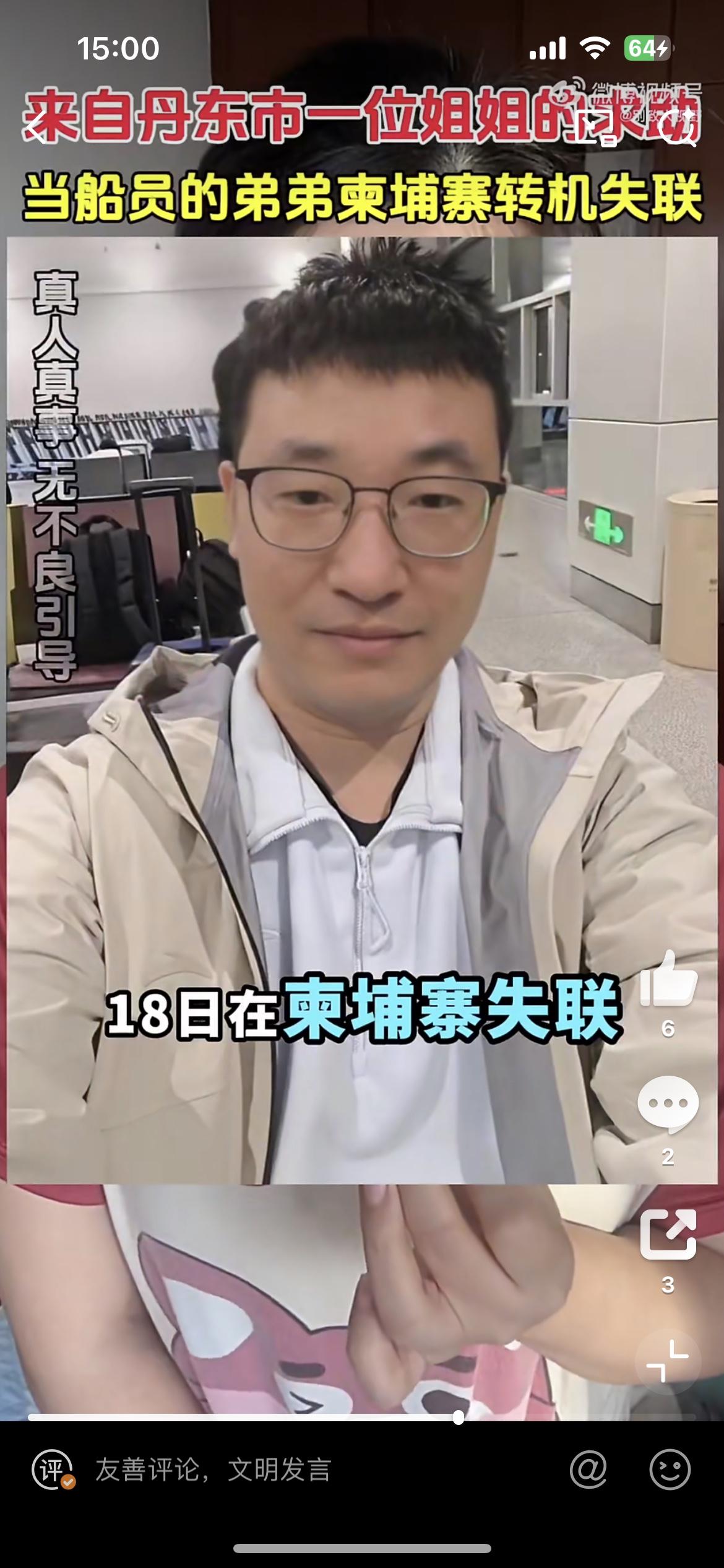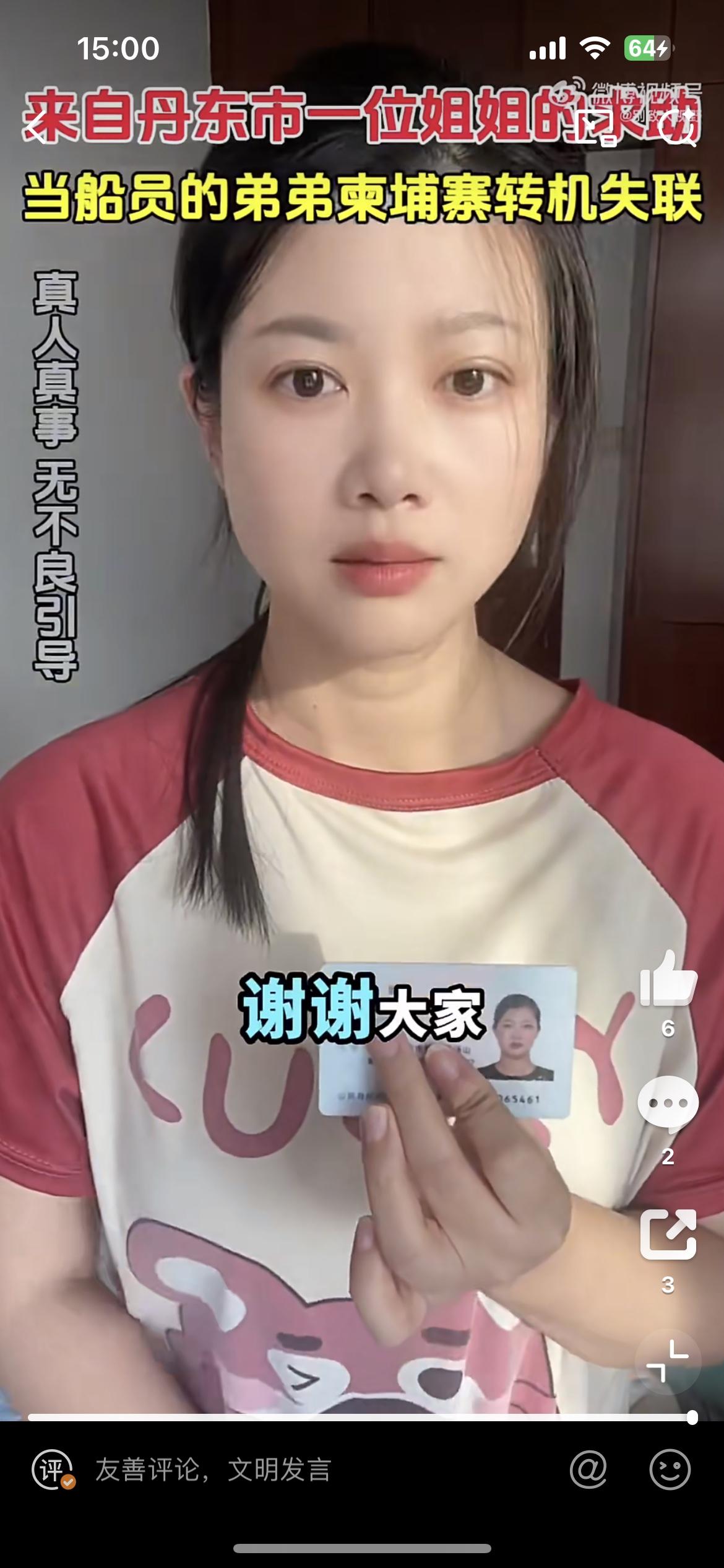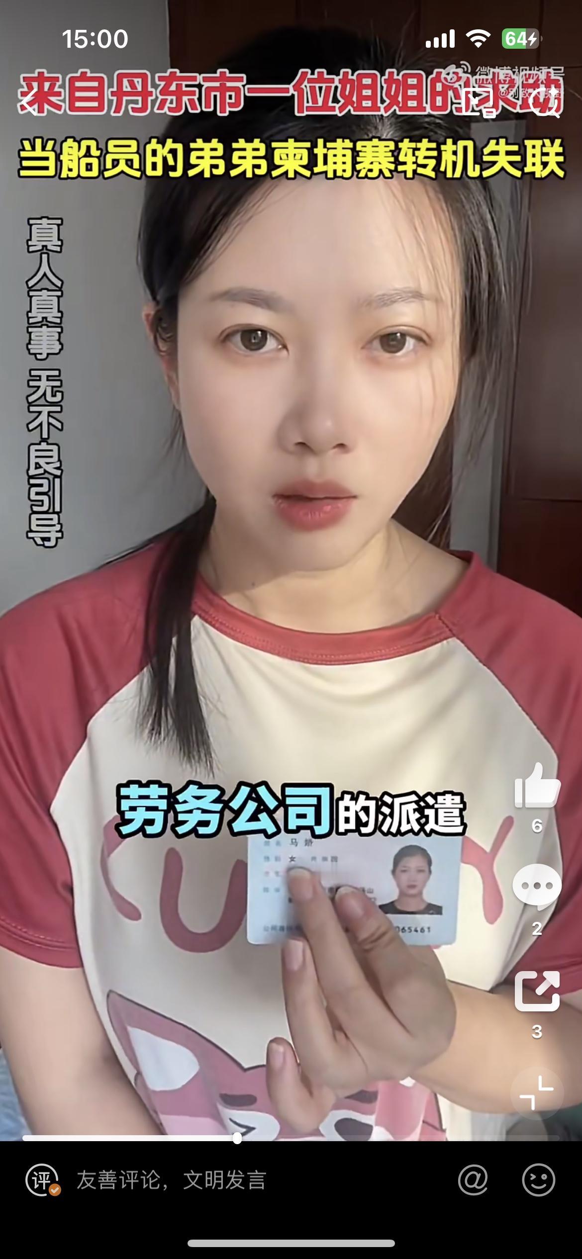 这个美女的弟弟在柬埔寨转机失踪了,也是一个船员,和前几天一个老婆找老公的类似。他的弟弟叫马翔东,12月16日在柬埔寨转机,说是接到船务派遣公司的命令,去越南登船出海,18日人到柬埔寨不见了,距今已经一个月过去了,依然音讯全无。这样视频找人,基本是大海捞针,没啥用处。柬埔寨失踪案 柬埔寨男孩失踪 马翔宇