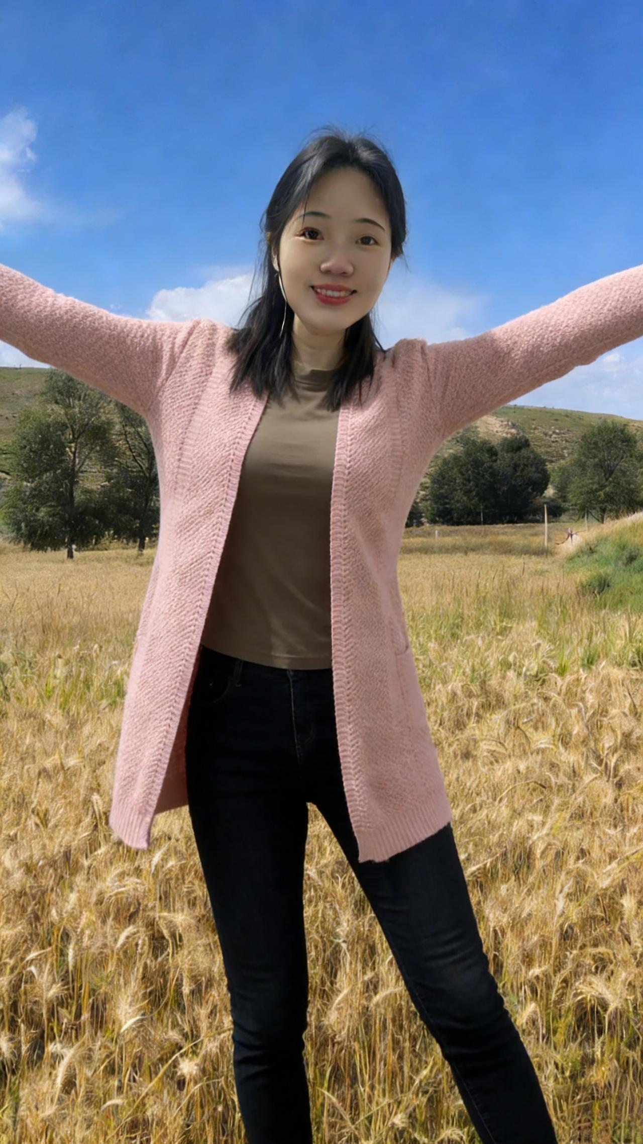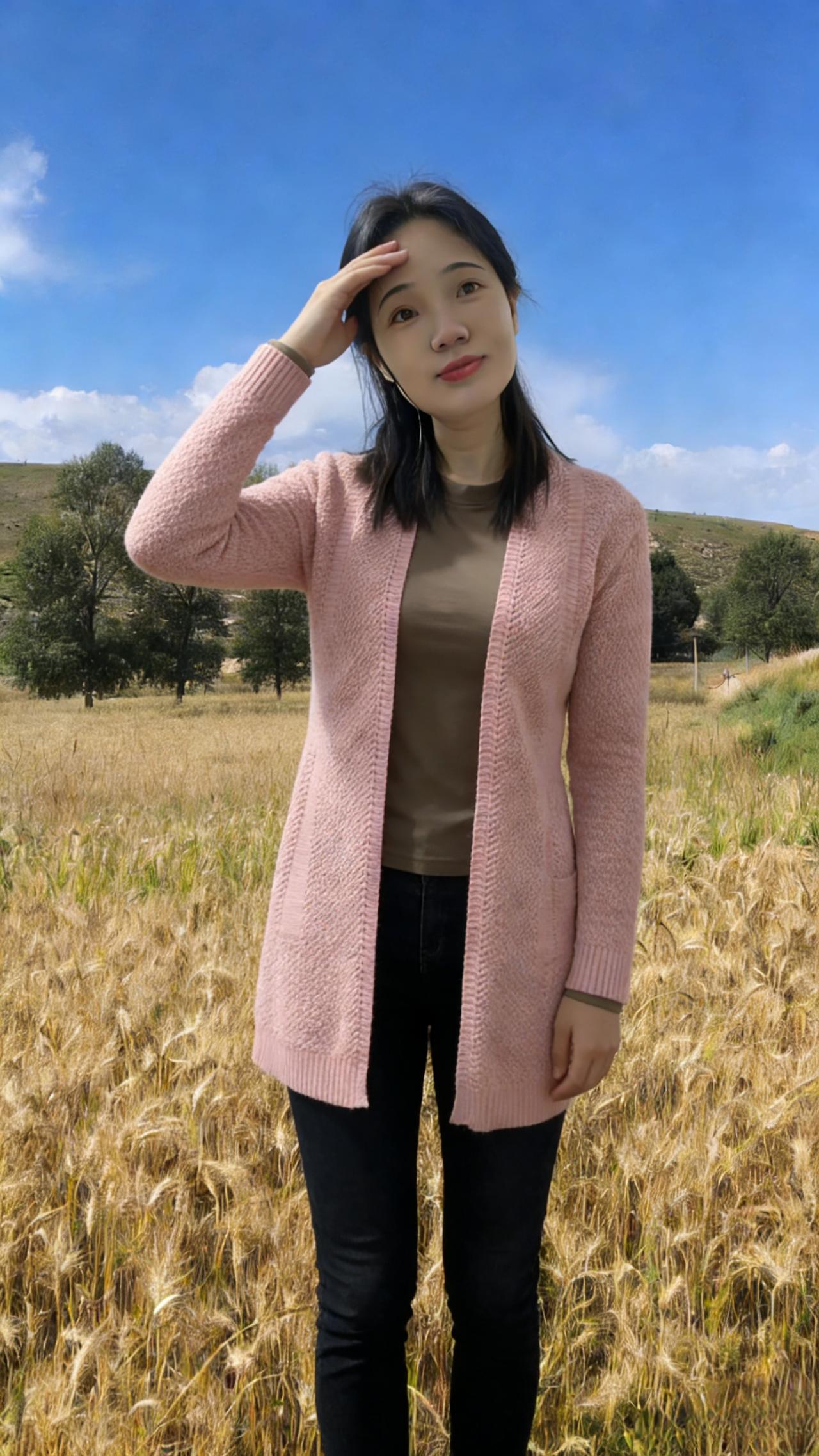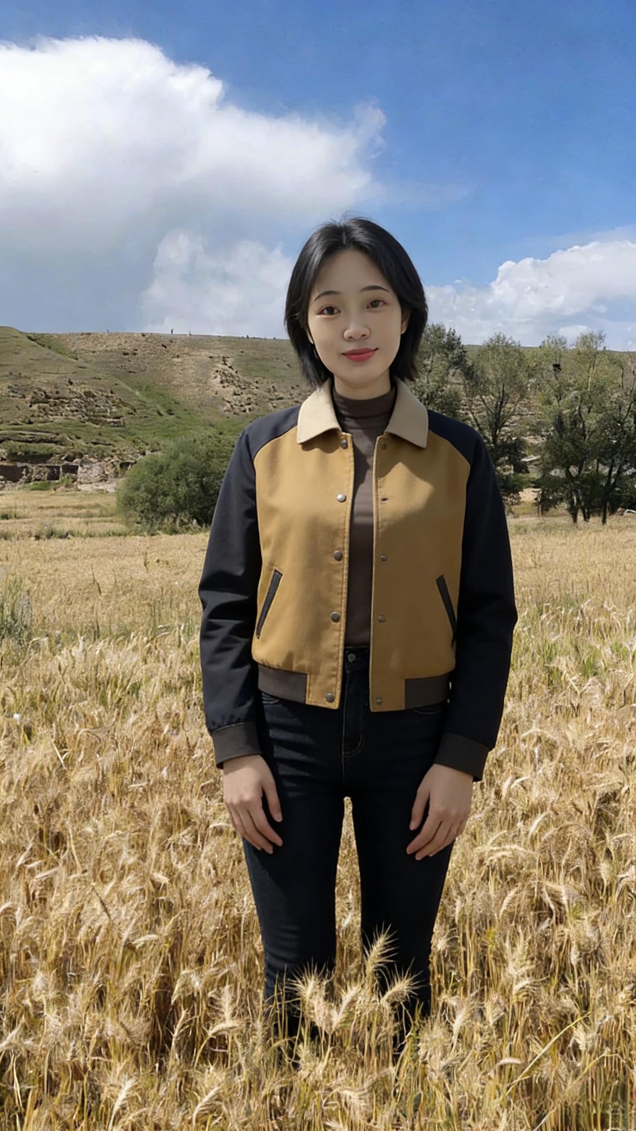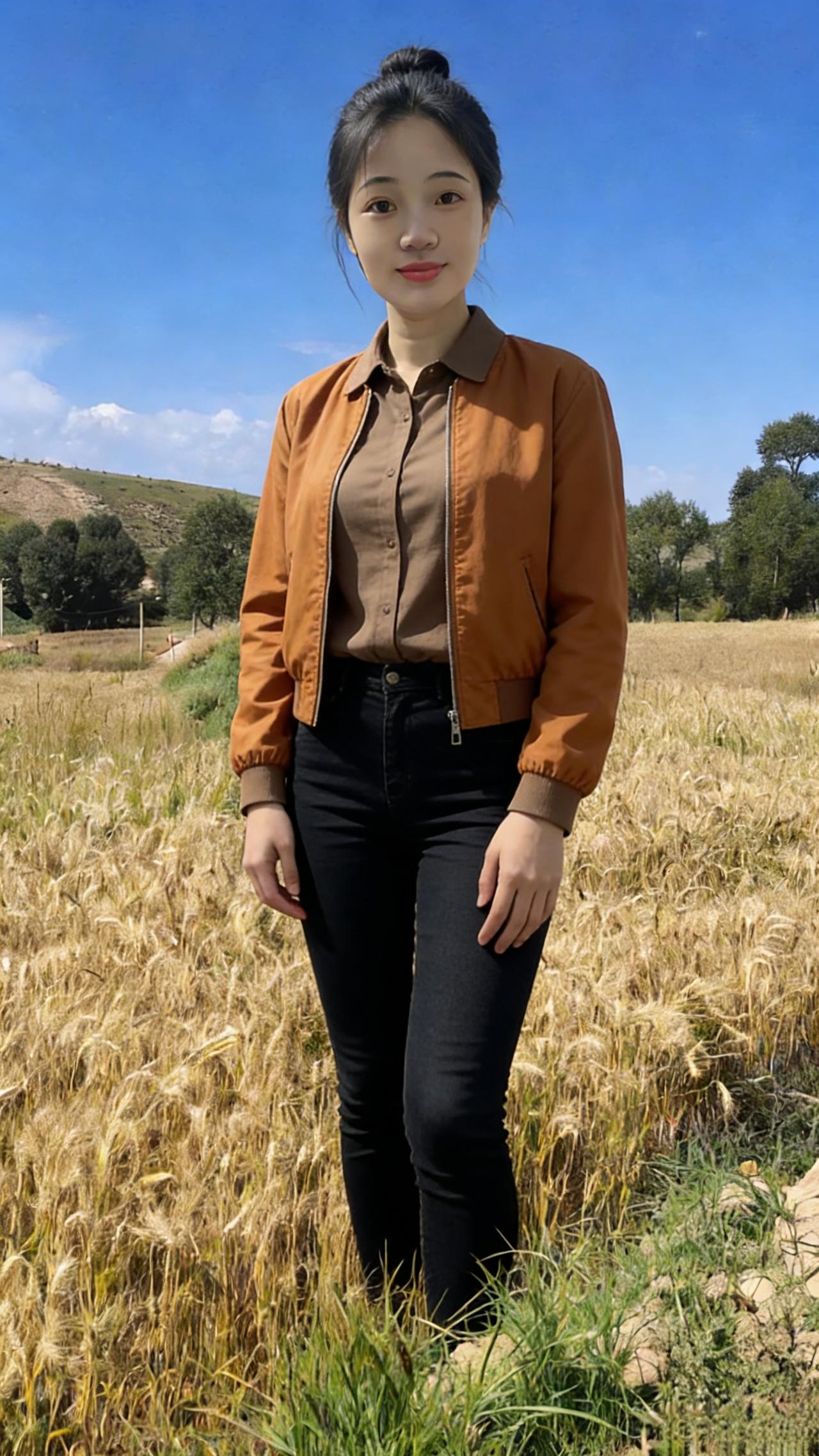 你是麦田里打翻的调色盘 焦糖、暖棕、浅粉在身上流转 短款夹克裹住午后的暖 针织开衫漏出细碎的光 黑色裤脚沾着草屑与麦香 每一步都踩在季节的脉搏上 ~ 有时你望向云起的地方 睫毛上栖息着流浪的风 有时你静立成一幅画 让蓝天做幕,麦田当床 那些被阳光镀亮的发丝 是比麦芒更柔软的锋芒 我们不必追问花期 此刻的相遇,已是最盛大的绽放 在金黄的褶皱里 藏着整个秋天的温柔与坦荡