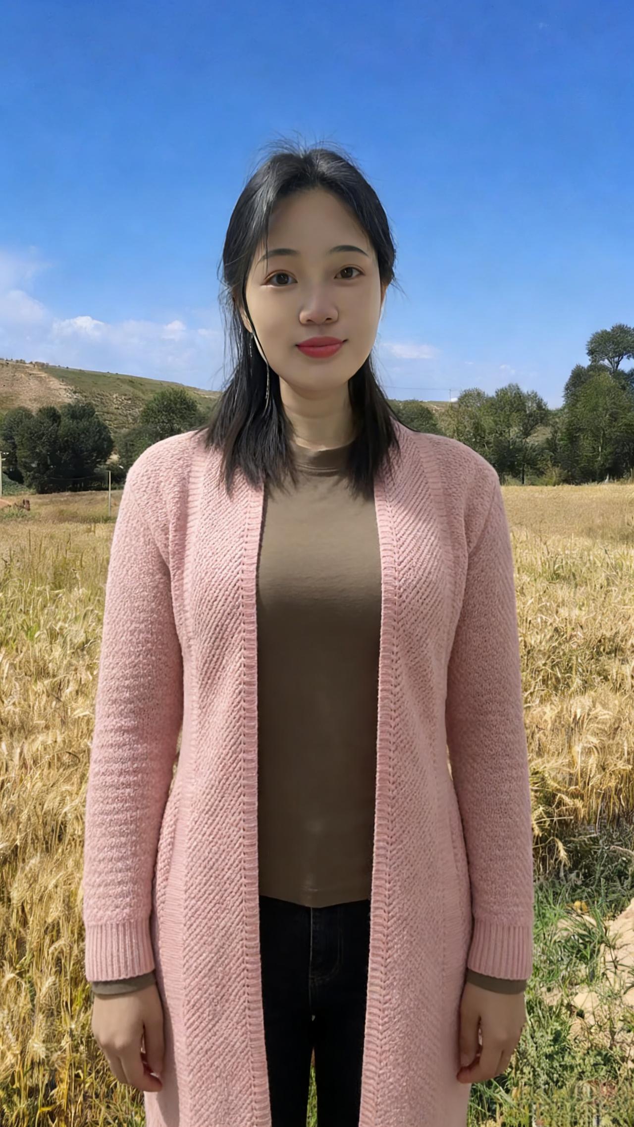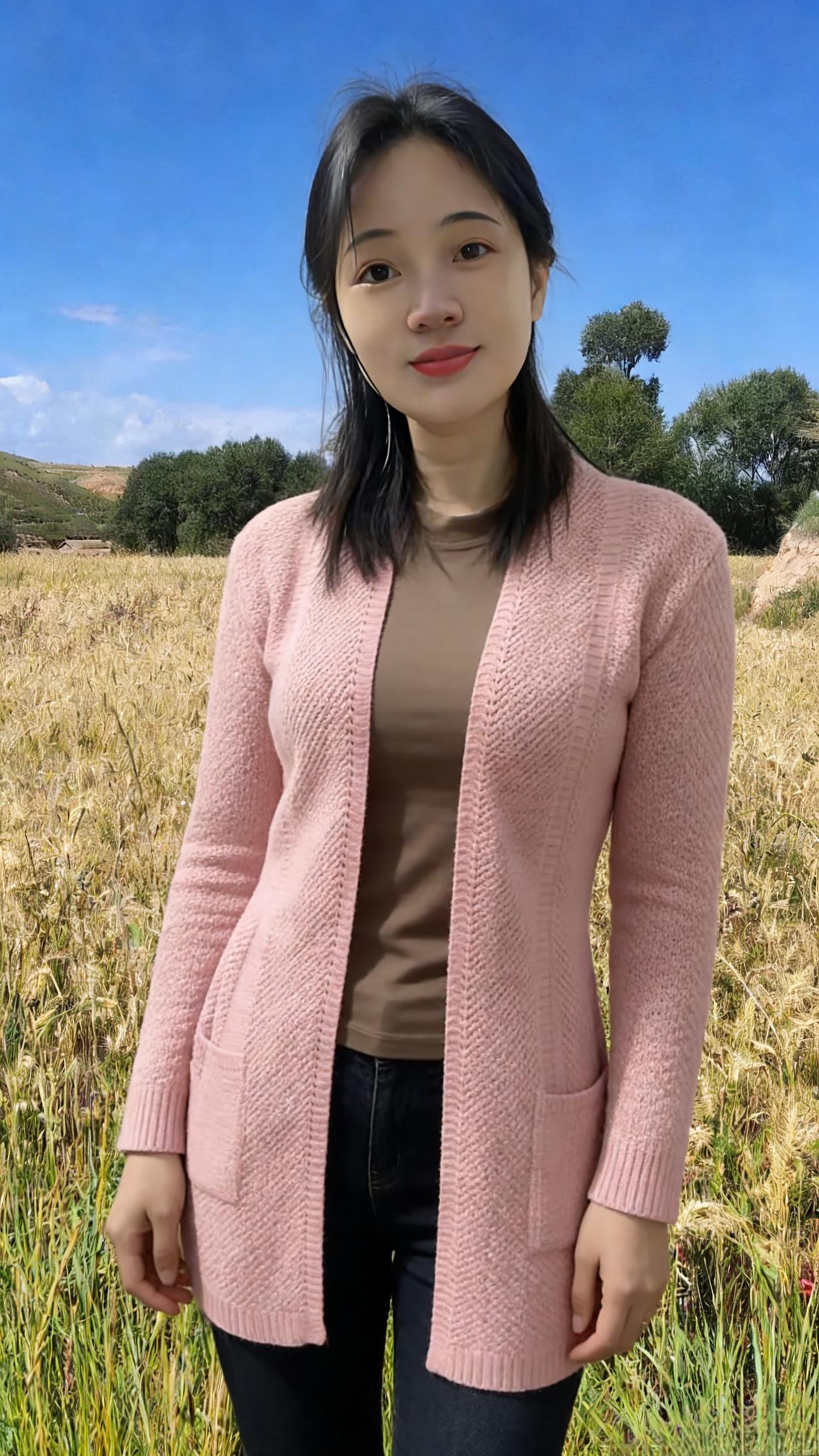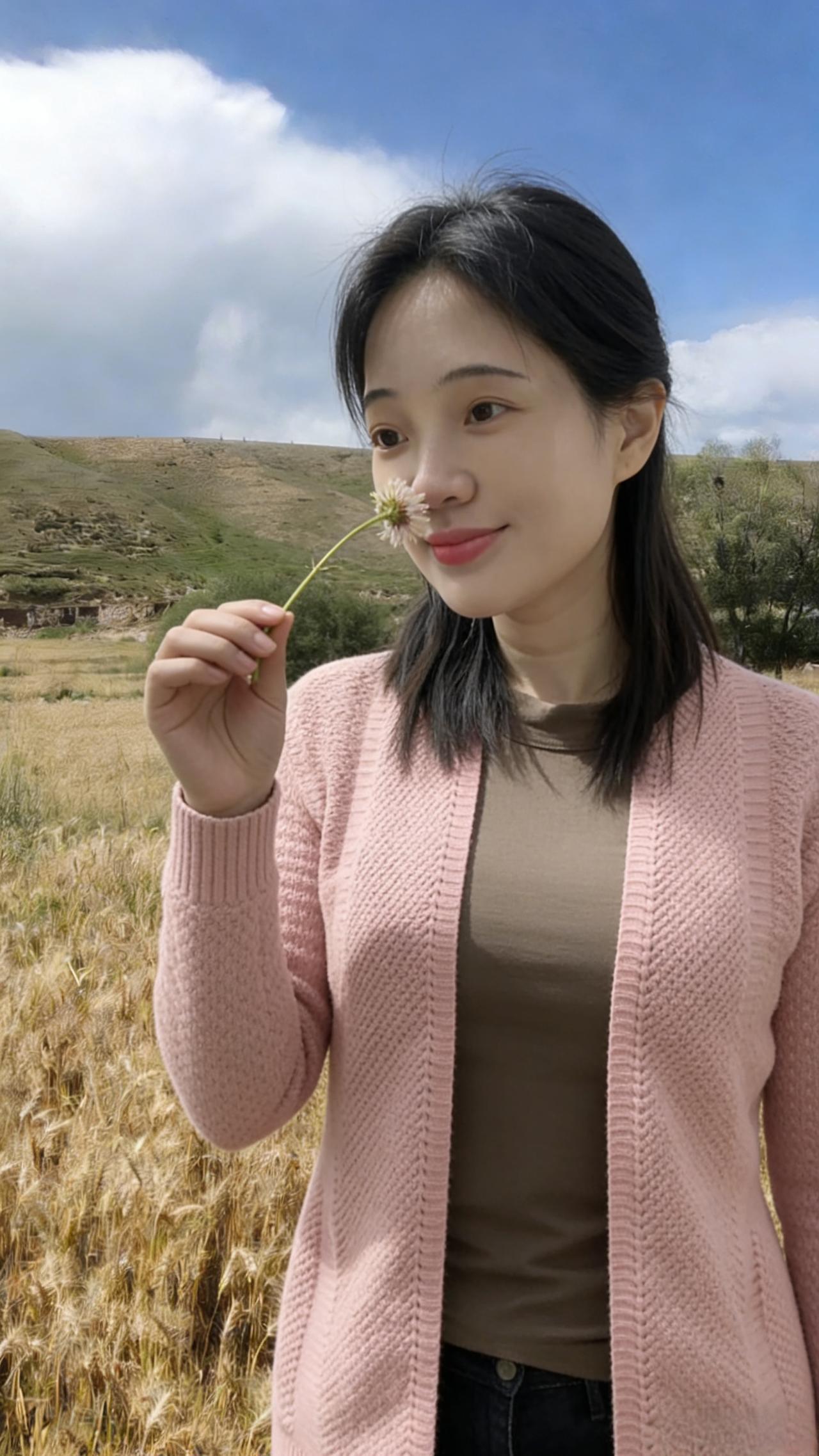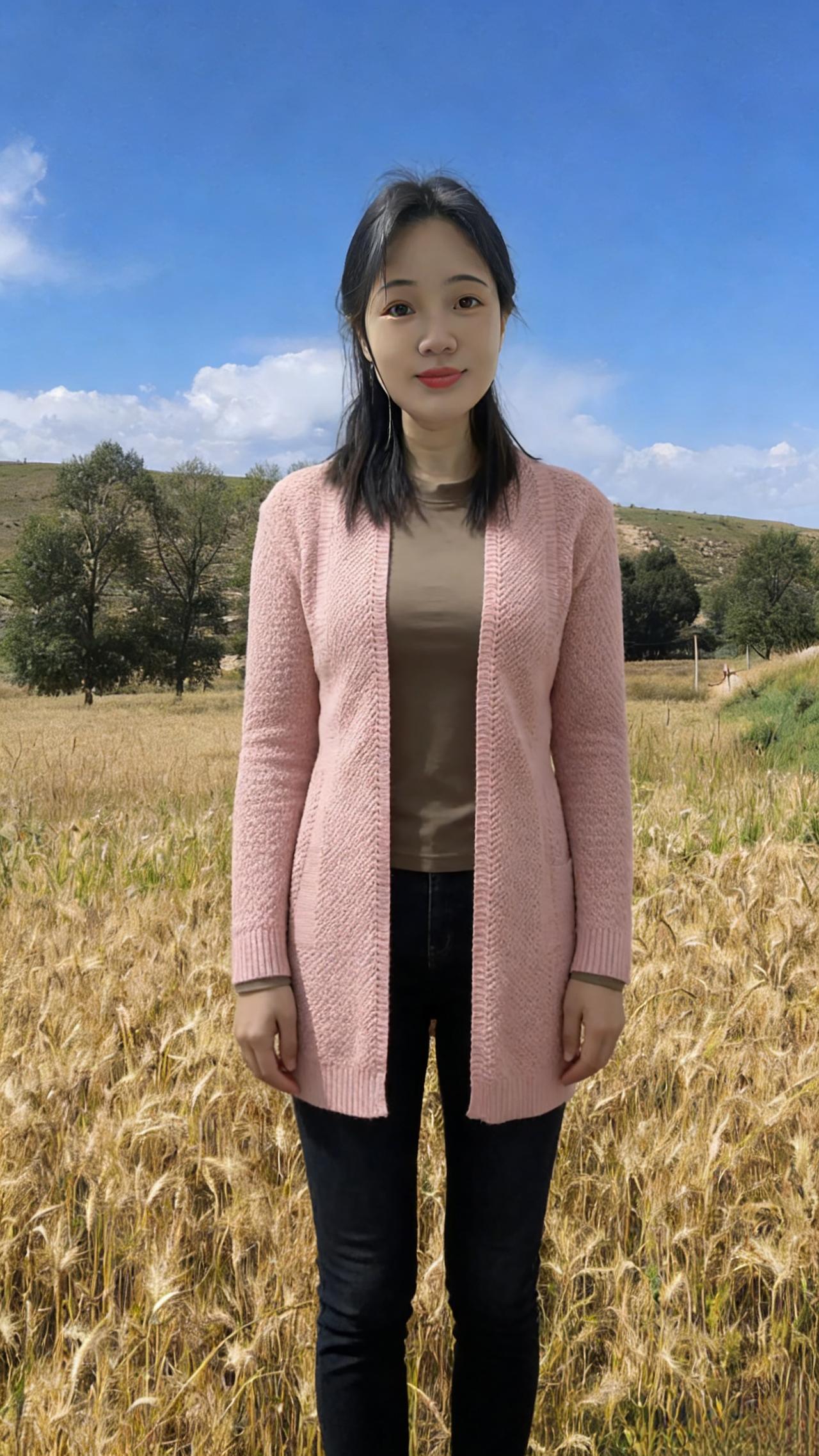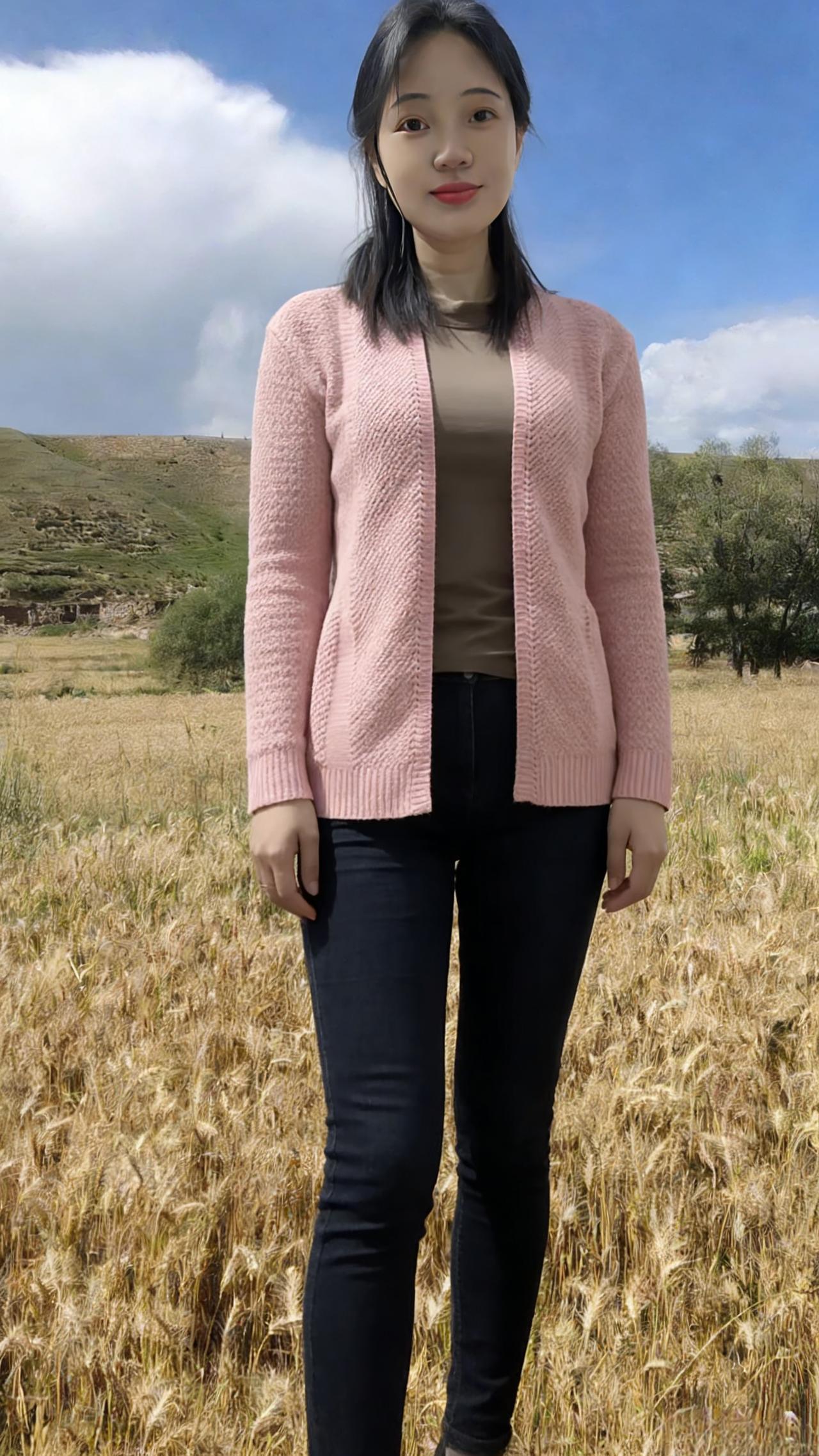 你是麦田里打翻的调色盘 焦糖、暖棕、浅粉在身上流转 短款夹克裹住午后的暖 针织开衫漏出细碎的光 黑色裤脚沾着草屑与麦香 每一步都踩在季节的脉搏上 ~ 有时你望向云起的地方 睫毛上栖息着流浪的风 有时你静立成一幅画 让蓝天做幕,麦田当床 那些被阳光镀亮的发丝 是比麦芒更柔软的锋芒 我们不必追问花期 此刻的相遇,已是最盛大的绽放 在金黄的褶皱里 藏着整个秋天的温柔与坦荡
