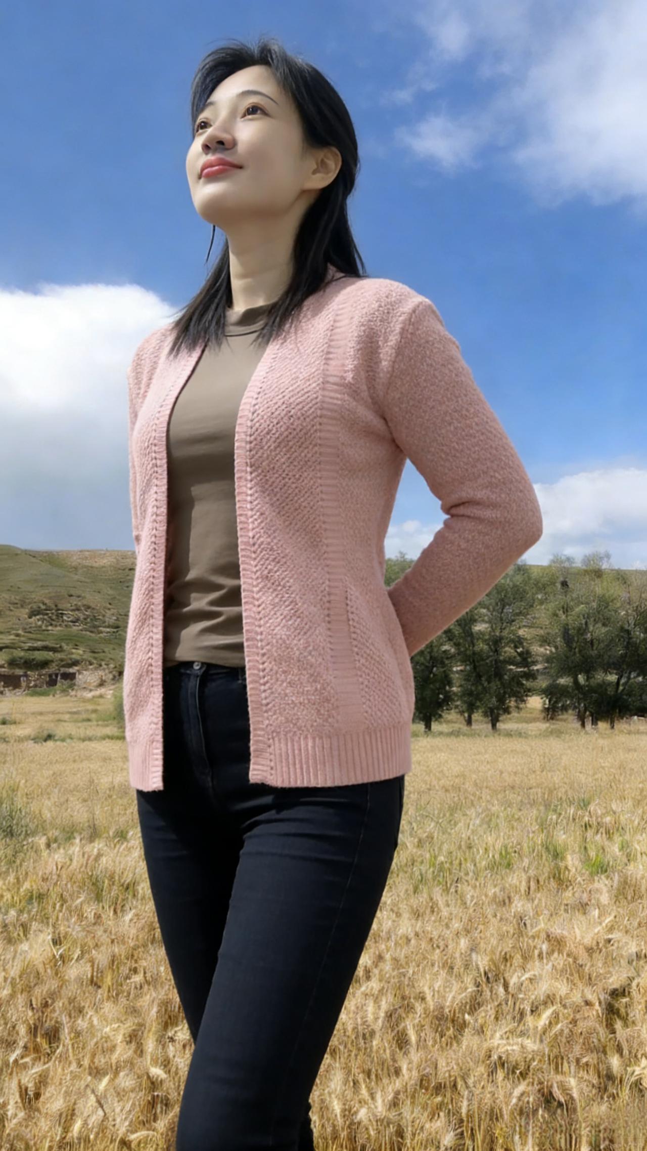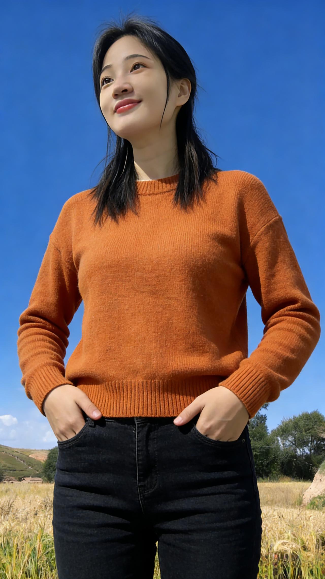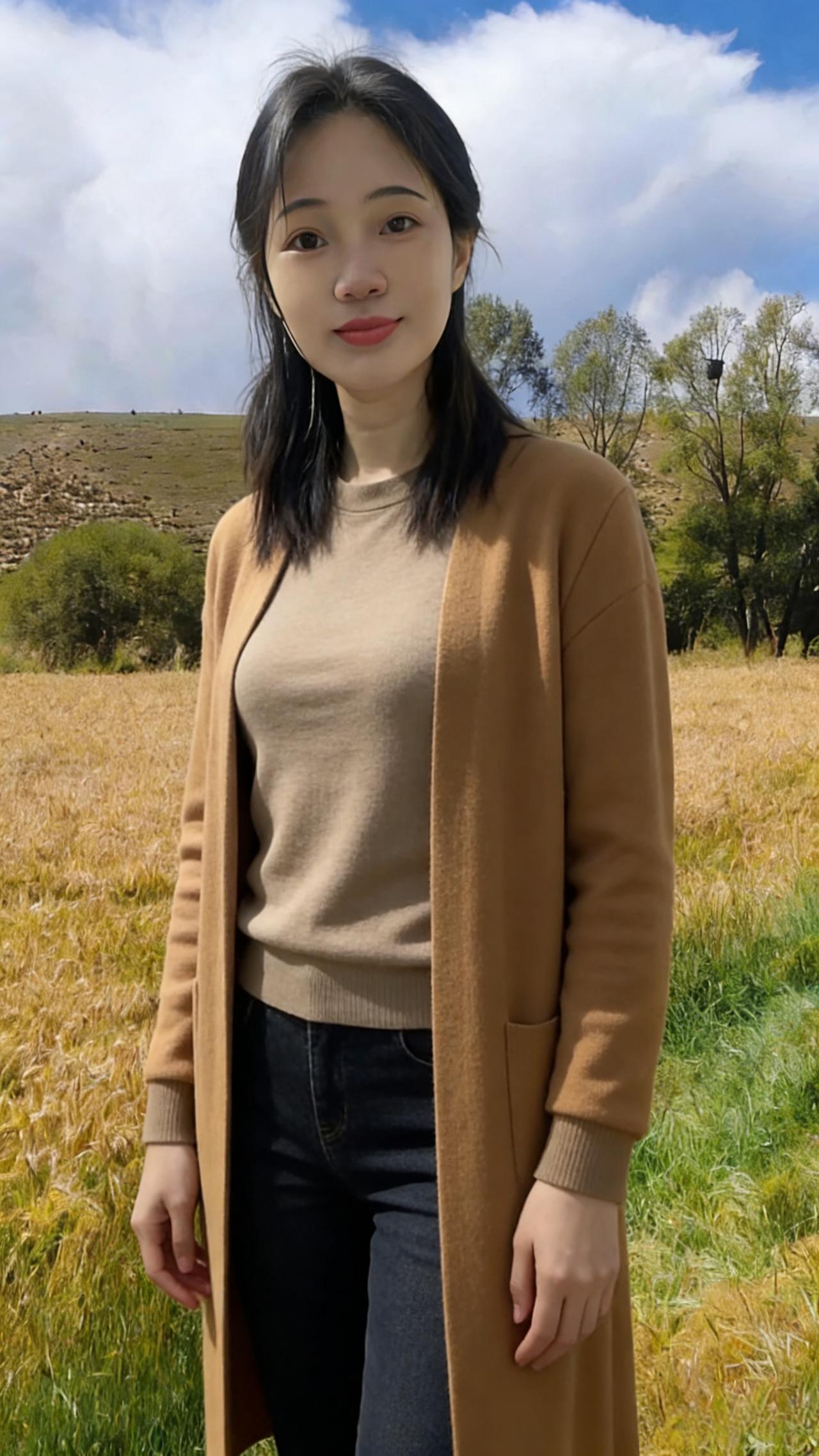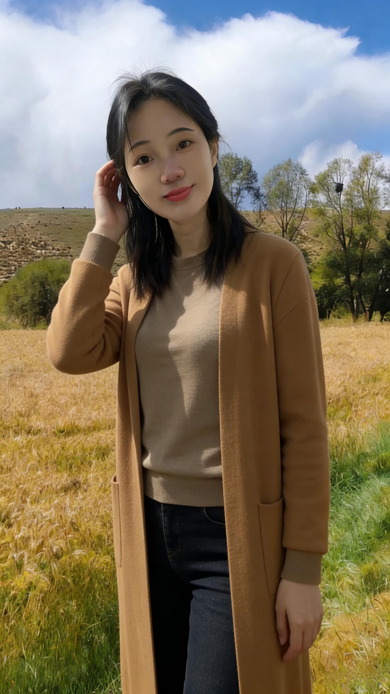 你是麦田里打翻的调色盘 焦糖、暖棕、浅粉在身上流转 短款夹克裹住午后的暖 针织开衫漏出细碎的光 黑色裤脚沾着草屑与麦香 每一步都踩在季节的脉搏上 ~ 有时你望向云起的地方 睫毛上栖息着流浪的风 有时你静立成一幅画 让蓝天做幕,麦田当床 那些被阳光镀亮的发丝 是比麦芒更柔软的锋芒 我们不必追问花期 此刻的相遇,已是最盛大的绽放 在金黄的褶皱里 藏着整个秋天的温柔与坦荡