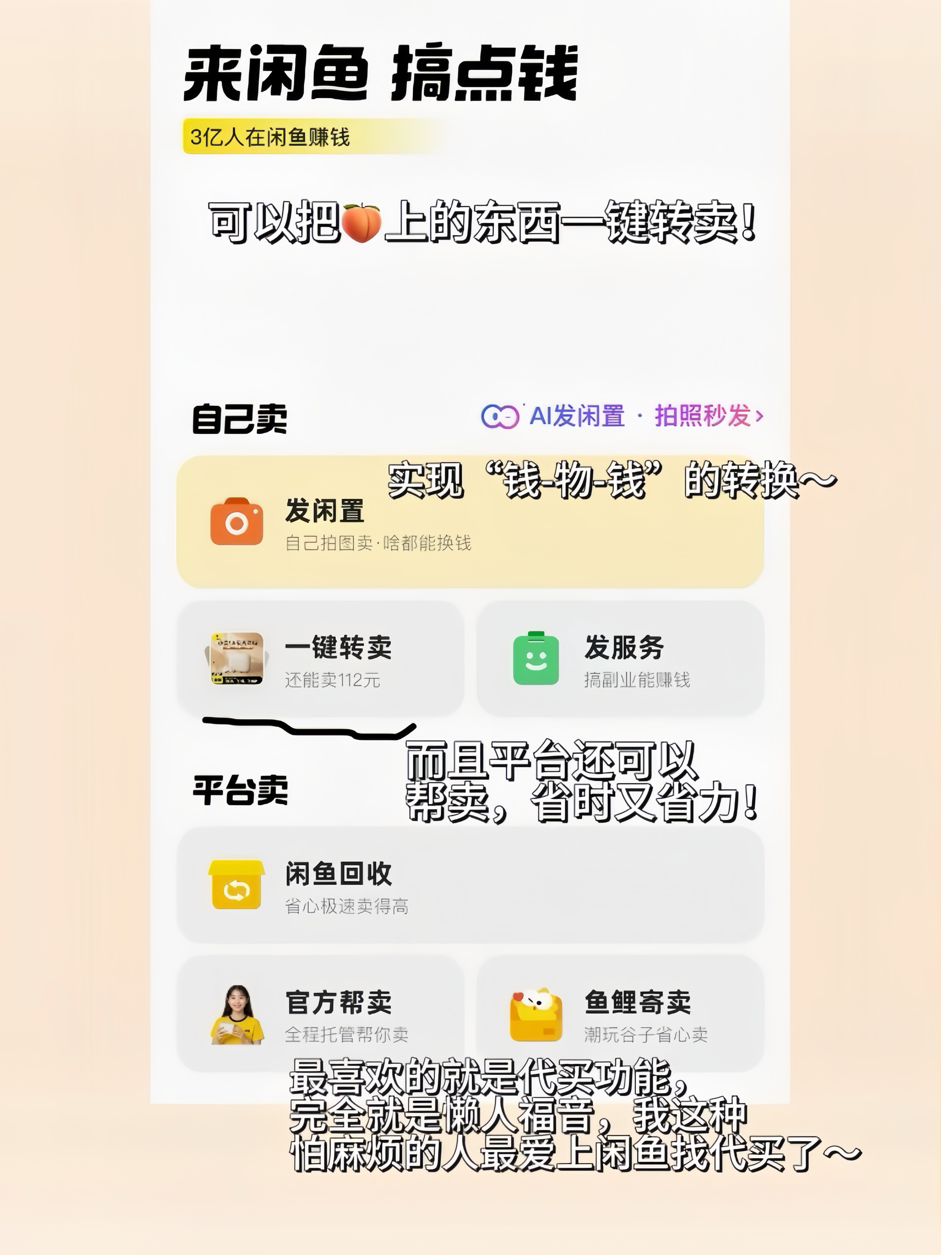 闲鱼真的是一个很有潜力且超级实用的平台!马上春节了,我发现在闲鱼上买东西真的实惠好多好多…而且品类很齐全!日常我会在闲鱼买一些小吃套餐,例如冰淇淋、奶茶、炸鸡,牛蛙之类的,在闲鱼上团卷真的会便宜超级多!其次会在闲鱼能买到一些平时淘不到的小玩偶!在别的地方买不到,在闲鱼可以碰运气买到的心情真的很不一样!超级开心!还有就是日常需要的手表、相机等,过春节这样的大节日都可以拍照留念,日常还可以测心率看身体状况变化~春节超级多的电影上线,在闲鱼买电影票会优惠很多,而且操作超级方便,还会赠送小吃等,同样的价格甚至更低的价格,享受更好的待遇~春节即将来了,衣服、饰品、吃喝玩乐都可以去闲鱼,真的会划算很多,而且日常不用的一些闲置也可以走闲鱼,既能省钱又能赚钱,何乐而不为呢~点击链接跳转闲鱼省钱00后的年货闲鱼买 年年有鱼