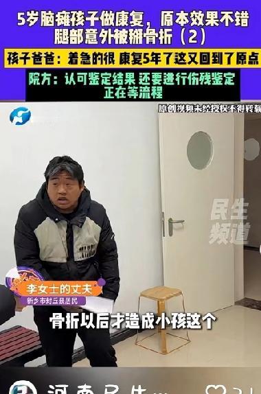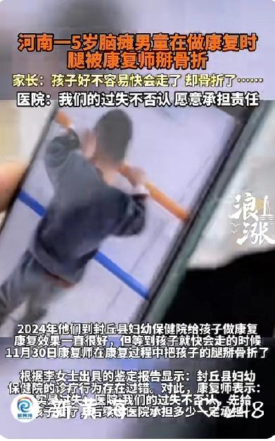 5岁脑瘫男童做康复训练时腿被康复师掰骨折!家长“好不容易快会走了,骨折了” 据河南广播电视台“小莉帮忙”报道,新乡市封丘县的李女士于2019年早产生下一名男婴,因早产仅1斤多,孩子被确诊为脑瘫。此后5年,夫妻俩辗转各地为孩子求医康复,2024年入驻封丘县妇幼保健院后,孩子康复效果显著,已接近能独立行走。 然而,2024年11月30日的一场康复训练却击碎了这个家庭的希望。当天,康复师在为孩子进行腿部训练时,因操作力度不当导致孩子左股骨骨折。孩子随即转院至封丘县人民医院接受治疗,原本五年的康复成果付诸东流。李女士提供的司法鉴定报告明确显示,封丘县妇幼保健院的诊疗行为存在过错,与孩子的骨折损害后果存在直接因果关系,建议过错参与度为100%。面对质疑,涉事康复师承认“没掌握住劲,确实是过失”,医院副院长也明确表示认可鉴定结果,同意先行垫付部分治疗费用,但后续赔偿需等待伤残鉴定流程及法院判决。 孩子父亲在采访中满是焦灼与无奈:“康复5年了这又回到了原点”,一句话道尽特殊家庭的辛酸。据悉,目前双方已就初步治疗费用达成一致,但孩子后续的二次康复及伤残赔偿仍在等待流程推进,这场意外给本就艰难的家庭又添重创。 脑瘫儿童骨质本就相对脆弱,康复训练需建立在精准评估与规范操作之上,“没掌握住劲”不是理由,是康复师专业素养的不足和机构安全管理的缺位。五年康复心血一朝归零,不仅让孩子承受身体痛苦,更给家庭带来沉重的精神与经济压力。