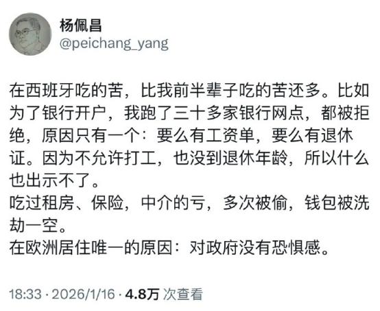 2026年1月16日,北大毕业的中国学者杨佩昌,在个人社交账号发文,引起极大争议!网友:这是对政府有恐惧感?   文字洗脑非常的恐怖,恐怖的点在于一些文章表面,是在发表其他国家的不好之处,但实际上却是在暗指我们国家不好。作为北京大学毕业的著名学者杨佩昌,近日的一发文就引起了极大争议。   2026年1月16日的时候,他在个人社交账号发文指出,自己在西班牙吃的苦,比前半辈子吃的苦还多。并且给出了具体的例子,例如为了银行开户,跑了30多家的银行网点都被拒绝。原因只有一个,要么有工资单,要么有退休证。   又例如他强调自己在租房,保险中介方面吃了很多的亏,钱包更是多次被偷等。看到这会以为他是在说,西班牙这个国家存在非常严重的社会安全隐患。   但实际上并不是,因为在最后的时候,他表示在欧洲居住的唯一原因是“对政府没有恐惧”。也正是这一句话,让他陷入了舆论的争议。   不少网友反问,对欧洲政府没有恐惧感,是不是对中国政府有恐惧感,又为何会有恐惧感,难道是做了违法犯罪的行动?   网友的这一说法目前还只是猜测,但是他的这一发文却警告了我们,一定要杜绝文字“洗脑”。记得网络上流传过这样一句话,叫“知识越多越反动”。   这样看来或许真的如此,对此,您怎么看?欢迎评论区留言你的看法,我们一起讨论一下。 (信息来源:杨佩昌-个人账号(20260116))