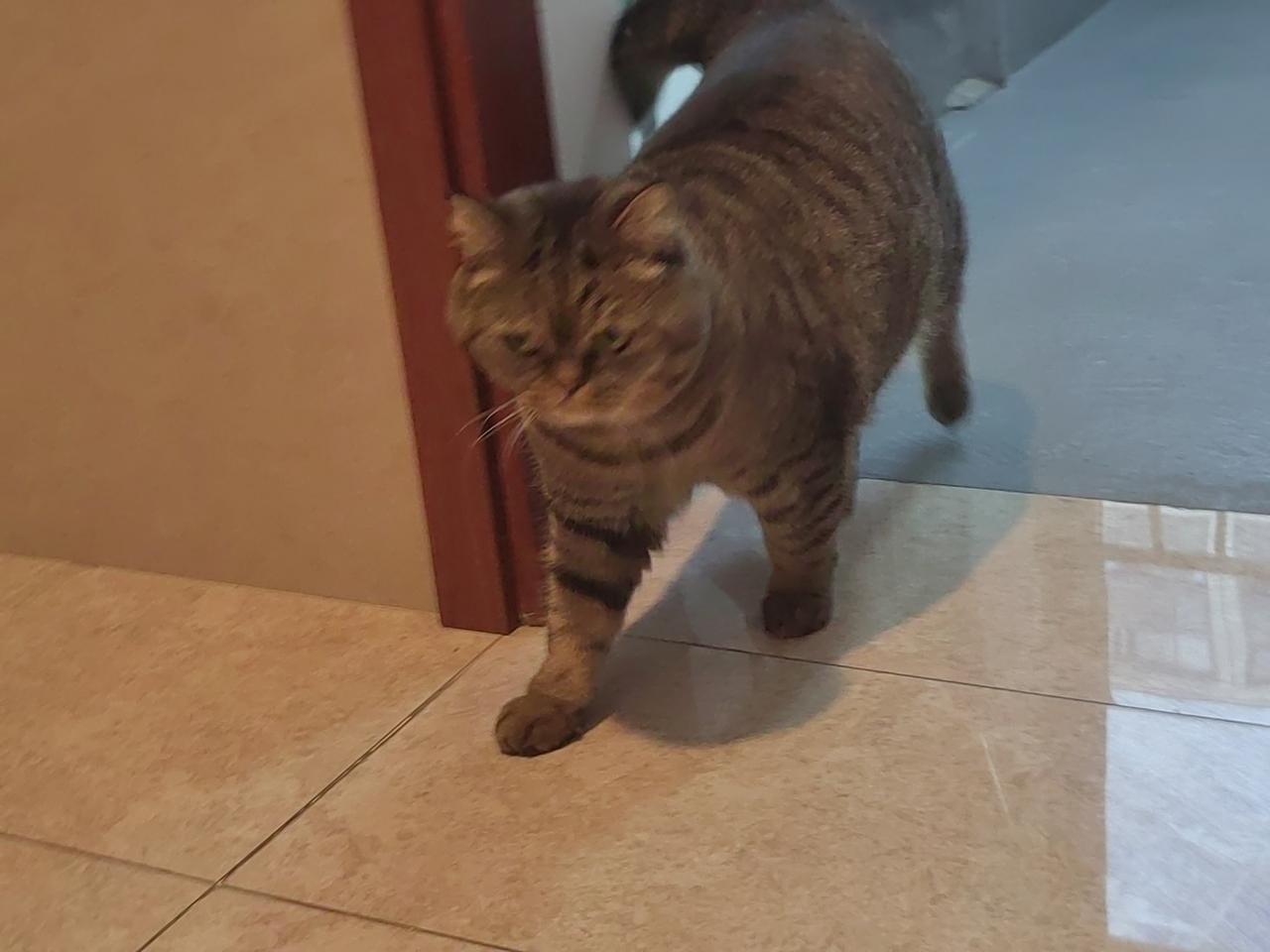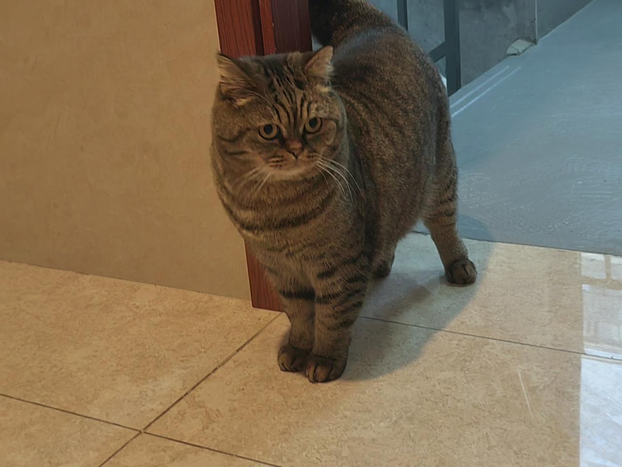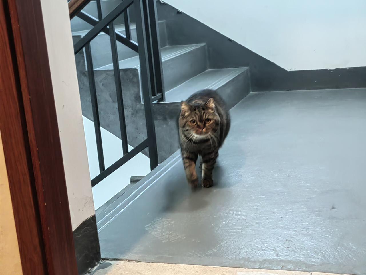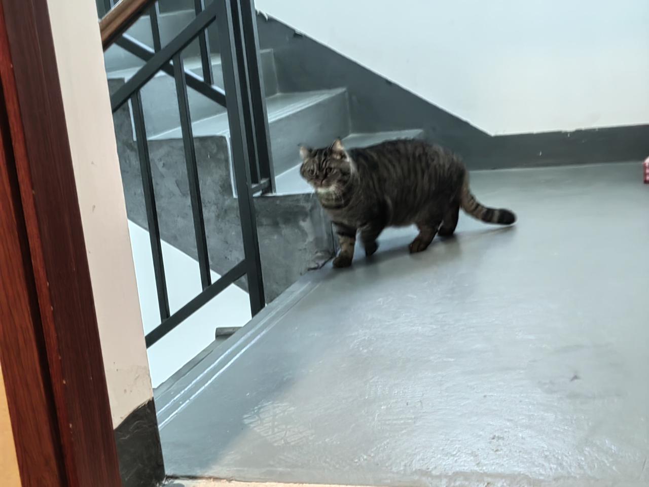 这个小家伙个子可不小! 刚刚下楼去处理了两捆家里旧书、报纸,回到家门口正浏览单位工作群的信息(还没开门)。这时候感觉左腿外侧有什么东西擦碰了一下,看了一下居然是邻家的大肥猫。个子真不小!特别是它的上背部和下腹部间的尺寸,我觉得它至少比一般的猫咪大四分之一的尺寸!威武!