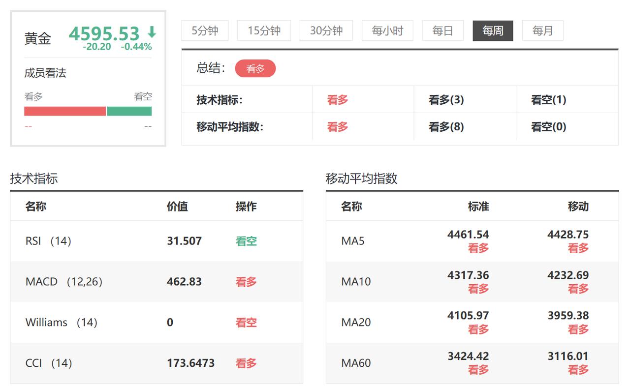 本周黄金大幅飙升, 伦敦金也就是现货黄金 收盘于4595.53美元。 未来如何运行概率比较大? 简单通过技术进行分析。 通过下图,可以明显看出: RSI、MACD 、Williams 、CCI等 四项技术指标, 有三项指标看多,只有RSI看空。 移动平均指数等八项指标中, 则是全部看涨的。 如果简单通过技术分析, 可以看出未来一周, 金价有望继续走强上涨!
