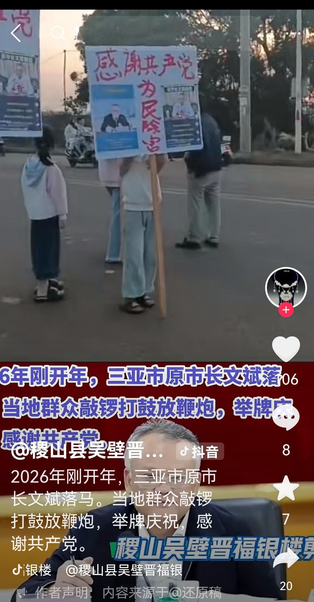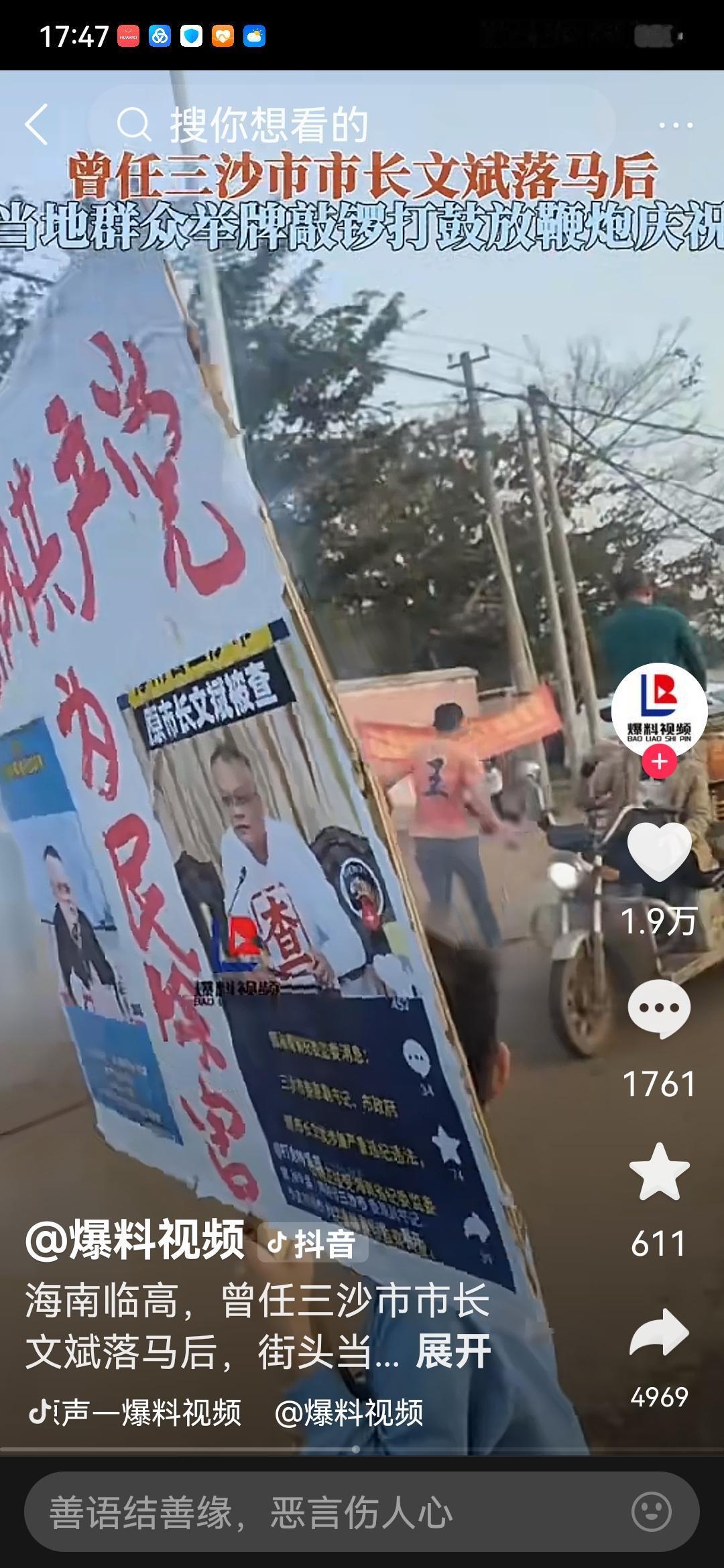 为什么说纪委部门抓三沙市原市长文斌抓得好? 因为能得到群众的公开支持,说明我们纪委监委的反腐败和广大群众的意愿形成了共识和共鸣。 在网上看到临高县的群众举着共产党为民除害的牌子,牌子上是纪委部门对文斌的审查调查通报和简历,一路敲锣打鼓,放着鞭炮,最后聚集在临高县博后镇大雅村村委会门口,大家扬眉吐气,喜笑颜开,庆祝文斌被查。 这样的场面在国内是很少的,一个县委书记,能够在当地激起如此的民愤,能够让基层群众对其恨之入骨,说明老百姓苦文斌的苛政久矣! 老百姓一般对身边的村干部,或者乡镇干部会因为一些工作开展,一些政策推动,一些作风问题形成意见不满,但是对一个县委书记这样民愤极大,实属罕见。 公开资料显示,临高县是海南省管县,陆地面积1299平方公里,人口42万人,2024年GDP261亿元,人均GDP61670元,文斌于2020年3月至2023年12月,前后不到3年的时间在临高县任县委书记,该职位行政级别是副厅级。 另外,此前文斌的前两任县委书记已经相继落马。 一个三任县委书记前腐后继的地方,可想而知,当地的政治生态被破坏的多么严重,民生事业会受到多么大的影响,对基层群众折腾的多么严重,怪不得群众对文斌被查的事件如此反应强烈,大家欢呼雀跃,兴高采烈,奔走相告,像过年一样庆祝。 这件事,第一说明纪委部门抓对了人,对群众反映问题巨大的干部进行查处符合实际,符合民意,符合群众的预期,因为群众的眼睛是雪亮的。 第二,群众对纪委部门铁腕反腐是支持的,拥护的。 第三,反腐败是我们巩固政权,取得民心的重要工作,必须持之以恒的坚持下去。海南反腐 三沙海域遇险 主持人文斌