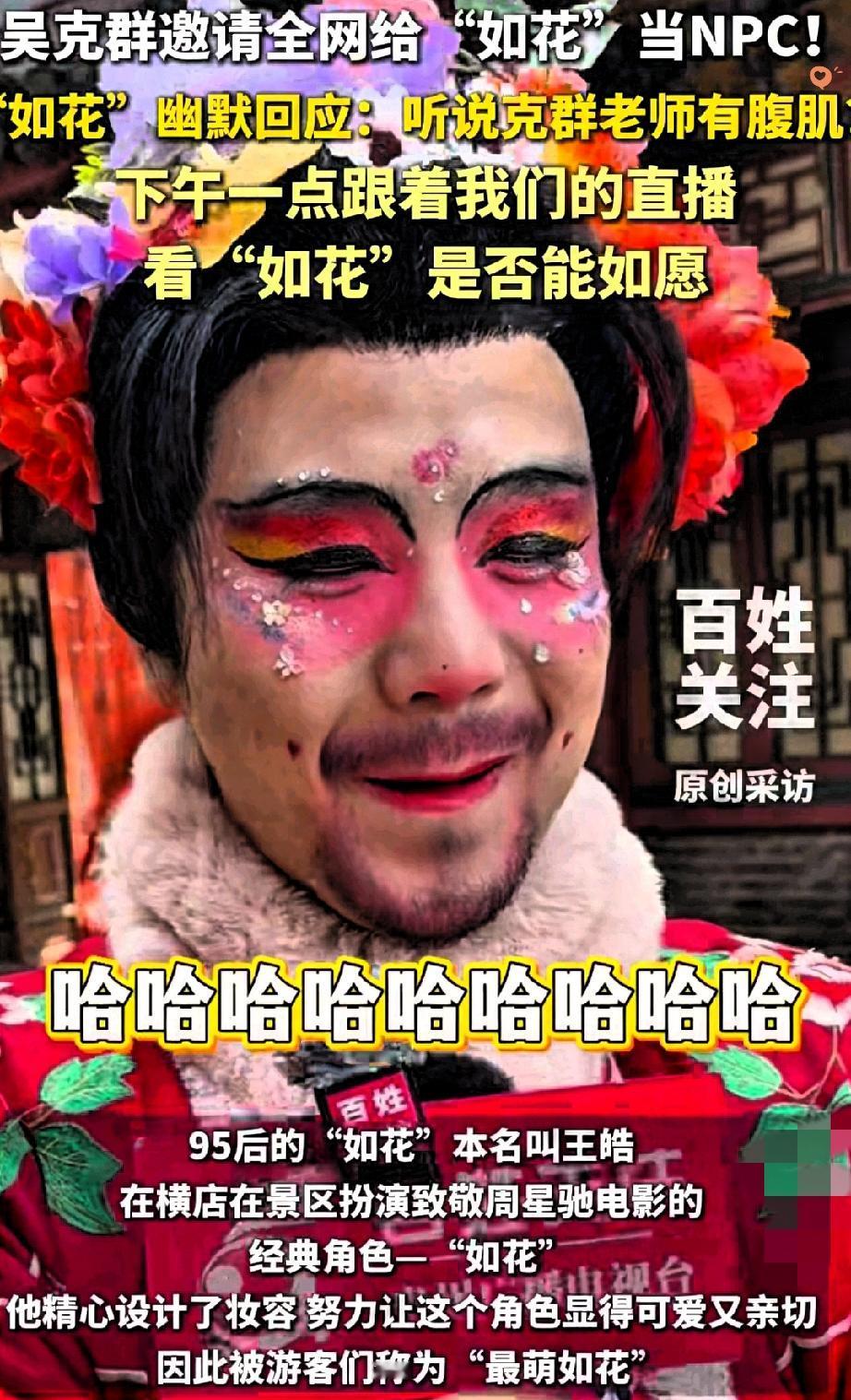“最萌如花”的暖心后续,让善意的双向奔赴照进了现实! 那个总给游客圆愿望的横店NPC,被一句“希望你快乐”戳中泪点,如今终于等到了属于自己的专属快乐——吴克群专程来扮“如花”陪他开心。 我们总习惯了那些“提供情绪价值”的人永远坚强,却忘了他们也需要被关心。 95后小伙把“如花”从丑角演成治愈符号,8年声乐教师跨界当NPC,用真心换游客的笑容,可这还是第一次有人反过来祝他开心。 他愣住的瞬间,藏着多少不被看见的疲惫。 这场走红从不是偶然,而是真诚终被善待的必然。 你对世界温柔,世界就会对你温柔回响。生活里最珍贵的,从来不是惊天动地的壮举,而是有人愿意为你停下脚步,说一句走心的祝福。 你有没有被陌生人的善意突然治愈过?评论区聊聊~