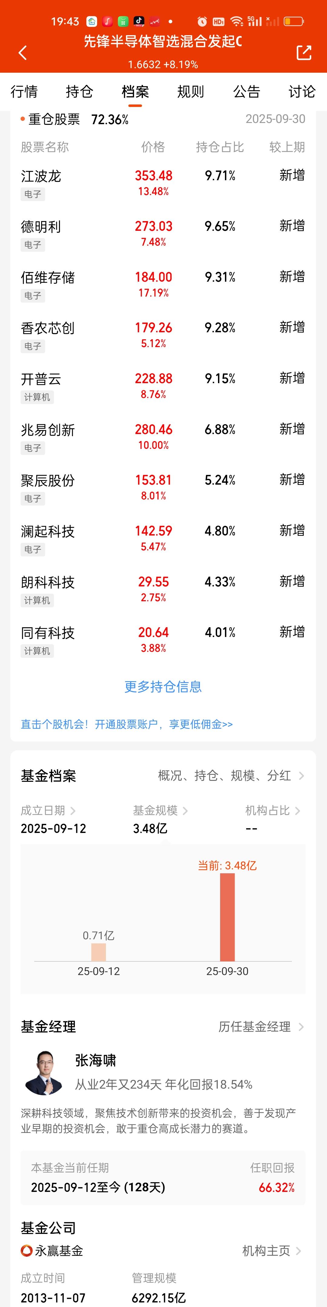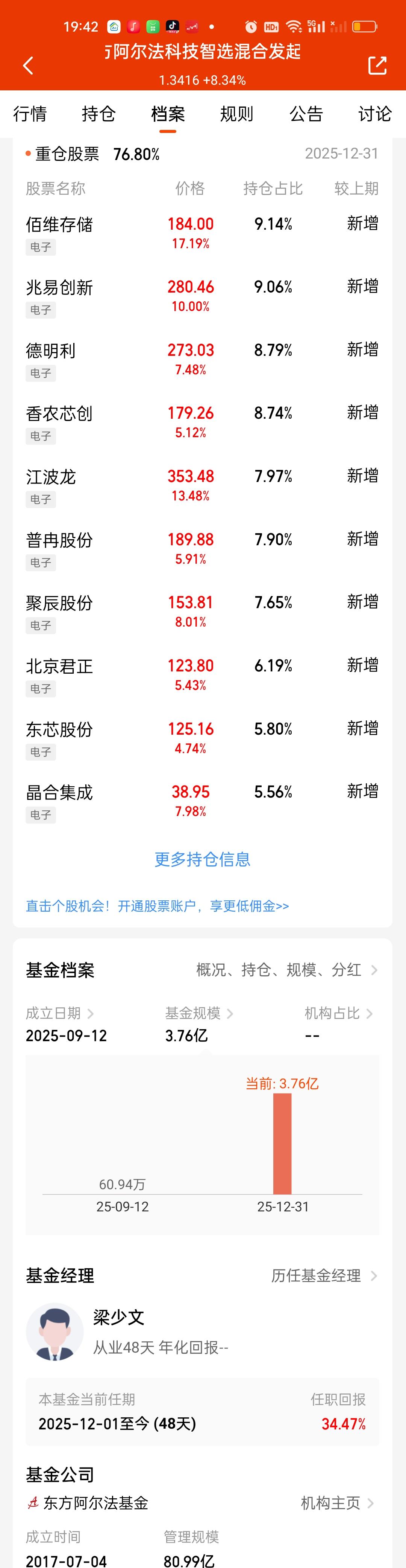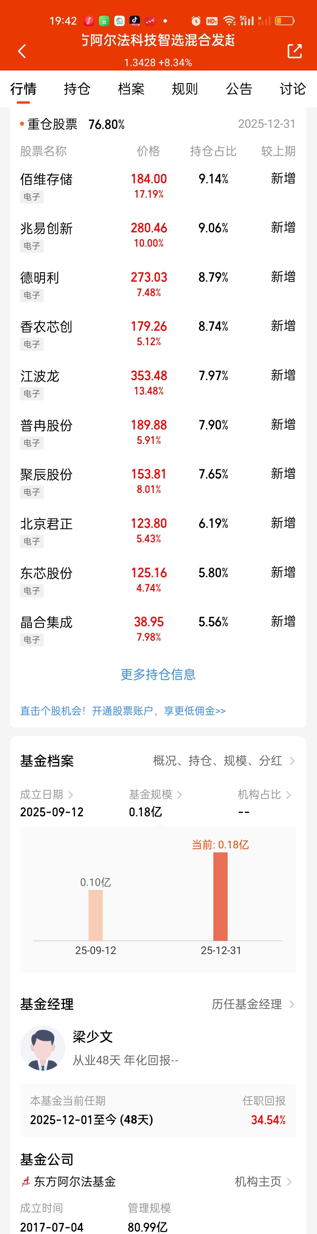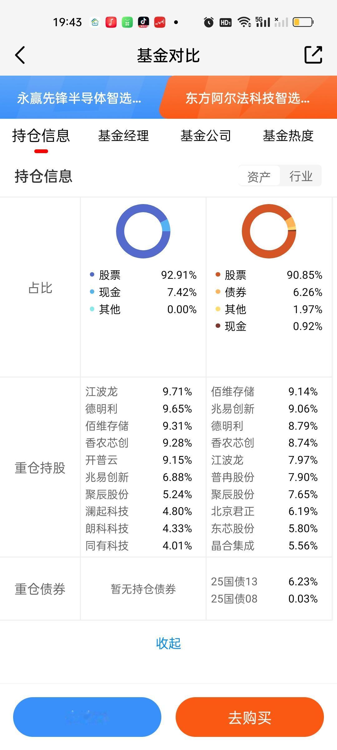 从收益率对比来看,东方阿尔法科技智选最近的表现是强于永赢先锋半导体的。千呼万唤始出来,东方阿尔法科技的持仓总算出来了,总体来看持仓风格还是挺激进的,前十大重仓股占比76.80%,要高于先锋的72.36%,风格比先锋还要更激进一些。 阿尔法科技A类规模从0.10亿涨到了0.18亿,C类份额从60.94万涨到了3.76亿,先锋最新规模没有公布依旧停留在3.48亿,但两家公司管理的基金总规模相差巨大,东方阿尔法一共只管理80.99亿,永赢管理6292.15亿。 前十大重仓股对比,两只基金有6只相同,不同的4只,先锋:开普云,澜起科技,朗科科技,同有科技。阿尔法科技:普冉股份,北京君正,东芯股份,晶合集成。 手续费方面,销售服务费率阿尔法科技低了0.20%,其它都一样。 目前永赢先锋半导体的最新持仓还没有公布,等下周最新持仓出来,会再做一次数据对比!