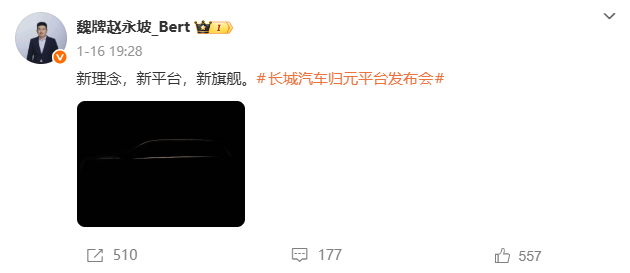 长城归元平台首款旗舰SUV预告图发布近日,长城汽车魏牌CEO在微博上发布了长城