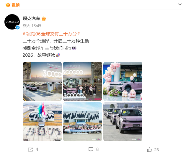 领克06第30万辆整车下线 日前,发布微博 ,官宣领克06第30万辆整车已在领克成都智能互联汽车工厂正式下线,标志着该车型自上市以来实现又一重要产销里程碑。2024年,领克06加速全球化布局,正式走向全球市场,目前已成功进入中东、东南亚、拉美、南非等核心区域。今年,领克还将进一步拓展在拉美和中东的市场版图,持续深化其国际化战略。