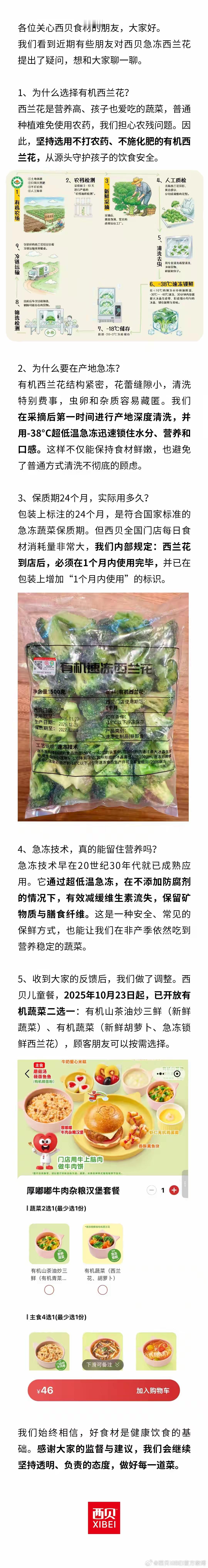 1月18日,西贝官方微博发文了,说他们的急冻西兰花,其实不仅没有问题,反而比一般西兰花更新鲜、更健康、更干净! 文章之中指出,西贝采购的西兰花,总共经过了九道工序,一是专门选择不打农药、不施化肥的有机西兰花,二是采摘之前还会专门进行农残检测,三是采摘,四是采摘之后会再一次进行人工质检是人工质检之后,会用专业清洗机清洗掉西兰花当中所有的异物、碎屑和虫子。 这里西贝微博专门提到,说西兰花这样一种蔬菜,虽然营养丰富,但是因为花蕾密集,其间缝隙小,所以特别容易藏匿杂质和虫卵,而西贝采购的西兰花,经过严格的专业处理,可以实现无农药残留、无虫卵,可以说是非常干净,远超市面上一般西兰花。 第六步,清洗之后,则是零下38摄氏度速冻锁鲜,第七步,则是在零下18摄氏度的冷库储存,第八步,从冷库出库之后,会再次进行检查,而后第九步则是通过冷链运输,去到餐桌。 西贝这里也是专门解释了一下他们西兰花的这个专业的冷冻锁鲜技术,说这样的超低温速冻,能够迅速锁住水分、营养和口感,有效减缓维生素流失,保留矿物质与膳食纤维,保证西兰花的健康与美味。 整体而言,西贝官方微博进行这样科普之后,得出结论,其实西贝的西兰花,比市面上一般西兰花,要更加新鲜、干净、健康。尤其是无农药残留,无虫卵,无异物,更是正儿八经的有机西兰花。 看完之后,个人感觉,这篇科普还是说得勉强有一定道理,西兰花的确是一种很难清洗的蔬菜,由于花蕾密集,里面很容易潜藏虫卵、异物等东西,西贝的西兰花,经过专业清洗,如果真的能够去除农残、虫卵、异物等,的确是比较干净,急冻锁鲜之后,如果真能在一个月内用掉,也不算太过分。 只不过,仅仅只是这样的科普,似乎还有些不够,因为就算是这个西兰花真的还有一定道理,那么值钱开放后厨暴露出来的其他东西呢?西贝是不是也需要进行一下解释?比如说那个很便宜的食用油,还有那些羊排、酸汤酱调料包、海鲈鱼,等等。 西贝想要改变自己在人们心中的形象,还是需要对这些其他问题,也都一一进行一个解释说明才行!