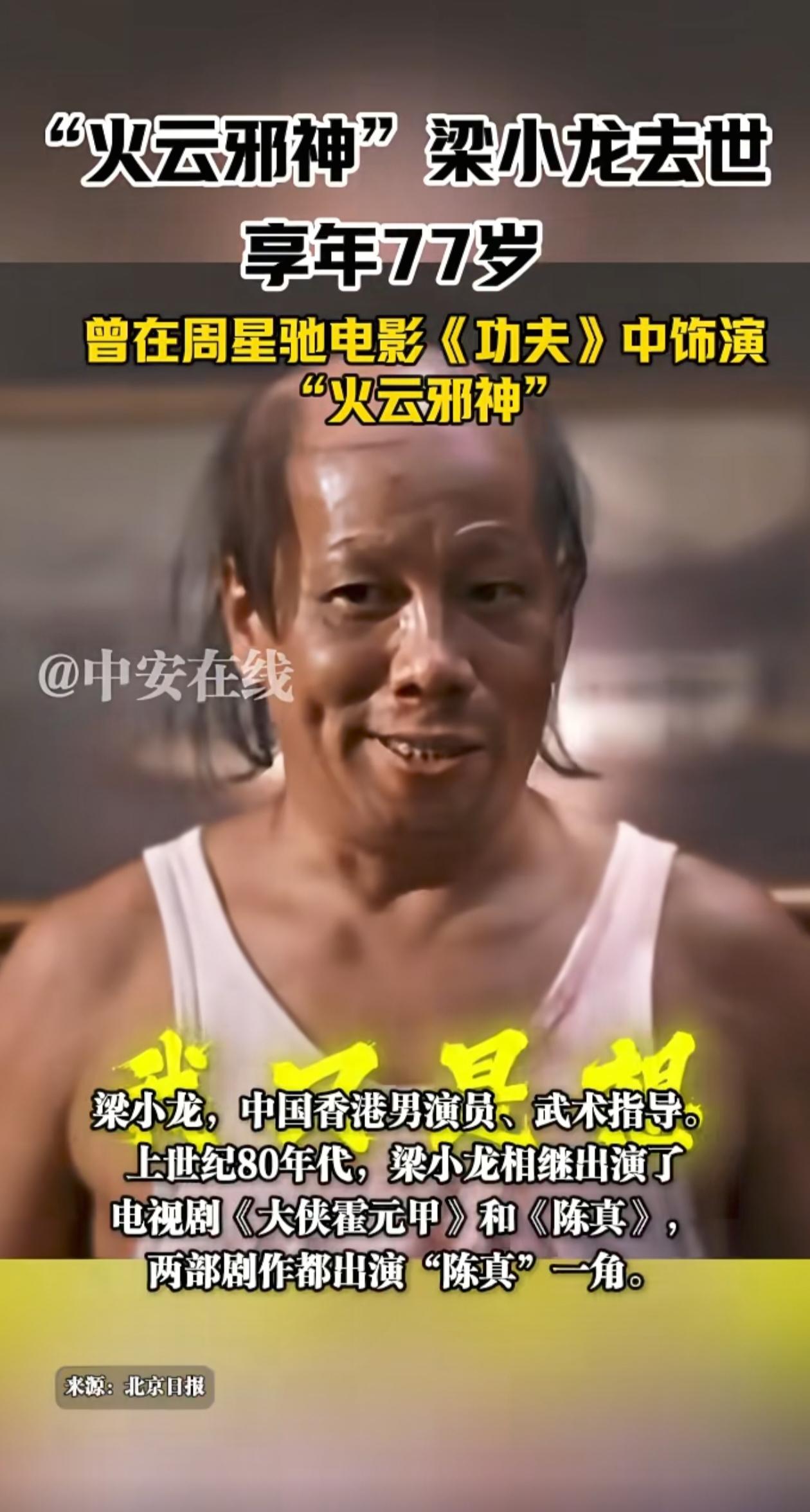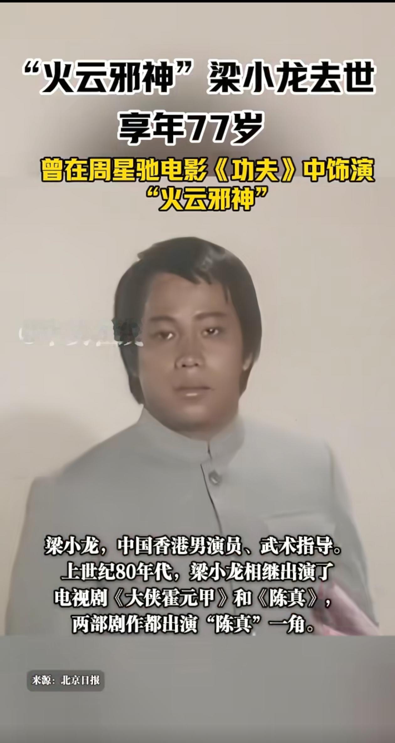 功夫巨星梁小龙“陨落“,享年77岁,记得不久前还看到他和别人“过招”,他说即便是七十多岁,对于普通人来说,他同时干倒几个没有问题。练武之人原本身体很硬朗的,这次没有征兆就离开了[祈祷]唉!他演的火云邪神”“陈真”这些硬角色观众印象太深了。