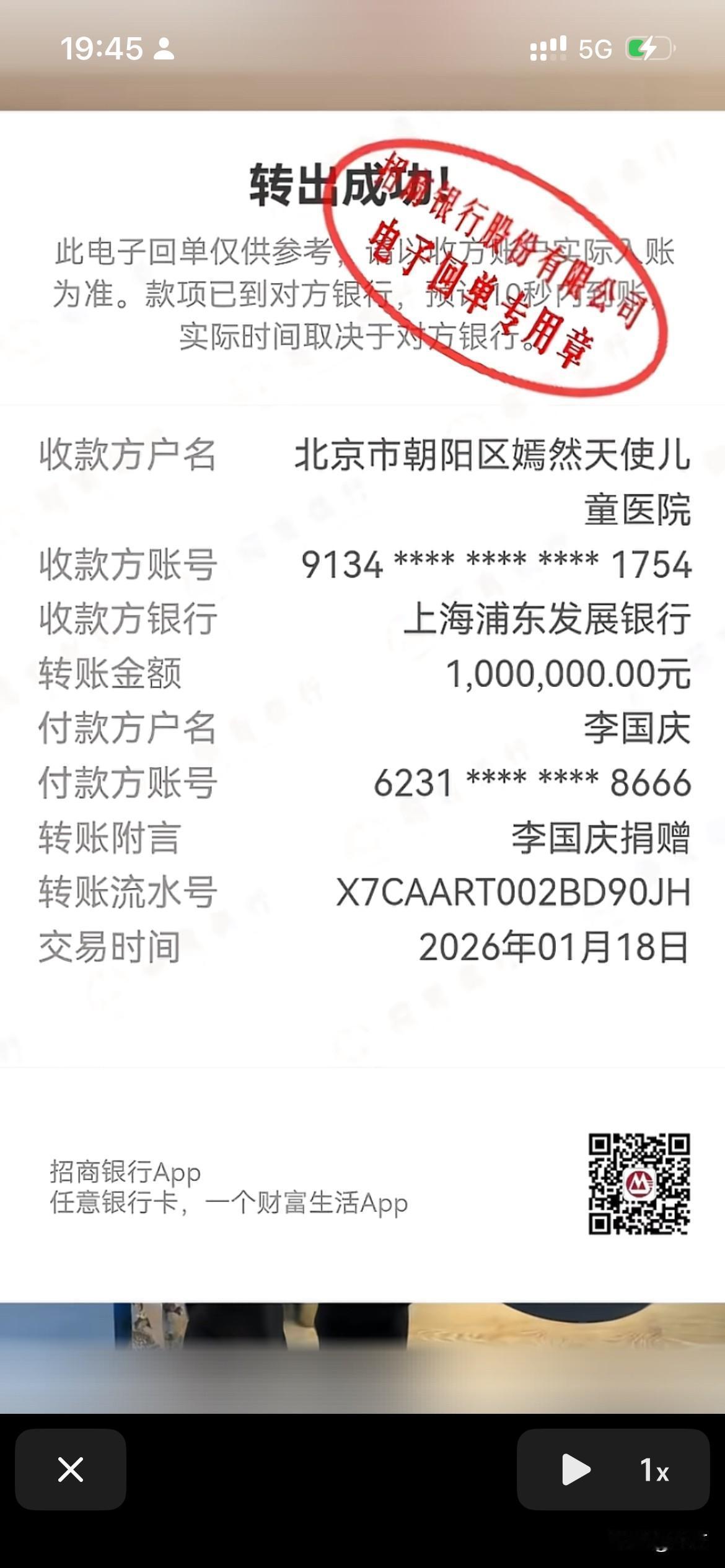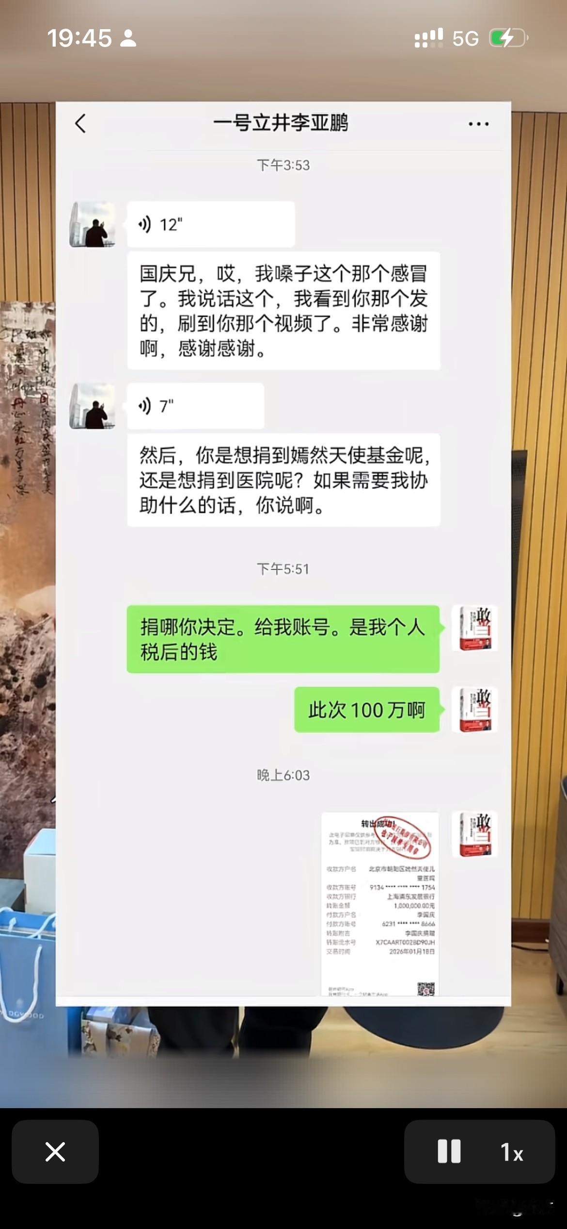 李国庆向嫣然儿童医院捐了100万! 今天晚上,李国庆在社交网络晒出了张捐款单,他以个人的名义向嫣然儿童医院捐了100万。 其实在这之前,李国庆就专门发了一个视频,在视频里面他呼吁大家 ,量力而行的支持这个医院,不能让这个运行了十几年的的公益医院,就这样没了。 所以上一个视频发出来之后,引起来很多人的共鸣,没想到,李亚鹏也看到了,所以他主动给李国庆发微信了。 没想到李国庆非常的性情,他说自己非常相信李亚鹏,所以直接以他个人的名义,税后给儿童医院捐了100万。 李亚鹏问他,就这个钱如何去使用,毕竟这不是一个小数字,可以根据捐献意愿,去定点的进行帮扶需要的人,李国庆也非常的大气,表示自己完全信任李亚鹏,这个钱可以根据目前这个医院的实际情况去使用。 所以在这个视频的最后李国庆也再次呼吁大家,尽可能的去支持一下这个医院,但是一定要量力而行,不管捐多少,都是一份自己的爱心。 其实这几天累计起来,大家共同的捐款已经超过1000万了,而且李亚鹏在直播的时候,他也说过,所有的东西全部都会公开出来,包括他在直播时候,大家给他的打赏,他也会全部公布出来。 而且今后这些钱的每一个使用细节,都会把详单公布出来,让每个人能够看到自己的爱心去了哪个地方,毕竟他们这个医院已经运行这么多年了,确实帮助到了千千万万的儿童,这背后就是千千万万个家庭。