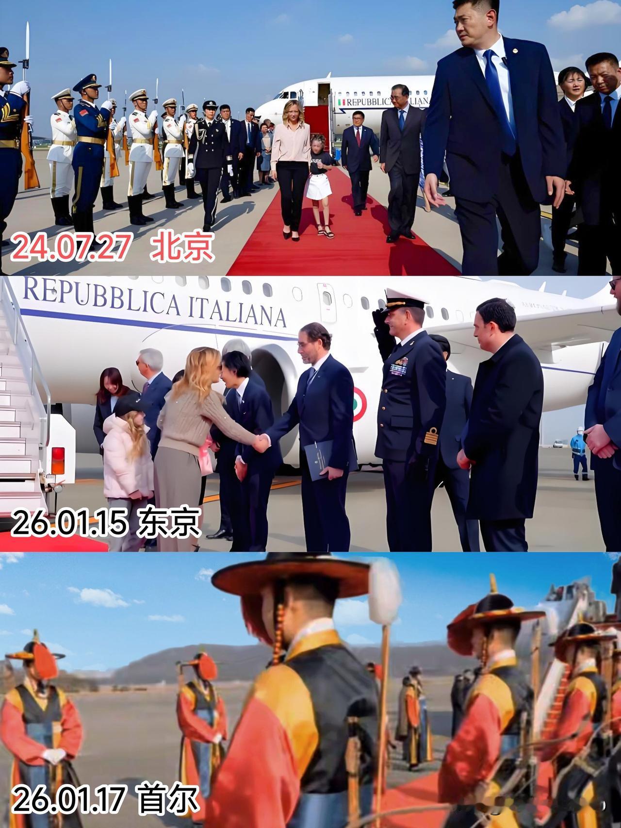 梅洛尼访问中日韩...只在中国,下飞机全程不戴墨镜。 看阵仗,就判定了外访级别!