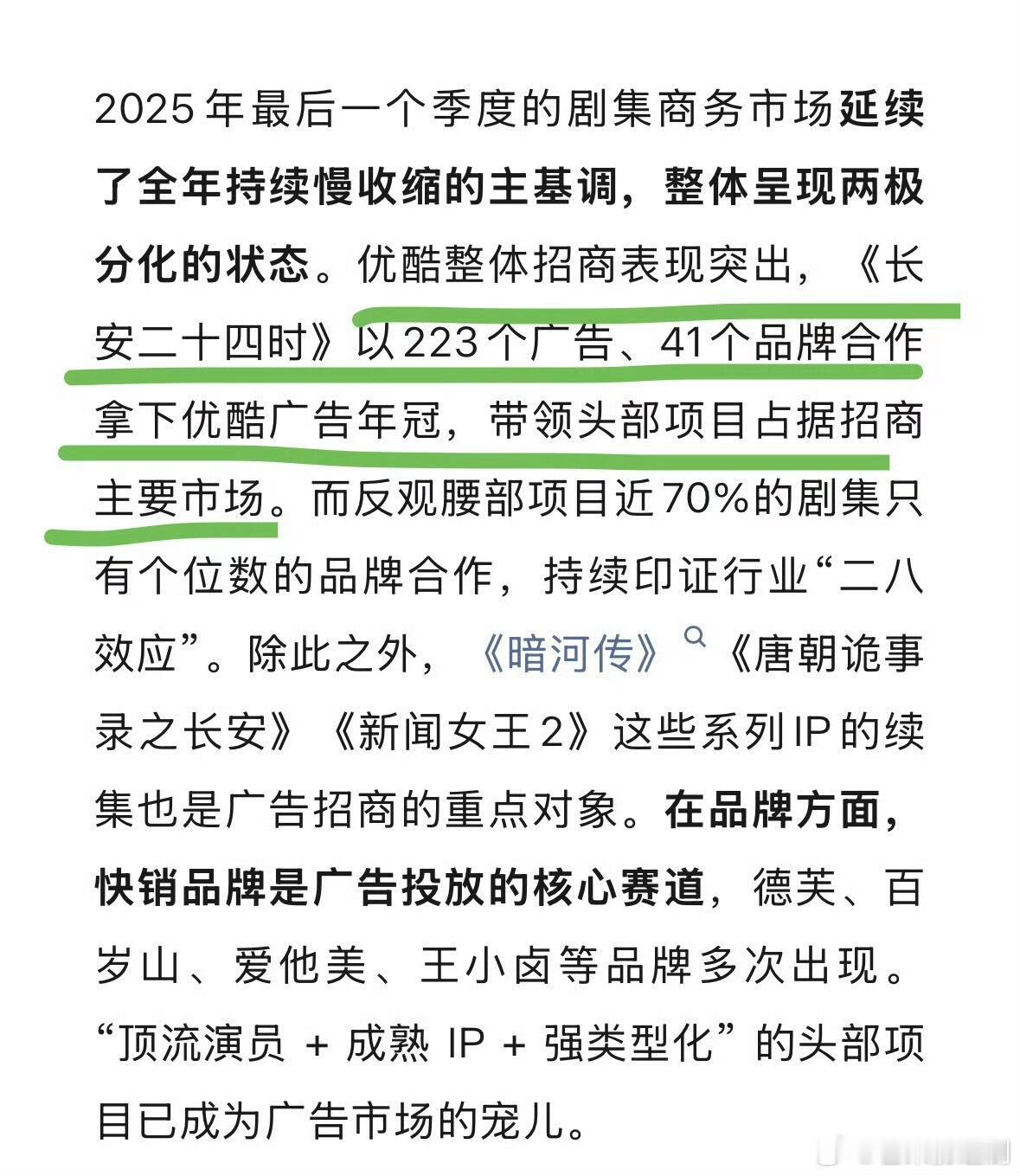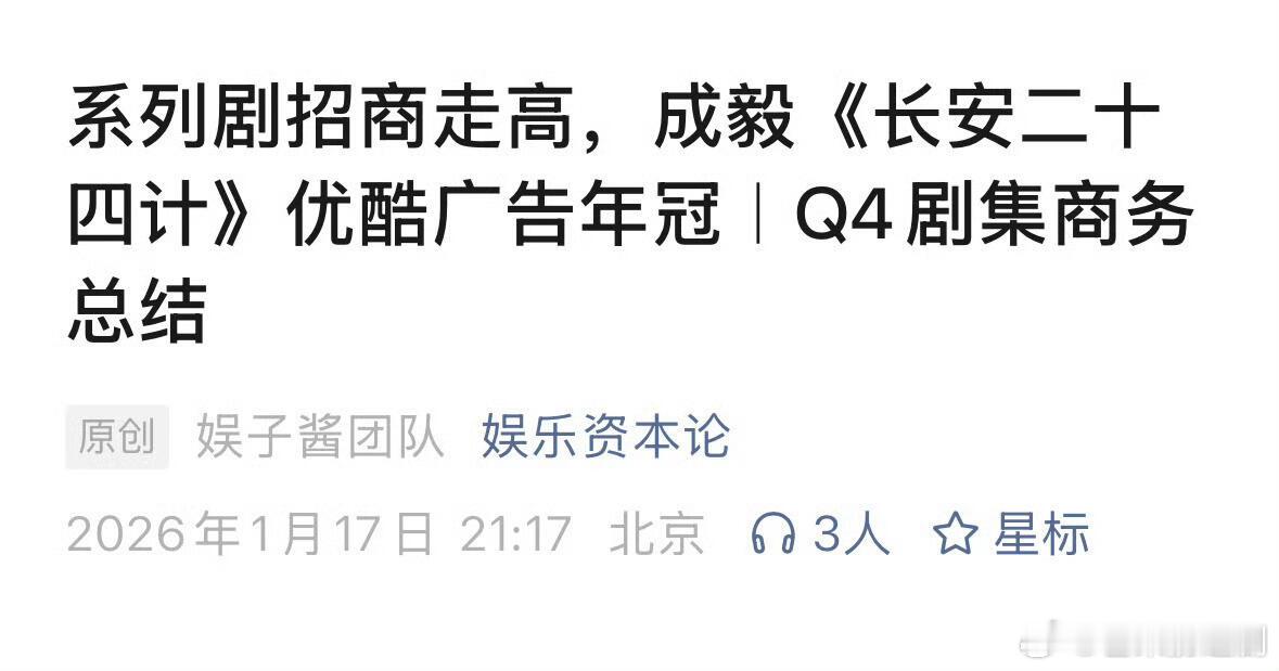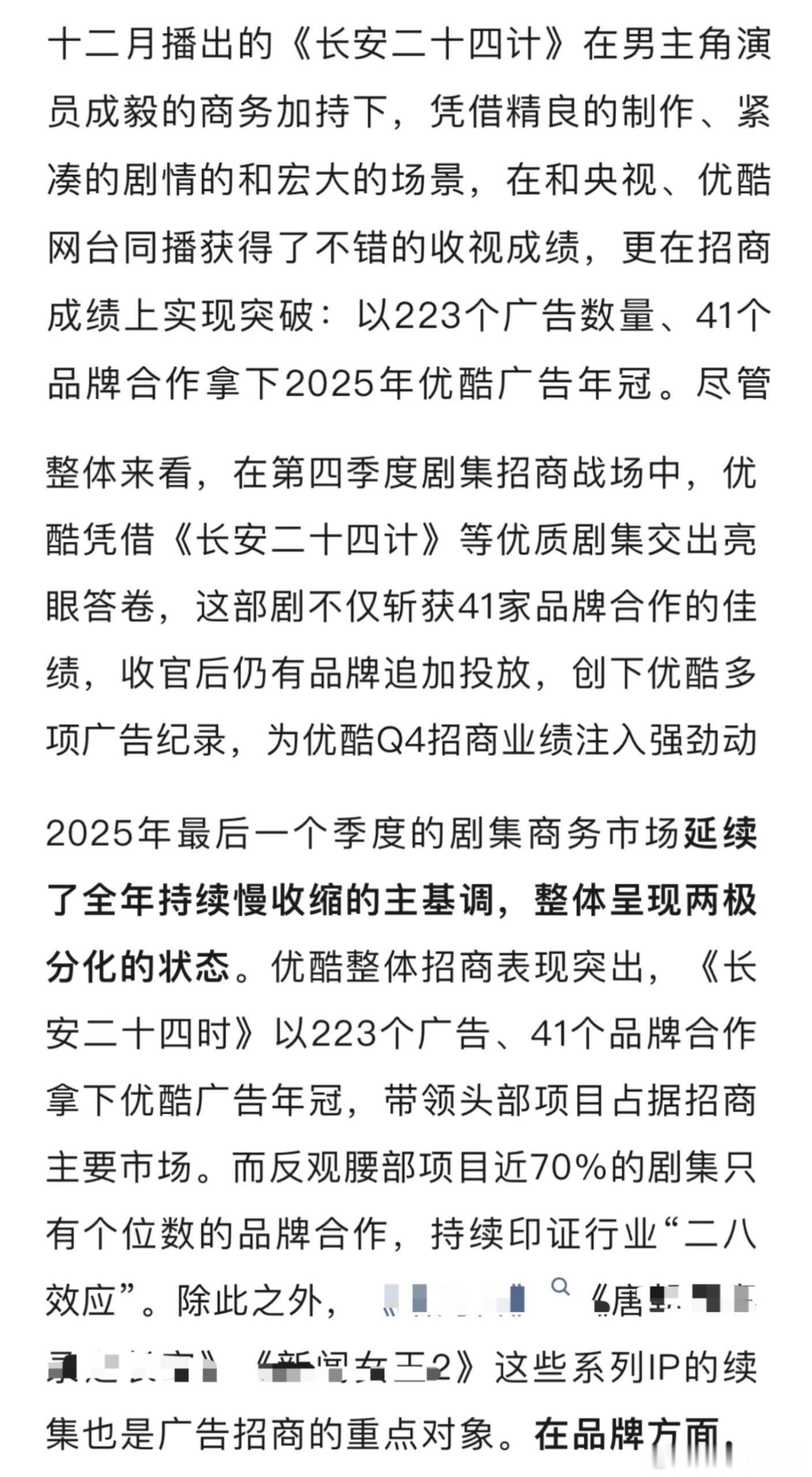 平台认证:成毅《长安二十四计》优酷广告年冠。在这个招商冷档期突围出来,招商断层吸干大盘,成了优酷25年年冠,为优酷第四季度业绩注入强劲动力。业内总结:影视寒冬,招商回归理性的时候,只有强制作➕真头部顶流演员,或者ip的项目,才能在这场 “冷淡期” 突出重围。成毅《长安二十四计》,还是一部原创剧集,是非常成功的行内效应 。