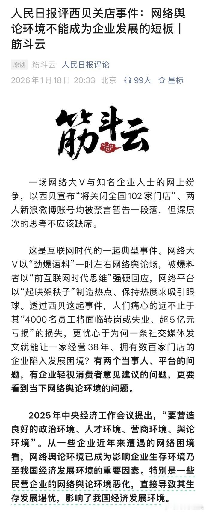 1月18日晚20:30的文章。注意看图,这是什么报,什么级别的文章,代表了高级别的定性。这意思和我前几天说的差不多。贾国龙微博被封,那是保护他,不让他说过头话,把事情搞复杂。但罗永浩犯忌了,危险了。注意文章中的表述:1、特别是一些民营企业的网络舆论环境恶化,直接导致其生存发展堪忧,影响了我国经济发展环境。--这是帽子;2、对企业,当然可以批评,但必须客观理性,对别有用心者必须警惕。--这是对罗永浩的定性;3、有多少民营企业遭遇了网络“黑嘴”、网络水军的造谣抹黑?有多少大V、小号、“自媒体”裹挟民意、游走在红线的边缘?--这是变相承认了贾国龙对罗永浩“网络黑嘴”的评价,然后指出了罗永浩“游走在红线边缘”的危险处境。我估计,罗永浩不只是封微博的问题。微博也可能受到连带处罚。罗永浩昨天说“他赢了”,那是已经预感到事情不妙,给自己一个台阶。否则,以他的风格,能轻易放过贾国龙这一轮回击?当然,贾国龙自己也有问题,他这次找到这拨人也不怎么样。有这样的结果,不是因为他的申诉,而是西贝作为实体经济,造成了客观严重的损失。