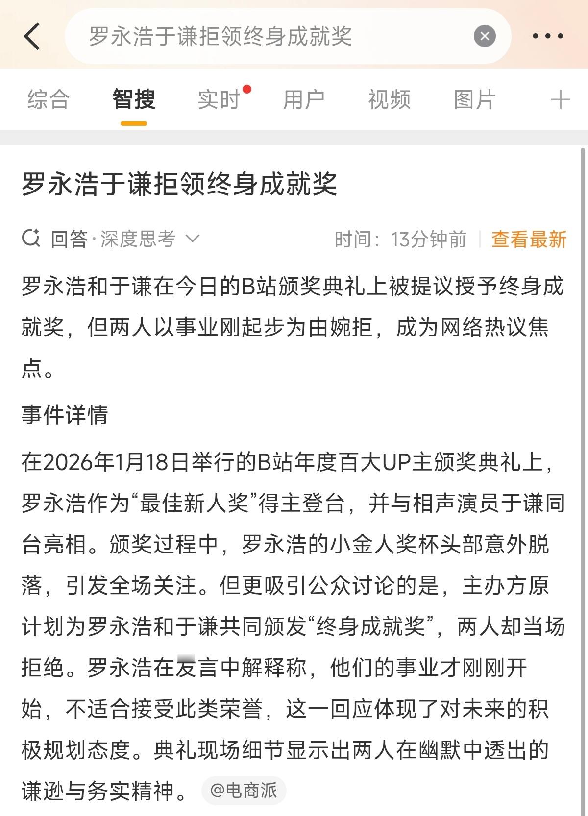 罗永浩于谦拒领终身成就奖罗永浩和于谦在视频领域都很有成就了,虽然他们的B站账号可能刚起步,所以给个终身成就奖也没毛病。但是两人可能想自己的成就不止于此,终身成就奖可以再等等。老张聊科技