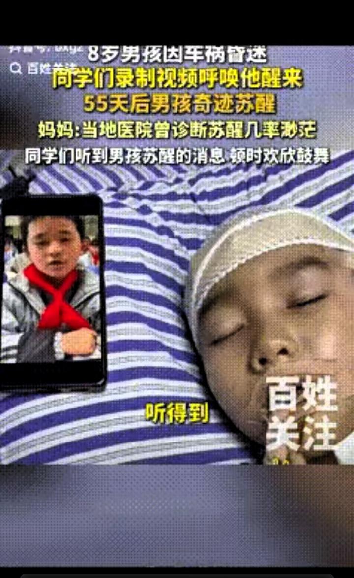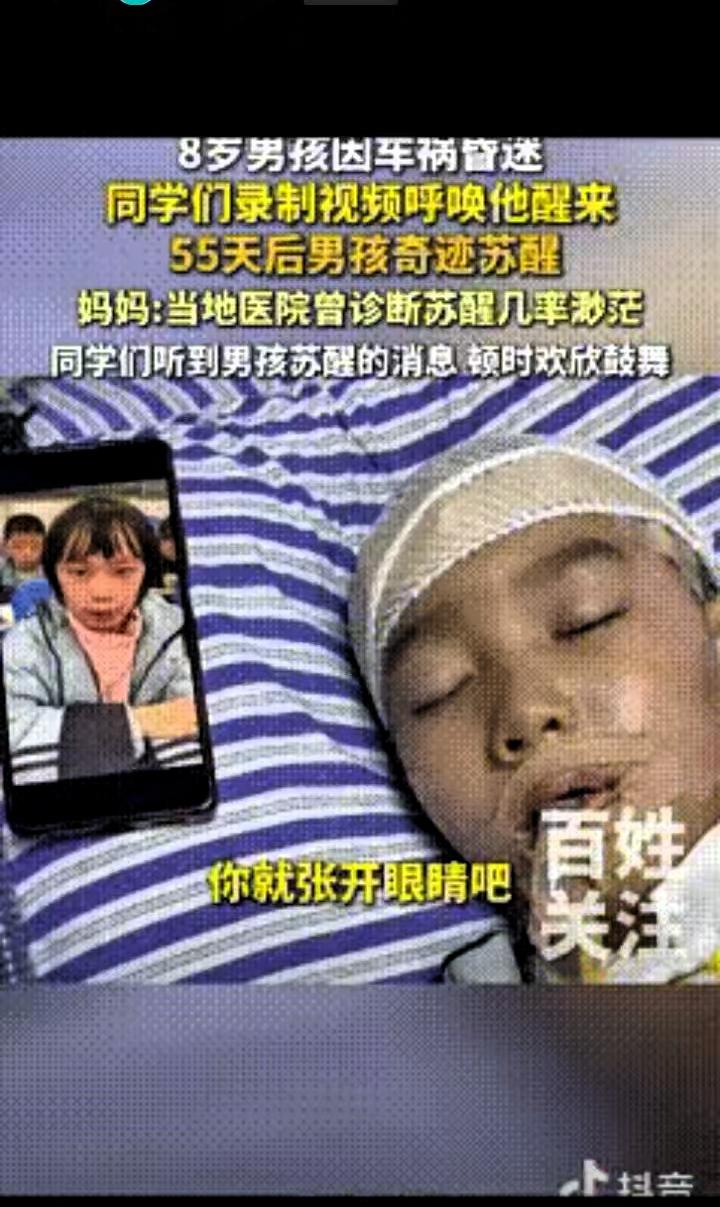 “泪目了!”湖南长沙,一位8岁半的男孩,遭遇车祸后昏迷,醒来的几率微乎其微。 2025年11月22日,楚熙放学过马路时被车撞倒,头部重伤陷入昏迷,医生告知醒来的几率微乎其微。但楚熙爸妈不愿放弃,当即决定转院到湘雅医院,哪怕只有一丝机会也要争取。 到了湘雅,楚熙直接住进ICU,全身插满管子。楚熙妈妈在病房门口支起折叠床,日夜守着,一天都没离开。她每天对着病房里的孩子说话,讲他小时候的趣事,读他喜欢的绘本,哪怕孩子没有一点反应,她也从没停下。 后来医生建议试试听觉刺激,用熟悉的声音唤醒孩子的大脑。楚熙妈妈立刻联系学校老师,收集了上课铃、广播操的音乐,班上同学也纷纷录了音视频。有人说“楚熙快回来,体育课没人陪我打球”,有人说“你的座位一直给你留着”,这些声音被装进播放器,24小时不间断循环播放。 跨年夜那天,有同学远程发来一首歌,播放器响起时,楚熙的脑电波有了波动,眼皮动了动,还短暂睁开了眼睛,这是他55天里第一次有明显反应。 之后楚熙的变化越来越明显,听到同学的声音,他会微微扬嘴角,手指会动,头还会朝着声音的方向转。医生说,是这些熟悉的声音和爱意,推动了孩子大脑的恢复。 1月17日上午,湘雅医院病房里,楚熙轻轻喊出了“妈妈”。声音很轻,却让守了55天的妈妈当场失声痛哭。 如今楚熙已经能认出家人,正在进行康复训练,说话和走路都要慢慢重新学。学校也在等着他康复归来,全班同学准备一起迎接他。 其实哪有那么多奇迹,医学数据之外,家人的不放弃、亲友的惦念,才是支撑一个人闯过难关的底气。冰冷的仪器测不出爱的温度,但爱能创造意想不到的转机。
