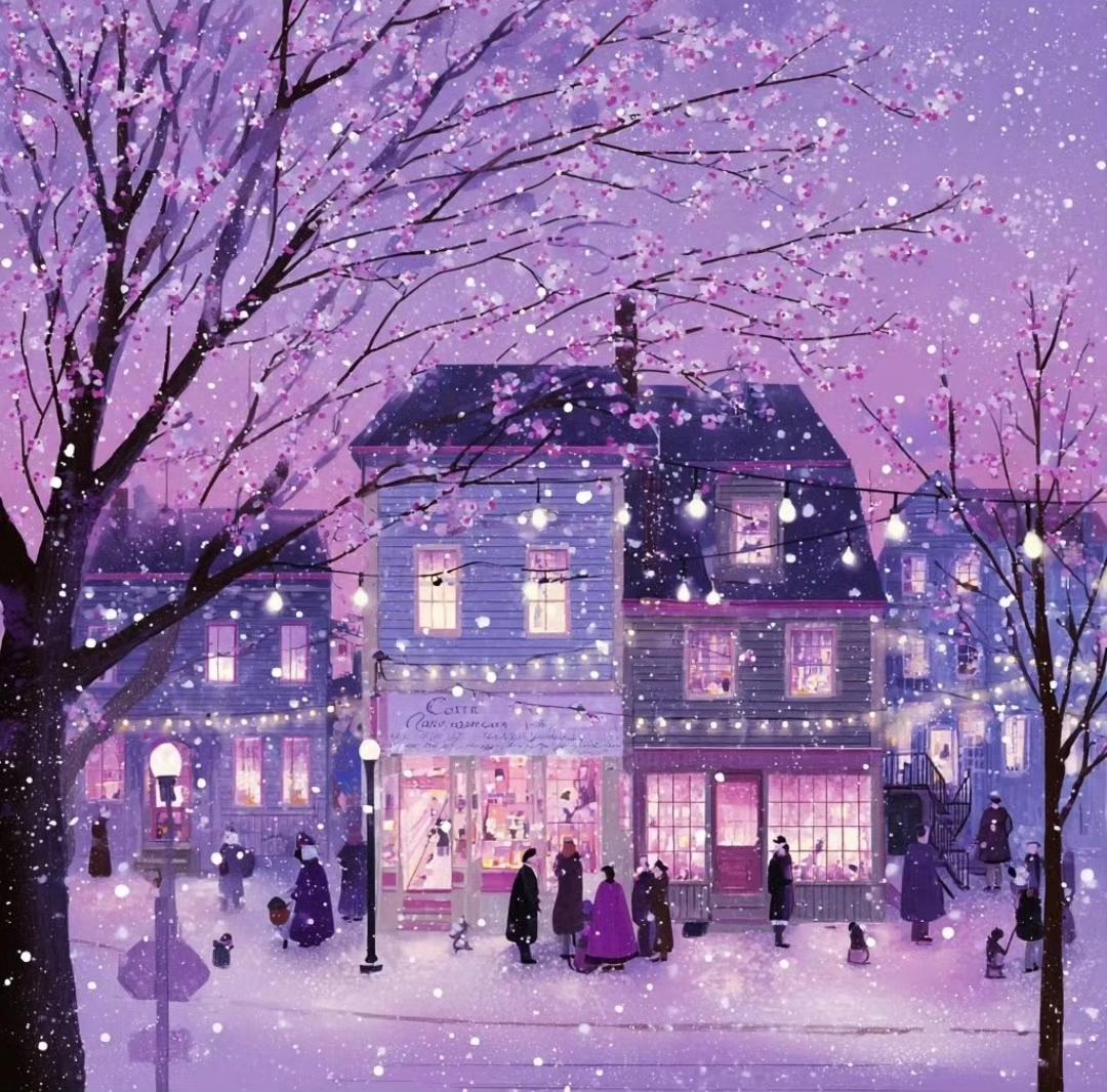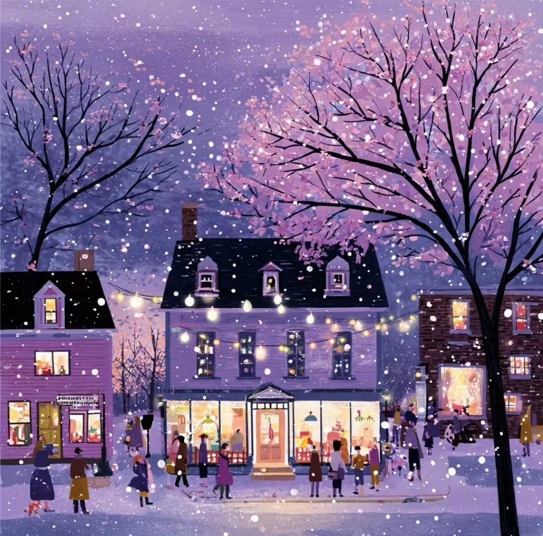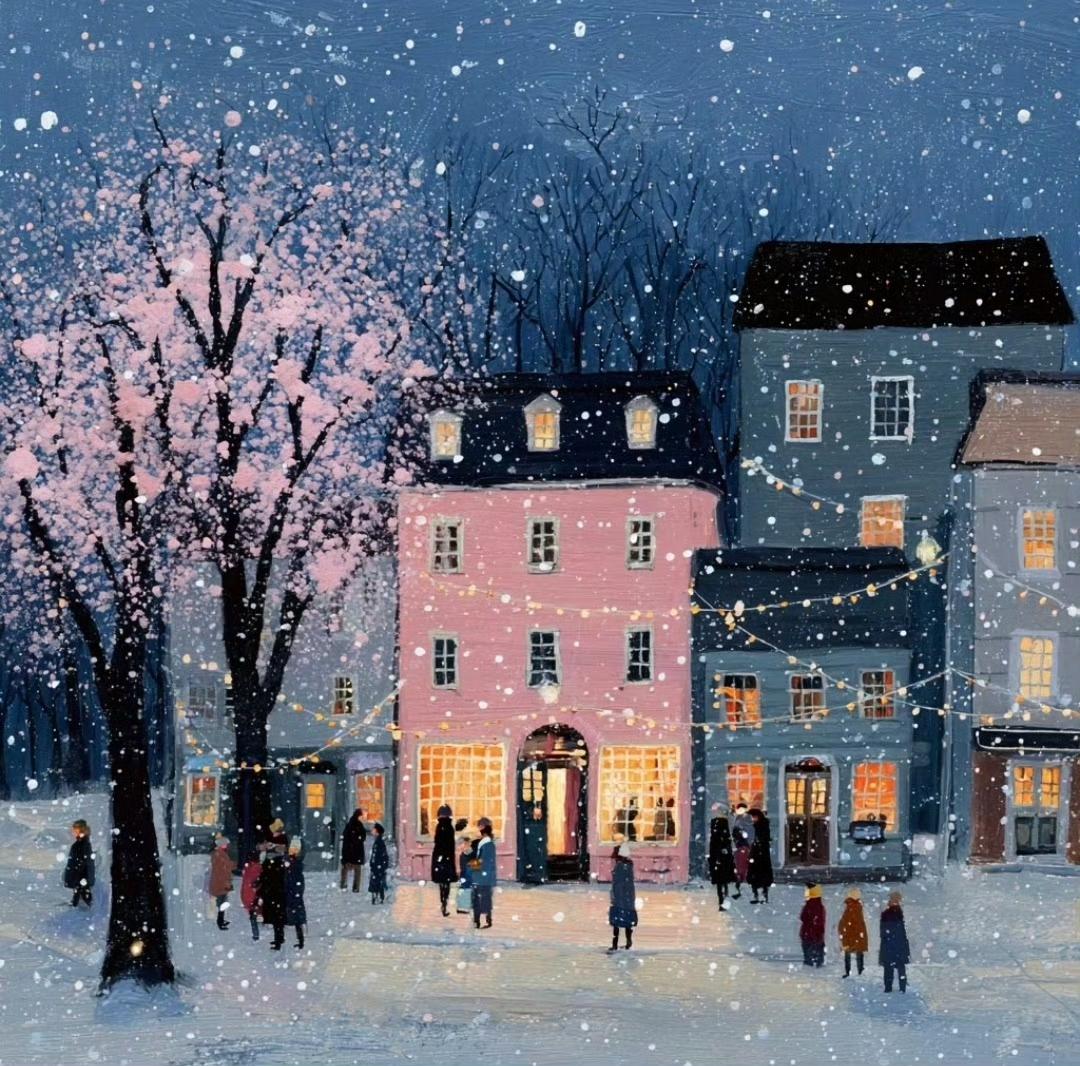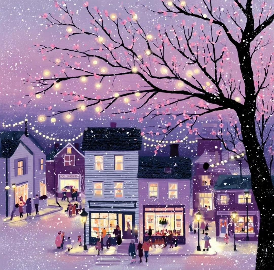 雪夜小镇,街灯下的温暖与浪漫…绘画艺术