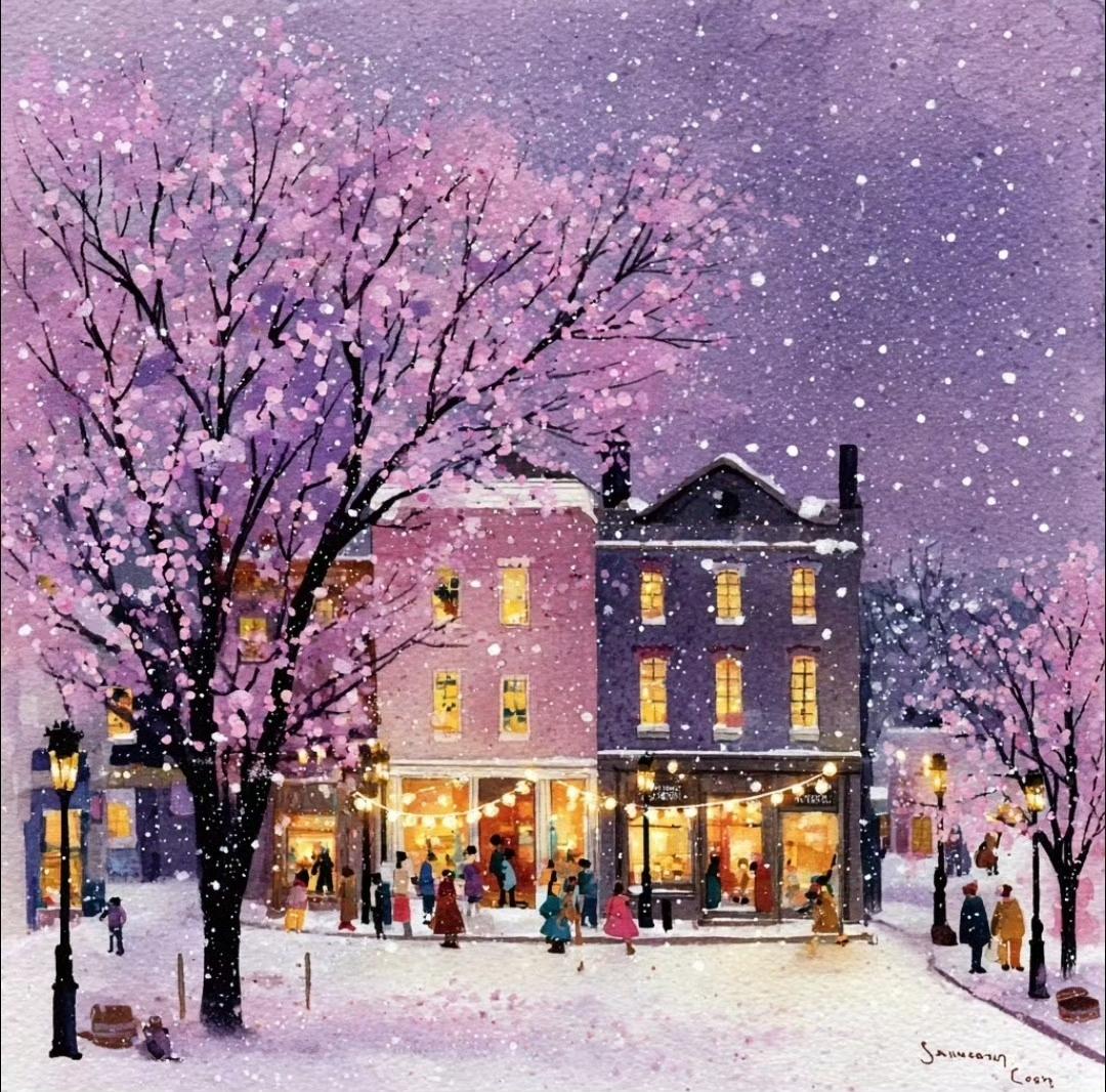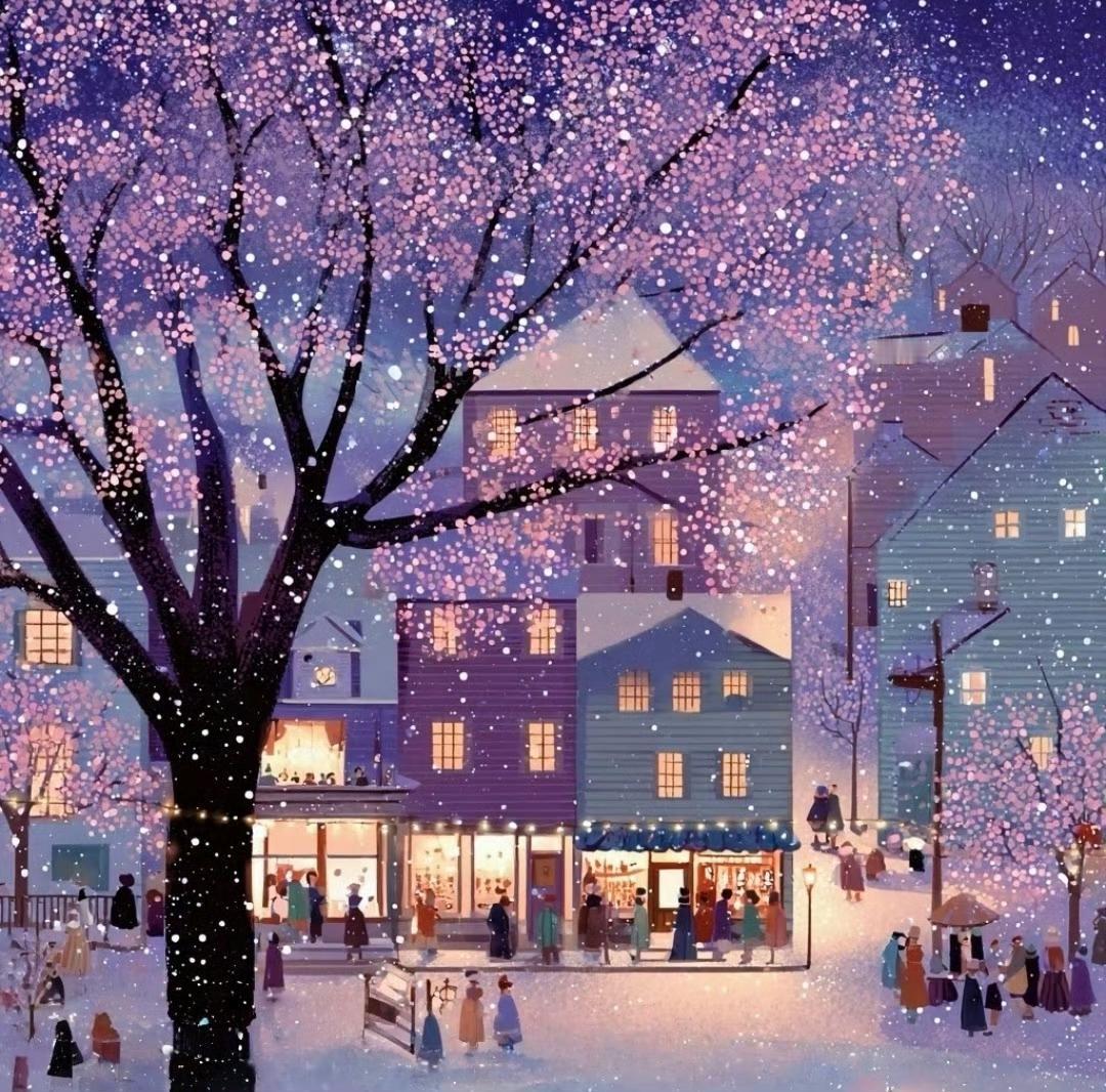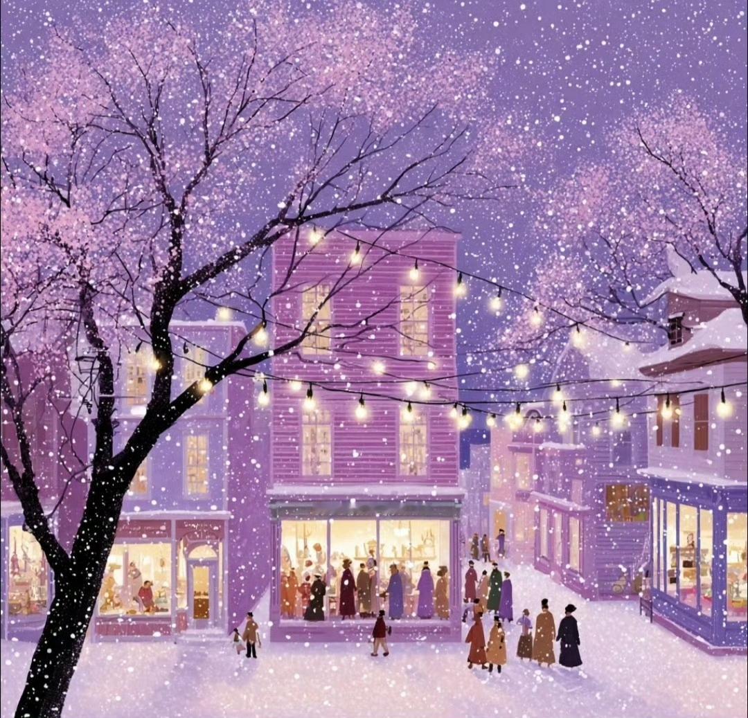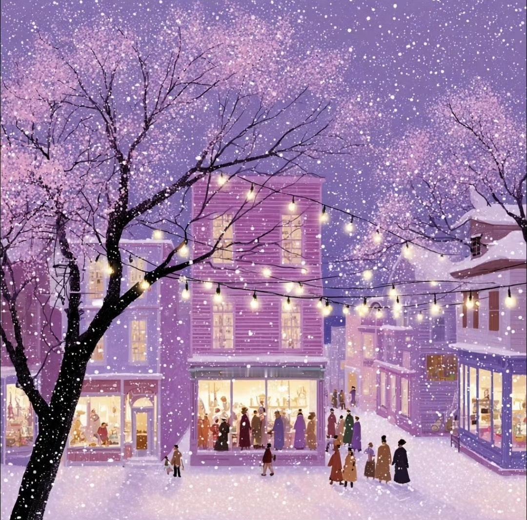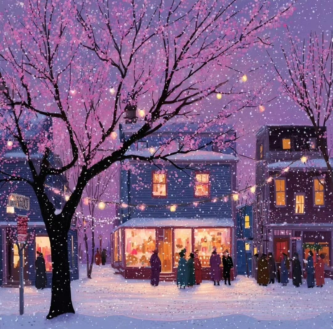 雪夜小镇,街灯下的温暖与浪漫…绘画艺术