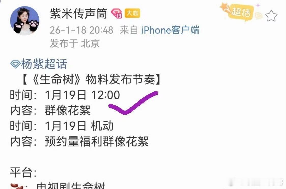生命树发布节奏杨紫对接发布《生命树》的物料发布节奏,会有群像花絮,已经开始预热了
