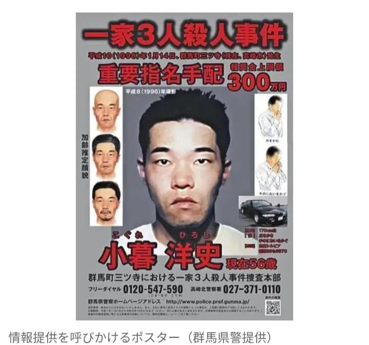 头一次听说人类的牙齿特征是用于刑事犯罪分子个人识别的重要信息。 据日媒报道称,群马町(现群马县高崎市)发生的1998年三口之家被杀事件,到14日已过去28年。县警为了防止案件被遗忘,并希望能引导新的信息提供,首次公开了涉嫌谋杀的前卡车司机小暮洋史(56岁)的牙科治疗记录。 从12日起在县警官方网站上公开的,是小暮嫌疑人1995年的牙齿图表。特点是左后牙缺损,同时显示了补牙和牙冠的位置。县警表示,牙齿特征是用于个人识别的重要信息,目的是希望引导公众在小暮嫌疑人接受治疗时进行通报等。 小暮嫌疑人涉嫌于1998年1月14日,闯入了自己单方面倾慕的三ツ寺的一名女性住处,杀害了女性的父母和祖母共三人。 县警以53人的体制持续调查,自1998年至去年底,共收到信息提供合计3777件。12日在高崎市的高崎永旺购物中心,还向公众发放了贴有根据想象绘制的当前小暮嫌疑人画像的纸巾等。